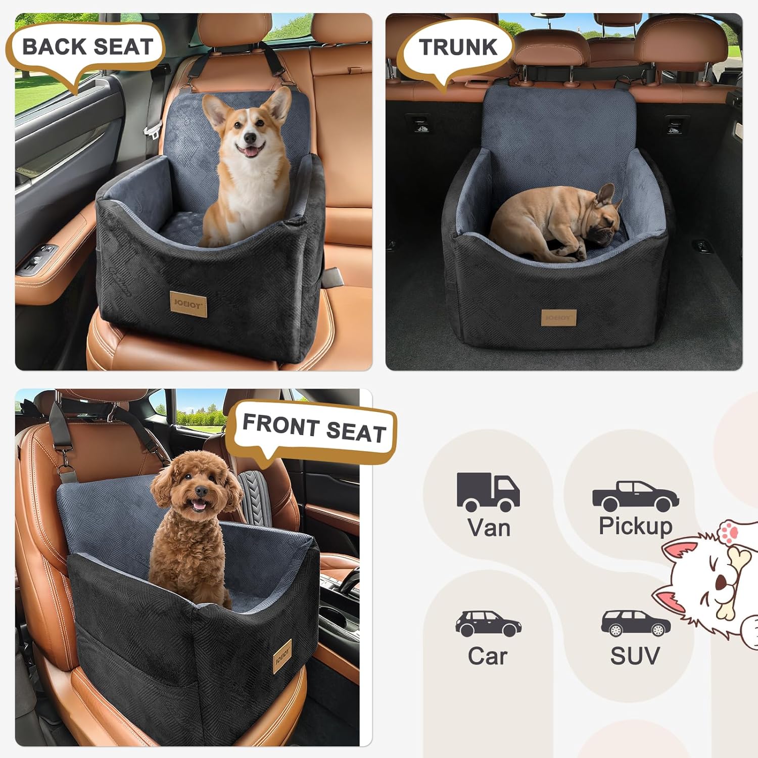 About this item 【Elevated Design, Perfect View】: Boost your pet up by 5 inches, so they can enjoy the scenery outside the window. Whether it's a quick errand or a long road trip, this dog booster seat keeps your pup entertained and reduces their anxiety, making every trip a breeze. The high-density memory foam filling delivers superior support, minimizing the impact of road bumps and vibrations for a smoother, more enjoyable ride for your pet. Your dog will love the added comfort and feel more at ease in the car. 【Secure and Stable Design】: This pet car seat features a built-in adjustable safety belts to secure your dog’s harness, preventing them from jumping out the window. This design prevents the seat from shifting, ensuring a safe and comfortable journey for your furry friend. 【Ideal Size for Small and Medium dogs】: This dog car seat measures 19 in (L) X 18 in (W) X 18.5 in (H), providing ample space for up to two small puppies or one medium-sized dog weighing under 35 lbs. It fits in the front or back seats of cars, SUVs and trucks. WARM TIP: Please measure your pet before purchasing. Refer to the provided picture for specific size details. 【Comfort with Dual-Sided Design】: The two-sided design of this dog car seat features soft, short plush fabric on one side and breathable, comfort-enhancing faux leather on the other. This dual-material design ensures your furry friend stays cool in the summer and warm in the winter, providing year-round comfort. 【Multi-scene Use 】: The JOEJOY dog car bed is not only perfect for car rides but also doubles as a cozy bed for your dog. Its portable design allows you to easily bring it anywhere-whether it's in the car, at home, or outdoors. It features large capacity storage side pockets on both sides, providing a convenient spot to store doggy snacks, puppy kibble, and other essentials. 【Easy Installation and Maintenance】: Setting up your JOEJOY dog booster seat is a breeze. Simply thread the car seat belt through the designated holes on the bottom and secure the top strap to the car headrest. Adjust the straps to the right length, and the car seat is ready to go! The removable cover is easy to unzip, making it simple to wash and keep your dog's car seat clean. › See more product details