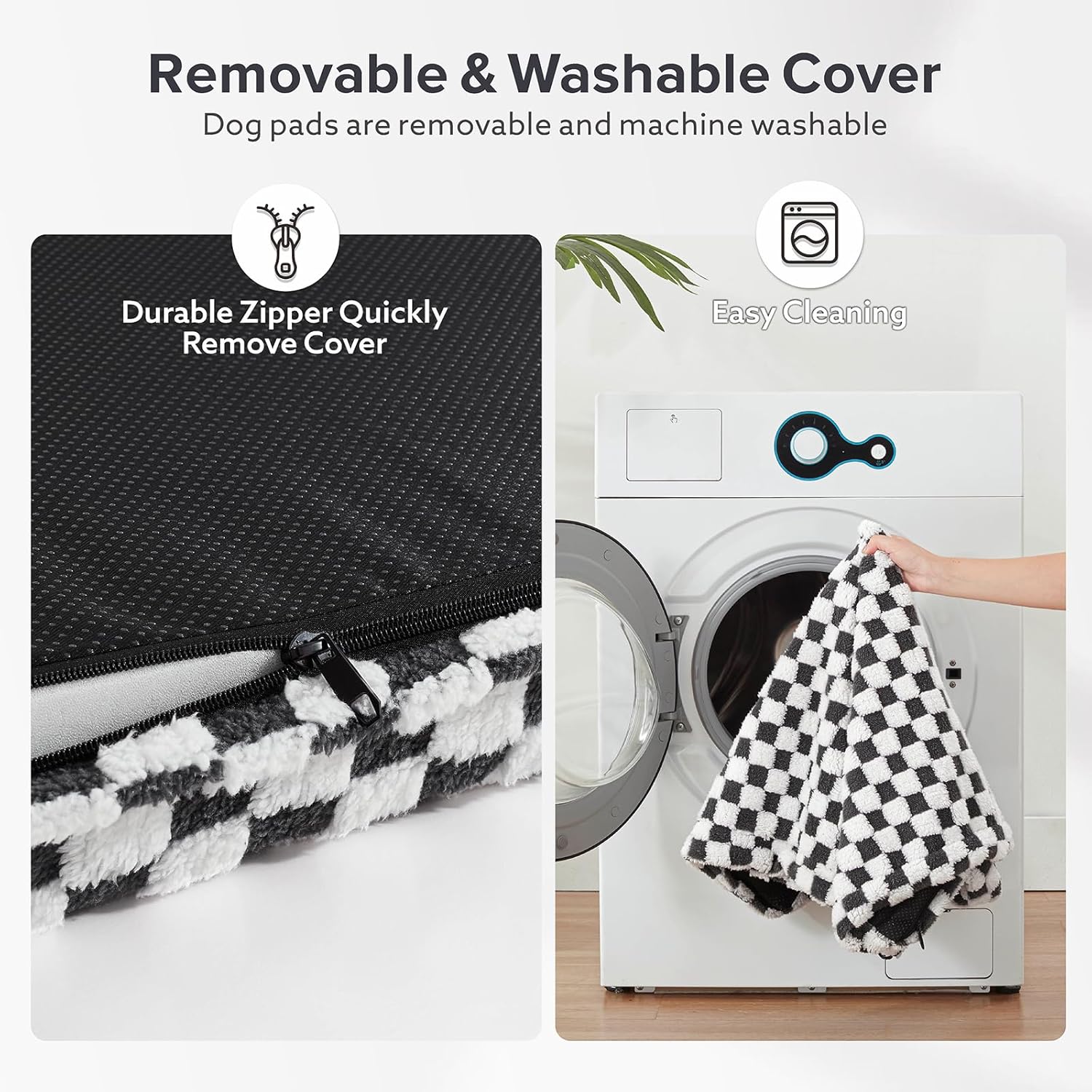 About this item --Our dog bed features a plush Sherpa top and non-slip bottom to provide dogs with extra comfort and security. The special and cute modern plaid pattern design is more in line with zoology, providing a calming and anxiety-reducing effect and offering your furry friend an ideal resting place. --The large dog bed is equipped with a 11-inch thick high-density egg crate foam , which helps evenly distribute the weight of our dogs, providing powerful skeletal and joint support for our dogs to effectively relieve joint pain and arthritis , encouraging deep and peaceful sleep. --This extra large dog bed is equipped with high-quality L-shaped zippers, featuring a removable and washable cover. This not only makes it convenient for pet owners to clean, but also creates a cleaner for your pet. (Note: Foam cannot be washed) --Upgrade your pet's sleeping area with our stylish dog mattress, available in a variety of adorable patterns. The dog bed can be used as a dog cage, dog pillow, dog mattress, or placed in crates and pet houses, and even serve as a dog travel bed in your car or truck. The big dog bed is a fashionable home decor item, making the perfect gift for pet enthusiasts, or as a birthday present for your baby cats and dogs. --The size of this dog crate bed is 47"L x 29"W x 3"H, suitable for dogs up to 100 lbs. It is arriving as a vacuum-packed bed in a box, please let it lay flat for up to 12 hours after opening to reach optimal condition. If you have any questions about the product, please contact us, and we will give you a satisfactory solution within 24 hours. › See more product details