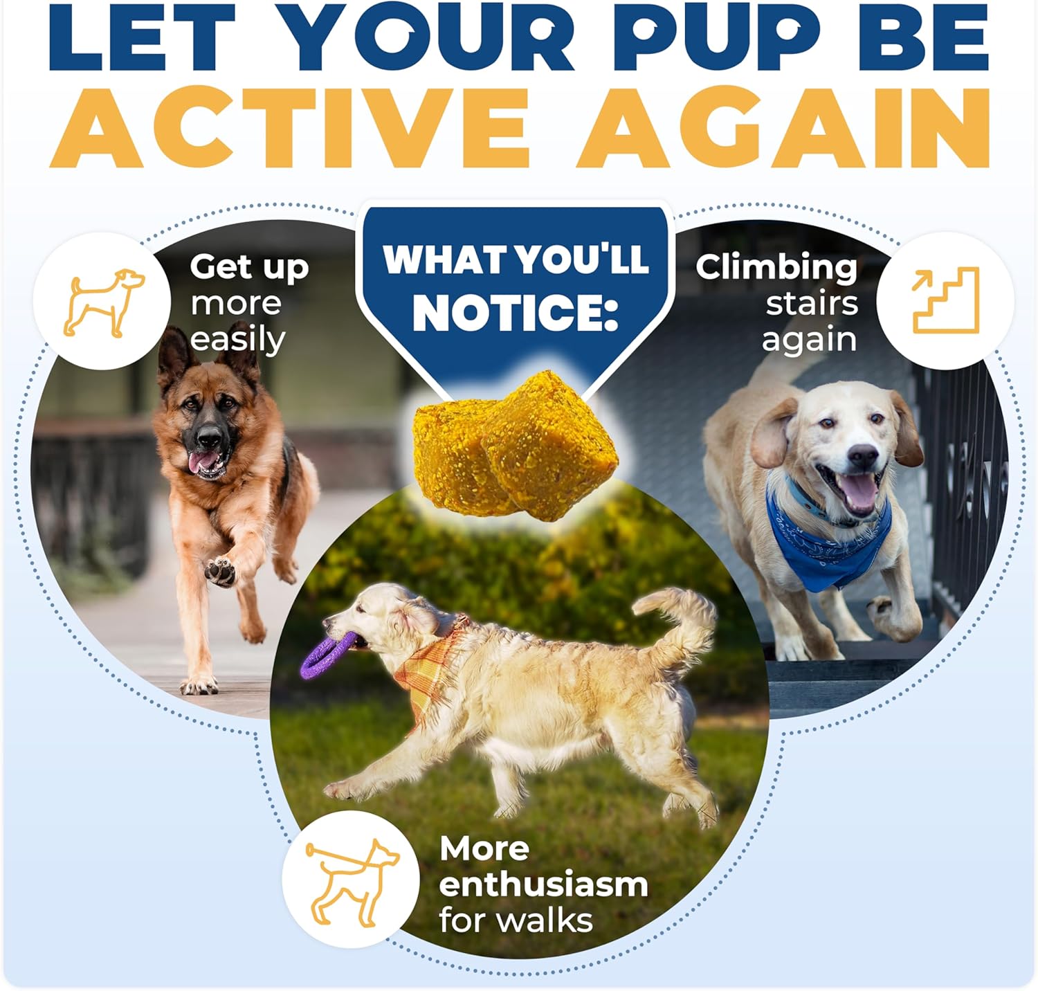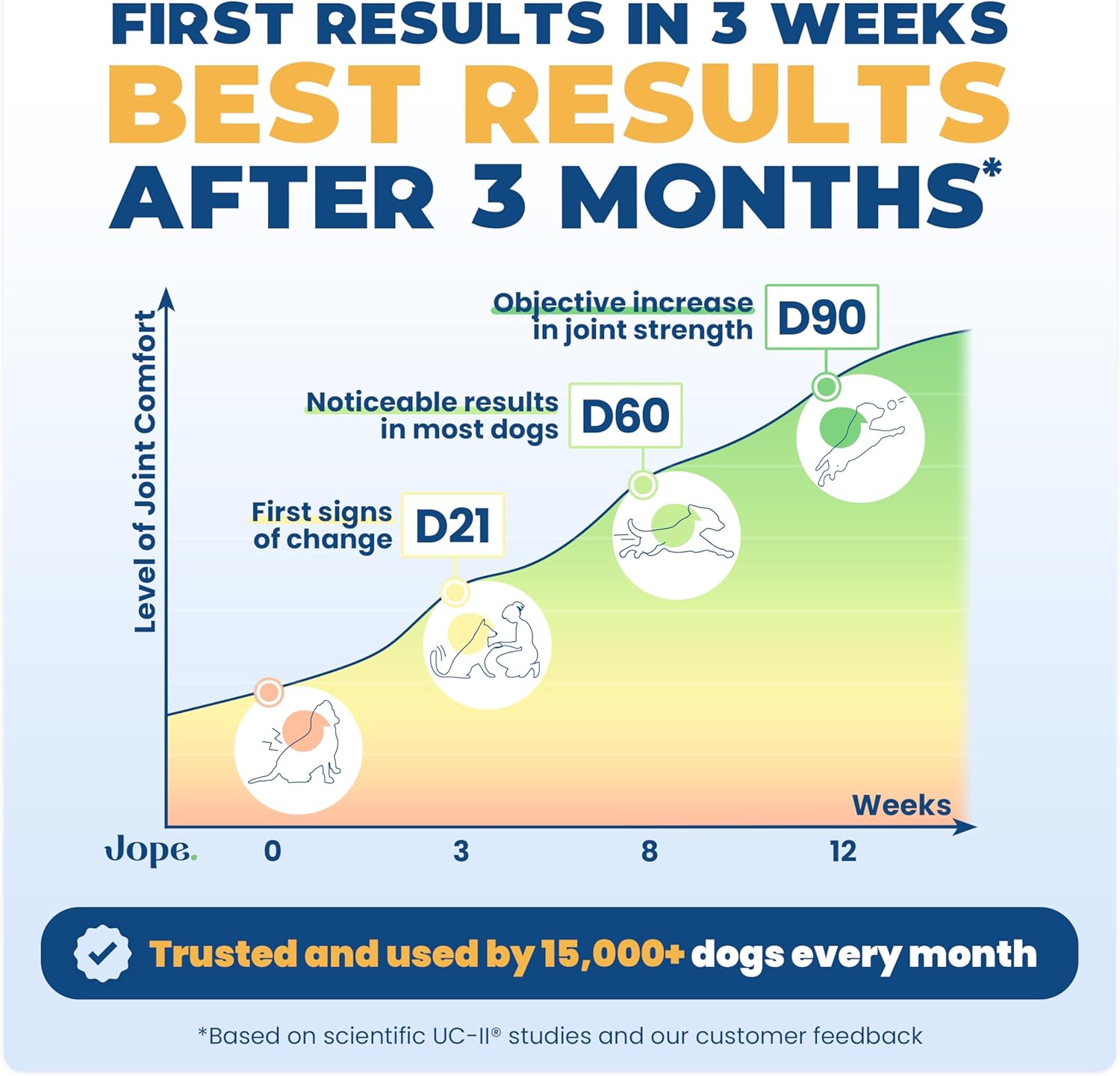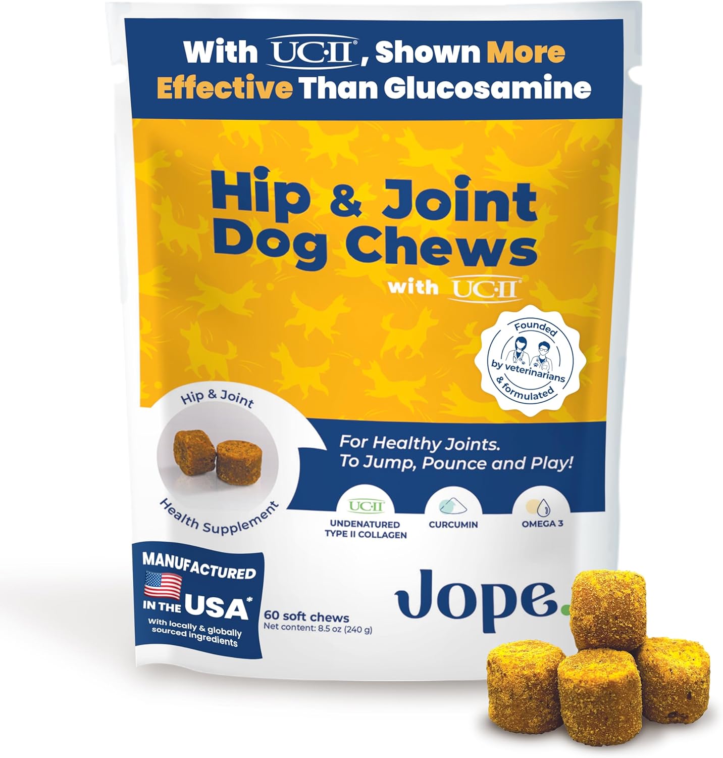 About this item CLINICALLY PROVEN UC-II: Using the patented UC-II type II collagen has been shown to be 59% more effective than glucosamine and chondroitin for effectively supporting joint health, helps with comfort, and promote better cartilage health. VISIBLE RESULTS in JUST 3 WEEKS: Dog parents can report noticeable changes in occasional stiffness and joint comfort within three weeks; continued mobility improvement and support with daily use for up to five months of our joint supplement for dogs. VETERINARIAN MADE FORMULA: Jope's unique formula is made by professional veterinarians and supported by veterinarians with therapeutic-level ingredients that can effectively help improve joint related issues as a senior dog joint supplement. POTENT OMEGA 3 & CURCUMIN BLEND: Each hip and joint dog treats deliver 200 mg Omega 3 fatty acids, including 98 mg of EPA and DHA, and 50 mg Curcumin relieve inflammation associated with normal daily exercise and activity with cartilage supporting benefits for long-lasting, healthy bones and joints. COLD PRESSED to PRESERVE POTENCY: Our hip and joint chews for dogs are manufactured via cold-press technology that helps maintain and preserve nutrient integrity for effective long long-lasting results to provide dog joints effective support. MADE in USA & THIRD PARTY TESTED: Dog joint chews are crafted in the USA with locally and globally sourced ingredients and third-party tested to ensure safe, ethical formulation, consistent product quality, and ingredient potency. SOFT, TASTY CHEWABLE: Jope's tasty blend is beloved by our customers and is easy to administer, compared to pill or powder options that require mixing with dog food. Reward your dog daily with our dog joint treats to help improve their joint health! IDEAL for MULTIPLE DOG SIZES: Suitable for small, medium, and large breeds alike and perfect for aging pups or performance dogs who may need help to reduce inflammation associated with training and competition. Directions for Use: Dogs 75lbs, 3 daily. › See more product details