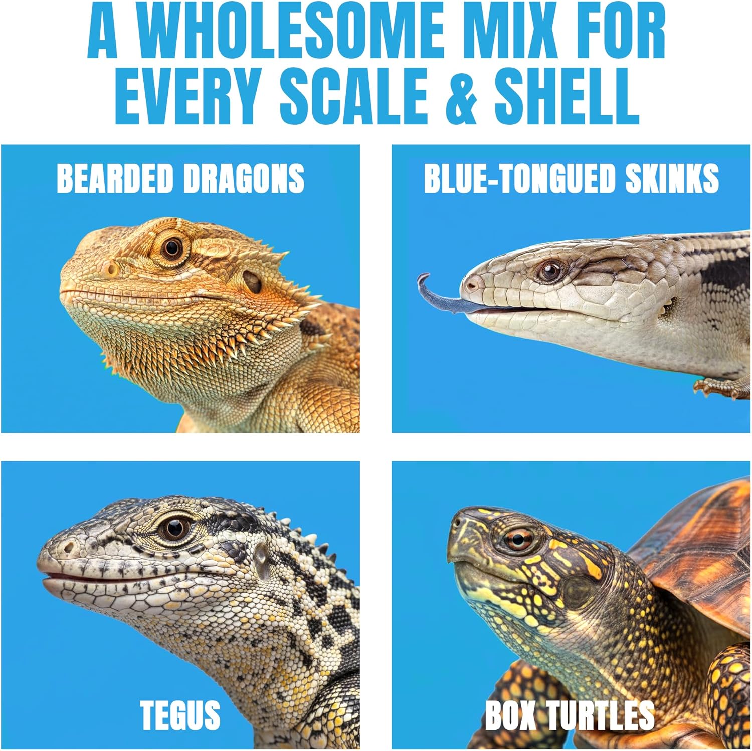 About this item Balanced Mix for Daily Lizard Wellness --- A nutrient-rich blend of sun-dried veggies, freeze-dried fruits, and calcium-coated insects, our Lizard Fruit & Insect Mix helps support digestion, vitality, and bone strength. Supports Reptile's Skin Hydration and Comfort --- Fiber-rich vegetables and fruits help maintain internal moisture, which plays a key role in keeping your reptile's skin soft and comfortable, especially during skin renewal phases. Excellent for Omnivorous Reptiles --- Perfect for box turtles and bearded dragons that enjoy both plants and insects. Serve it on its own or as a tasty topper for picky eaters. Exclusively Made with Real Ingredients --- Each pack contains only whole fruits, vegetables, and insects with no artificial colors, flavors, or additives. Just simple, no synthetic additives, handpicked food product your pets will enjoy. Quick and Simple to Serve --- There is no need to refrigerate or prep. Just scoop it out of the pack or add a little water if your gecko prefers it moist. › See more product details
