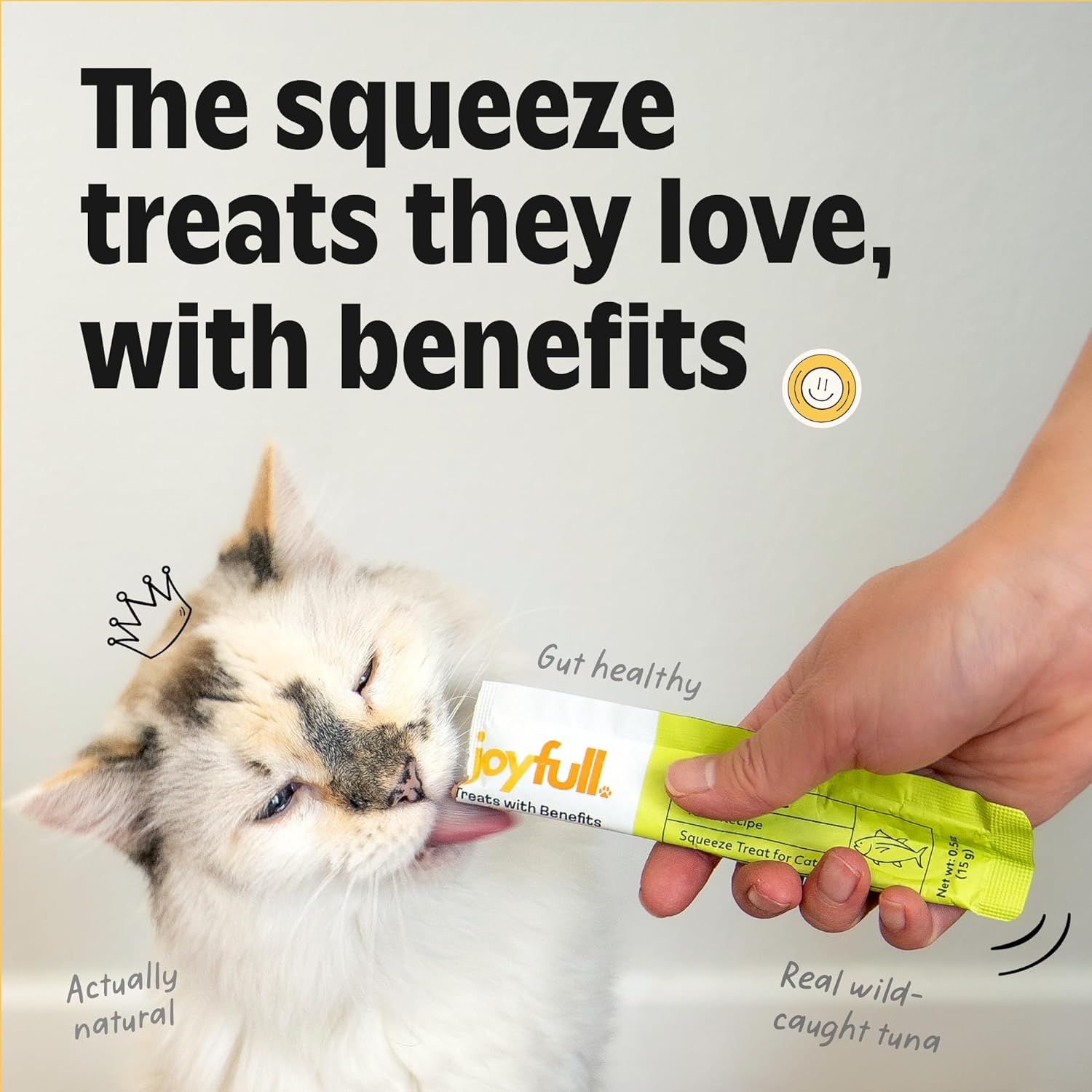 Support your cat’s digestive health with Joyfull Lickable Prebiotic Tuna Treats. Formulated by veterinarians and made with wild-caught tuna, these squeezable treats offer a delicious way to nourish your cat’s gut microbiome. Each convenient 0.5 oz tube contains a smooth, hydrating puree enriched with prebiotics that help feed good gut bacteria, supporting digestion, immunity, and overall feline wellness. Joyfull treats are made with clean, limited ingredients you can trust — no grains, soy, corn, seed oils, artificial colors, flavors, or preservatives. Just real fish broth, tuna, and plant-based fiber sources like inulin and guar gum. With only 7.5 calories per tube, they’re ideal for daily treating without the guilt. Perfect as a topper, training reward, or bonding snack, these easy-to-serve lickable treats are loved by even the pickiest eaters. Whether you're helping your kitty recover from digestive issues or simply supporting everyday gut health, Joyfull makes it easy — and tasty.
