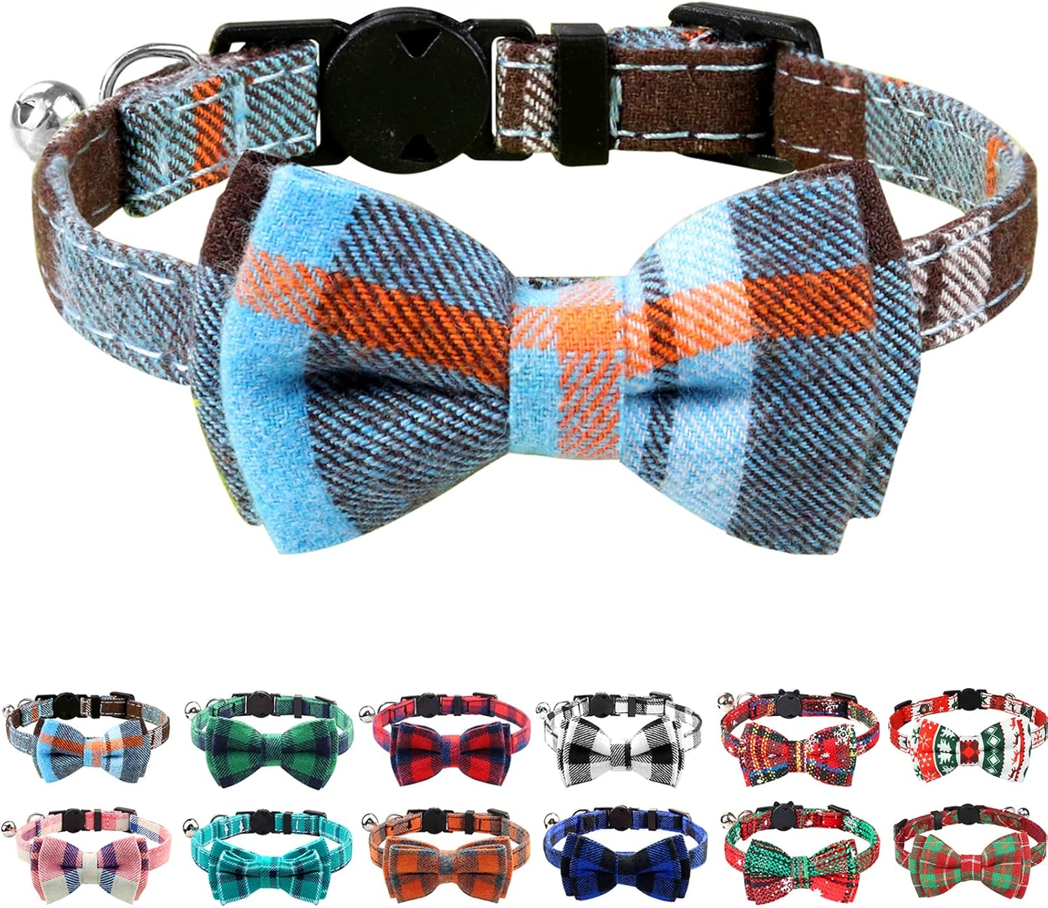 About this item Adjustable: Neck - 7 to 11 inches, Width - 3/8 inch; 100% cotton fabric, soft and comfortable, plaid design makes your adult cat, kitten and puppies adorable Updated Breakaway Buckle: Encountered danger, the safety buckle will be released quickly. Non-sharp edge design further protect the safety of kitties Bow Tie: The bow is tied to the collar with an elastic loop. Removable and Replaceable. Making your male and female kitten eye-catching Bell Accessories: With melodious sound, you will find your sweet baby kitty right now Multiple Colors & Packs: Pink, Red, Green, Blue, Haze Blue, Teal, Orange, Black plaid, Xmas pattern. Suitable for occasions such as daily wear, weddings, birthdays, Halloween, Christmas › See more product details