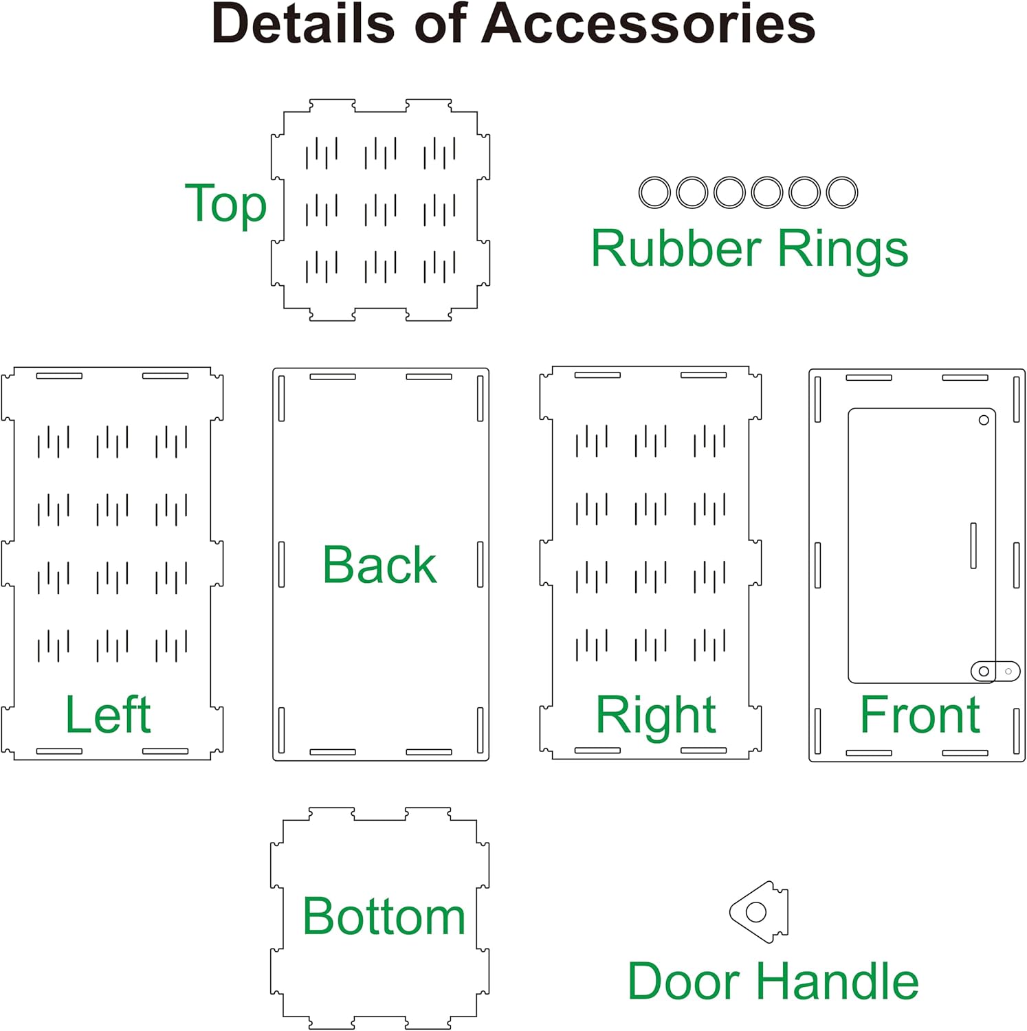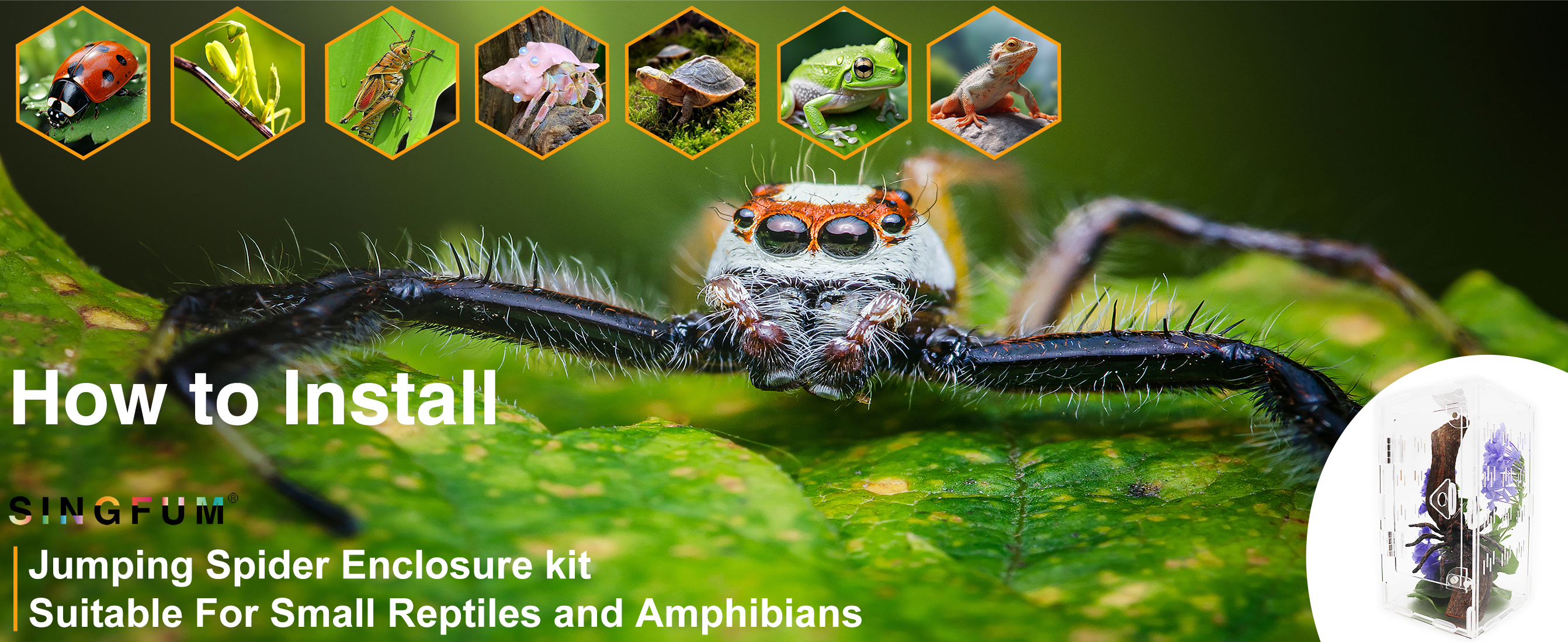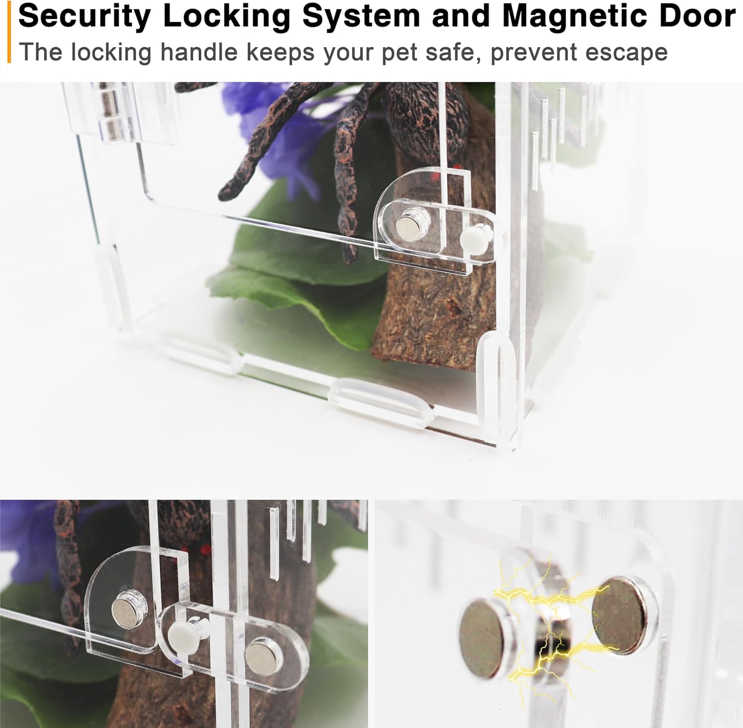About this item Security Locking System and Magnetic Door: The locking handle keeps your pet safe. Our unique magnetic door provide easy access to your pet Smaller and More Ventilation Holes Design: The width of the ventilation hole is only 0.03 inches. We designed smaller and more ventilation holes on the top and sides to ensure both breathability and escape prevention, making acrylic clear cage ideal for micro-sized pets 360 Degree View: Enjoy a stunning view of your pet from all angles with our high-quality high-translucent acrylic terrarium. Metal hinge design, easy to open and close Easy to Install: Acrylic jumping spider enclosure kit requires a simple installation, the rubber bands do well in holding everything together. Praying mantis enclosure is also easy to disassemble when not use for saving storage space. Warm Tip: The Jumping Spider Enclosure Decors are not included Acrylic Reptile Terrarium: Our small reptile enclosure measures 7.87" x 4.33" x 4.13", the internal size is 7.4" x3.93" x 3.85", perfect size for jumping spiders, tarantulas, snail, mantis, lizard, small turtles, frogs, bug, hermit crab and other small reptiles and amphibians, providing a safe and comfortable habitat › See more product details