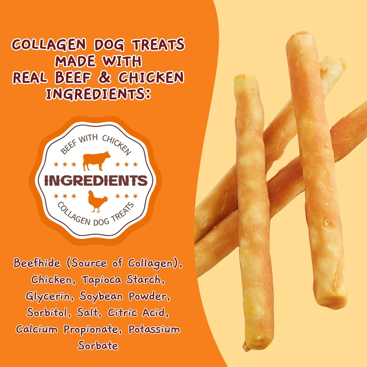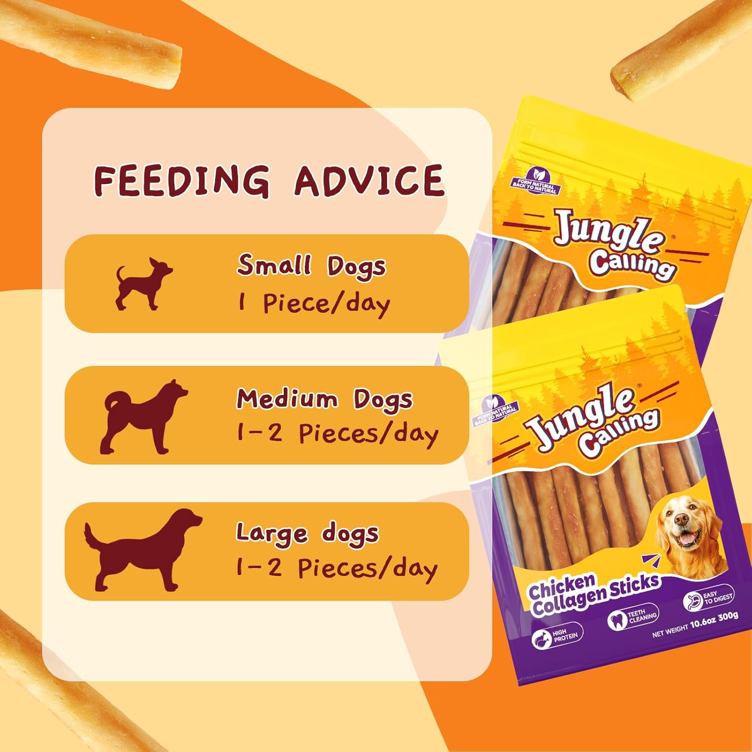 About this item TEETH CLEANING: The chewy texture of our collagen sticks helps clean your dog's teeth and gums, reducing plaque and tartar buildup. These dog chews are perfect for moderate chewers, satisfying their natural instinct to chew while promoting dental health. HIGH PROTEIN: Rich in protein with over 40% content, our dog treats are a nutritious powerhouse. They are an excellent source of collagen, supporting joint health, skin, and coat condition. Made with delicious chicken and beef collagen, they're a tasty snack your furry family members will love. PERFECT TRAINING REWARD: These nutritious and delicious collagen sticks make an ideal reward during training or a motivating fuel for walks. Using them strengthens the bond between you and your dog. NUTRITIOUS SUPPLEMENT: Jungle Calling collagen chews are the perfect supplement to your dog's regular meals. Delicious as well as nutritious, these bully sticks are suitable for small and medium dogs. SAFE FEEDING RECOMMENDATIONS: Choose the appropriate size chew for your dog's chewing style to ensure a satisfying and long-lasting experience. Always supervise your dog while they enjoy any treat or chew. Remove any large, swallowable pieces to prevent blockages and provide fresh drinking water to aid digestion. › See more product details