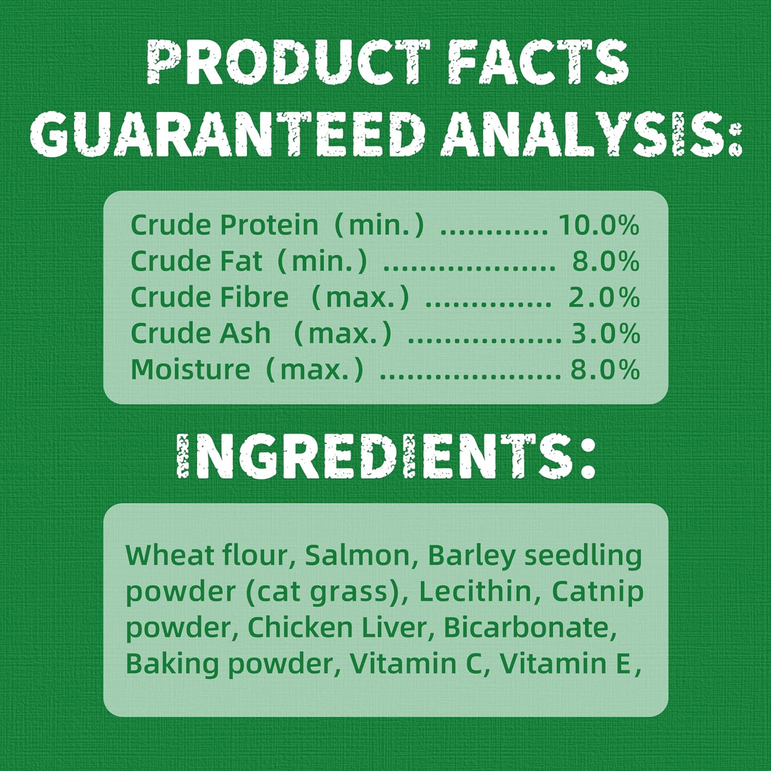 About this item Healthy cat treats: Cat grass biscuits are made with salmon and catnip. This cat hairball remedy is a healthy and natural cat snack. Cats love the taste of catnip and salmon. Helps reduce & manage hairballs: Cat hairball treats for hairball control help remove existing hairballs, prevent the formation of new ones by promoting healthy digestion, and support overall digestive health. Suitable for All Cats: With less than 1.3 calories per treat, these hairball treatment for cats are perfect for cats of all ages and sizes.Especially kittens, they will love interacting with you. Teeth Cleaning Treats: As cat dental treats, crunchy texture and catnip can help clean teeth, reduce tartar buildup and freshen breath for cats. Training & Rewards: Fish shape cat biscuits can help train your cat as training rewards, your cat will devour these cat snacks and their delectable dual-texture Convenient Stay Fresh Jar: The resealable tub of cat grass for indoor cats makes for easy treating and maintains freshness. Keep cat’s paws off when you're not watching. › See more product details