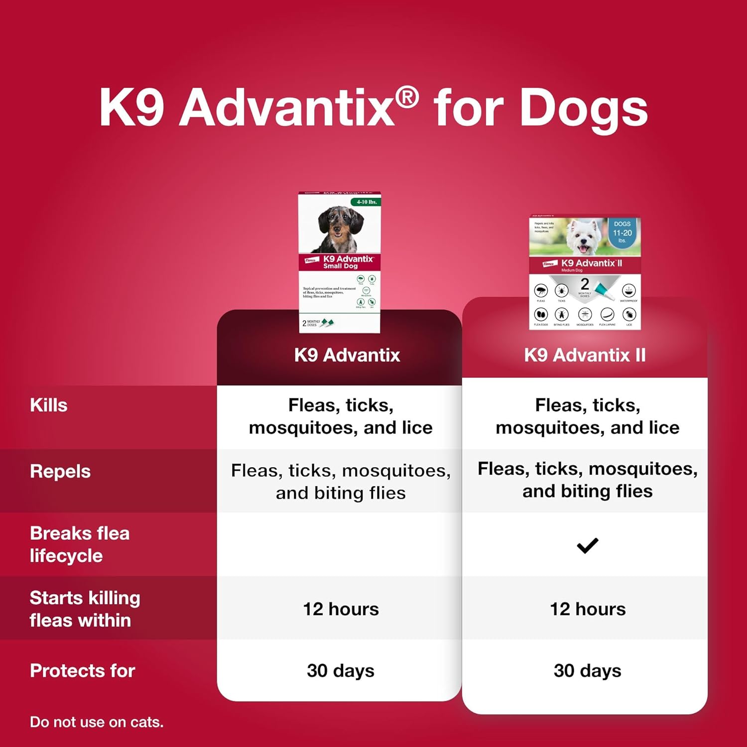 About this item The information below is per-pack only Works through contact, so fleas, ticks and mosquitoes do not have to bite your dog to die K9 Advantix Small Dog 30-day treatment & prevention protects dogs 4-10 lbs. from fleas, ticks, mosquitoes, biting flies, and lice Affordable formula works on contact to kill and repel fleas on dogs within 12 hours of application even without a bite Easy-to-apply topical treatment is fragrance-free and waterproof after 24 hours No prescription needed › See more product details