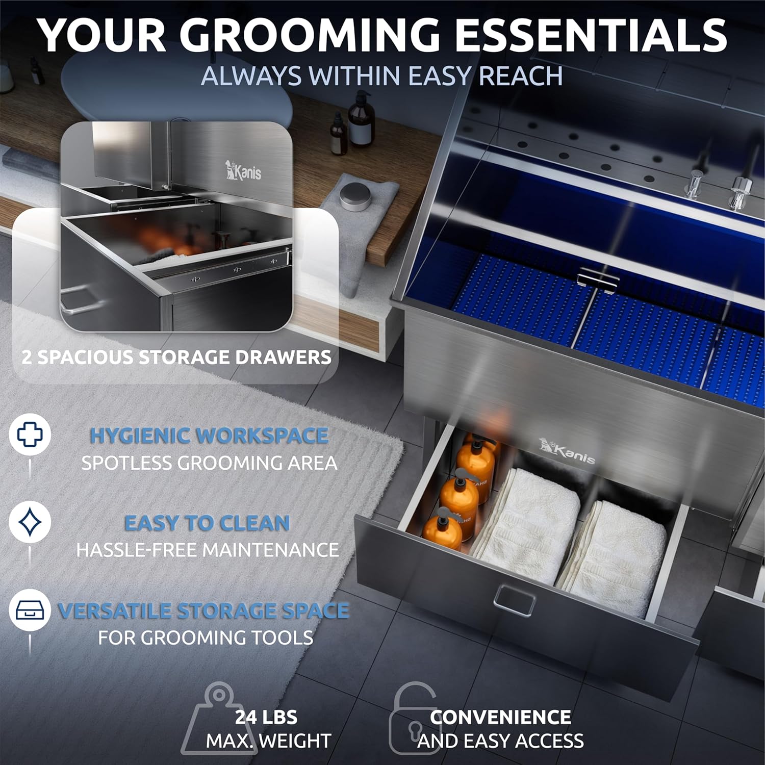 50" - 2 DRAWERS - RIGHT RAMP UTILITY & GROOMING STATION: KANIS presents a versatile dog bathtub designed for both pet washing and household cleaning tasks. Perfect addition and easy to install in any grooming salon, utility room, laundry, garage, or mudroom RUST-RESISTANT 304 STAINLESS STEEL: Crafted from high-quality material and fully welded, our dog bathing station is leak-proof and corrosion-resistant. The sturdy frame with leveling rubber feet makes it the perfect dog wash station for large dogs SMART BATHING SYSTEM: Simplify your grooming routine with a telescopic ramp-door, two-piece floor grate, storage drawers, pet grooming faucet with pull-out dog wash sprayer, shampoo dispenser, and drain kit SAFE ACCESS RAMP FOR SENIORS & LARGE BREEDS: A non-slip ramp with low-entry height helps reduce joint stress, lower impact, and prevent injuries providing comfortable access for older dogs and large breeds. A stress-free dog bath station solution SPACE-SAVING ENTRY DESIGN: The foldable ramp glides in and out smoothly with minimal effort. The watertight door seal prevents leaks, while the user-friendly, compact dog bath tub design ensures easy open-close use and space efficiency ADJUSTABLE FLOOR GRATE: The 3-level customizable working height supports a healthy posture, reducing back strain and shoulder fatigue during grooming sessions. Adjust the dog grooming tub to match your posture and your dog’s size PET-FRIENDLY SURFACE: Fear-Free, Paw-Safe, and Anti-Slip tub rack helps dogs stay calm and secure. The elevated stance reduces anxiety, offering a stable and comfortable experience. Our dog bathing tub is built for comfort, safety, and ease of use SPACIOUS STORAGE & HYGIENIC SETUP: Two sliding drawers, each holding up to 24 lbs, provide generous space for grooming tools and accessories. Keep essentials within reach while maintaining a clean pet wash station with hassle-free upkeep ALL-INCLUSIVE BATHING SYSTEM: Groom-ready out of the box! Our dog wash tub comes fully equipped with a Premium Faucet, 71" pull-out sprayer, shampoo dispenser, and a drain kit with hair trap. Everything you need for a pro-level wash at home or salon MORE THAN FUNCTION - BUILT WITH PURPOSE: Every KANIS dog tub is purpose-built for comfort, safety, and a stress-free experience. With ergonomic design, Paw-Safe surfaces, and a Fear Free approach, we focus on well-being, not just functionality Show more › See more product details