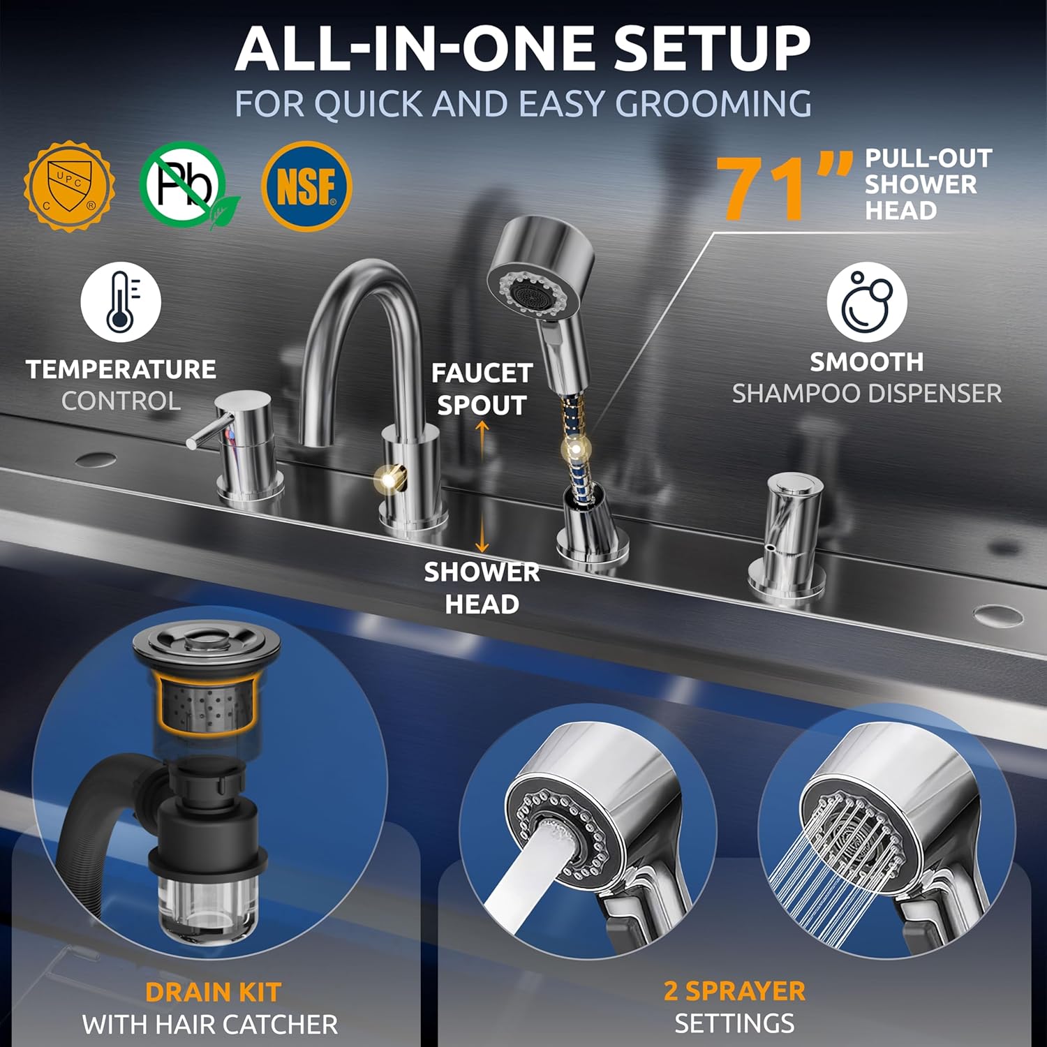 - Included Components: Premium quality Faucet with Pull Out Dog Wash Sprayer, Soap Dispenser, Drain Kit with a flexible hose, Hair Trap