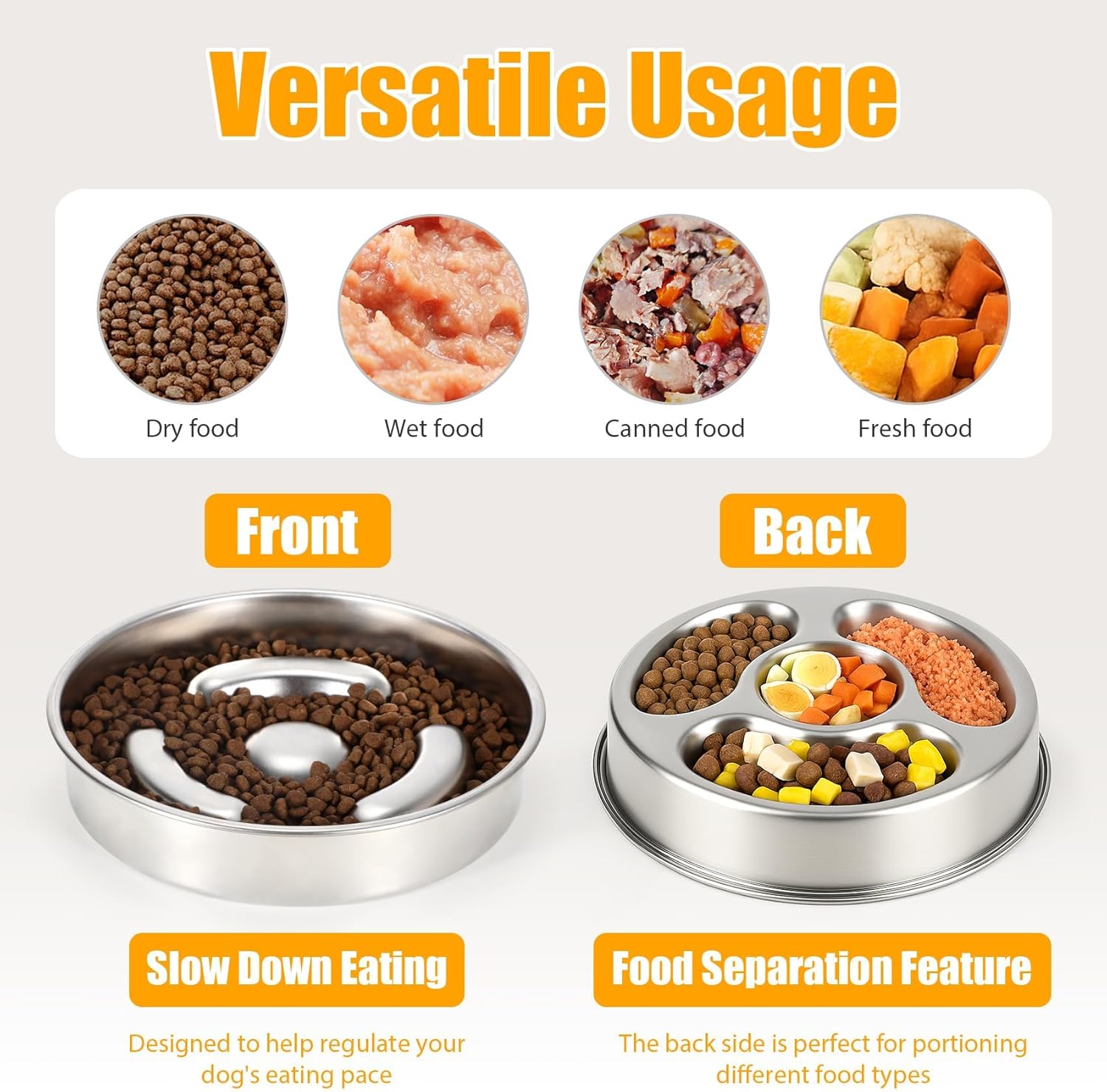 About this item SLOW DOWN EATING: The slow feeder dog bowls feature a unique partitioned design that slows down your dog's eating pace, preventing indigestion and vomiting from eating too quickly. Perfect for small and medium-sized dogs that need to slow down their eating habits. DURABLE STAINLESS STEEL: Crafted from high-quality stainless steel dog bowls, this bowl is built to last. It’s rust-resistant, dishwasher safe, and easy to clean—ideal for pet parents who want a low-maintenance feeding solution for their dogs. DOUBLE-SIDED DESIGN: The innovative double-sided design offers versatility for your pet's meals. Use one side for dog food and the other for dry treats, making feeding time organized and fun for your dog, especially in slow feeder dog bowls small breed. IDEAL SIZE FOR LARGE AND MEDIUM DOGS: With a 2.5cups capacity, this dog bowl is perfect for small to medium-sized dogs. Its 8.6x8.6x2 inch size ensures it holds just the right amount of food for your dog’s daily meals, reducing the chances of overeating. HEALTHY AND SAFE FEEDING: Made from food-grade stainless steel, this bowl ensures that your dog enjoys safe and healthy meals. It's perfect for holding dry kibble, wet food, or fresh canned food, making mealtime easy and worry-free for you and your dog. › See more product details