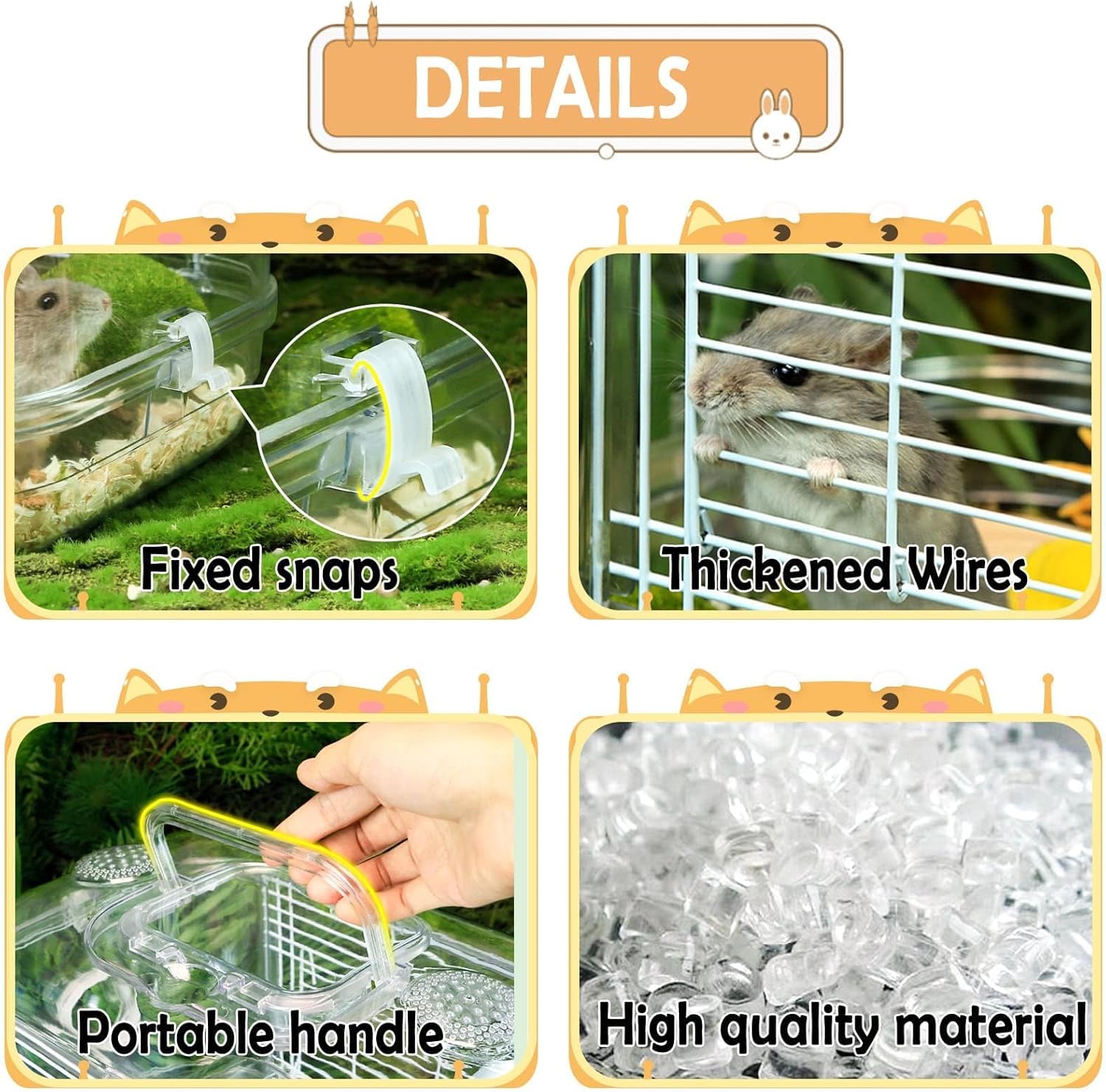 About this item 【CONVENIENT TOP DOOR AND FRONT DOOR ACCESS】The hamster cage has an overhead door and a large front door for easy maintenance of the hamster's home, easy cleaning, and replenishment of food and water. You only need to open one of the doors to get close to the hamster and interact with your pet. 【GREAT FOR TRAVEL】The Hamster Travel Cage is a portable little habitat, the package includes carrying case, water bottle, food bowl and running wheels, allowing your little pet to drink and play freely in this cage. The top is designed with concealable built-in handles for convenience and beauty. 【VENTILATION AND BREATHABLE】The hamster cage is designed with wire in the front and back, and the mesh structure of the cage makes the cage more ventilated so that your pet feels breathable and likes to stay inside. 【TRANSPARENT】Transparent plastic, clearly visible. Panoramic transparent design, you can clearly observe the hamster and enjoy watching the hamster. 【SIZE】Small animal carry cage size: 12.20 x 10.23 x 7.87 inches,the tunnel diameter is 1.96 in. Suitable for dwarf hamster, gerbils, mice,young hamsters and other small animals. › See more product details