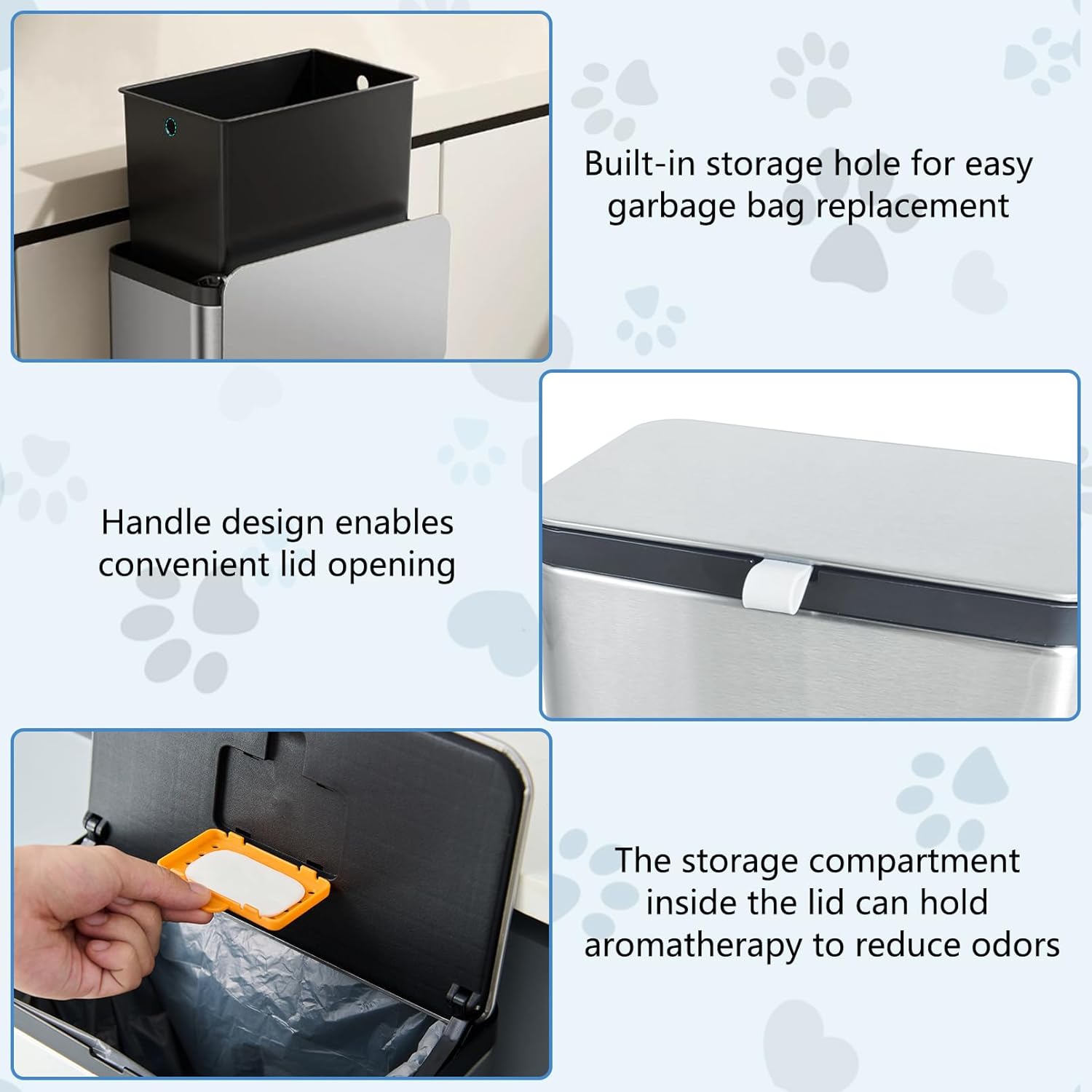 About this item Premium Materials: The main body of litter scooper holder is crafted from high-quality stainless steel, ensuring sturdiness, durability, and resistance to deformation. The surface adopts a wire drawing process, featuring an elegant and sleek appearance. It is not prone to stain accumulation and very easy to clean Proper Size: Cat litter box scooper holder measures 8.1" x 5.1" x 8.3" with a capacity of 0.8 gallons, easily accommodating most types and sizes of cat litter scoops. Its interior can also collect the cat litter residue left on the scoops, reducing cleaning time Removable Design: Cat litter trash can features a dual-bin design with an inner bucket made of premium PP material. The inner bucket includes a storage hole for easy replacement and secure attachment of trash bags. The removable design also facilitates thorough cleaning of the trash can Multiple Installation Methods: Cat poop container is extremely easy to install. You can hang or stick it on the wall, or simply place it next to the litter box, allowing for convenient storage of the litter scoop right where you need it and keeping the floor clean and tidy Multifunctional Uses: Equipped with a sliding or lifting lid,the top is equipped with a small box that can be filled with aromatreatment, which can effectively reduce the spread of odor.In addition to serving as a cat litter shovel holder, it can also be placed in the kitchen or bathroom as a trash can. › See more product details