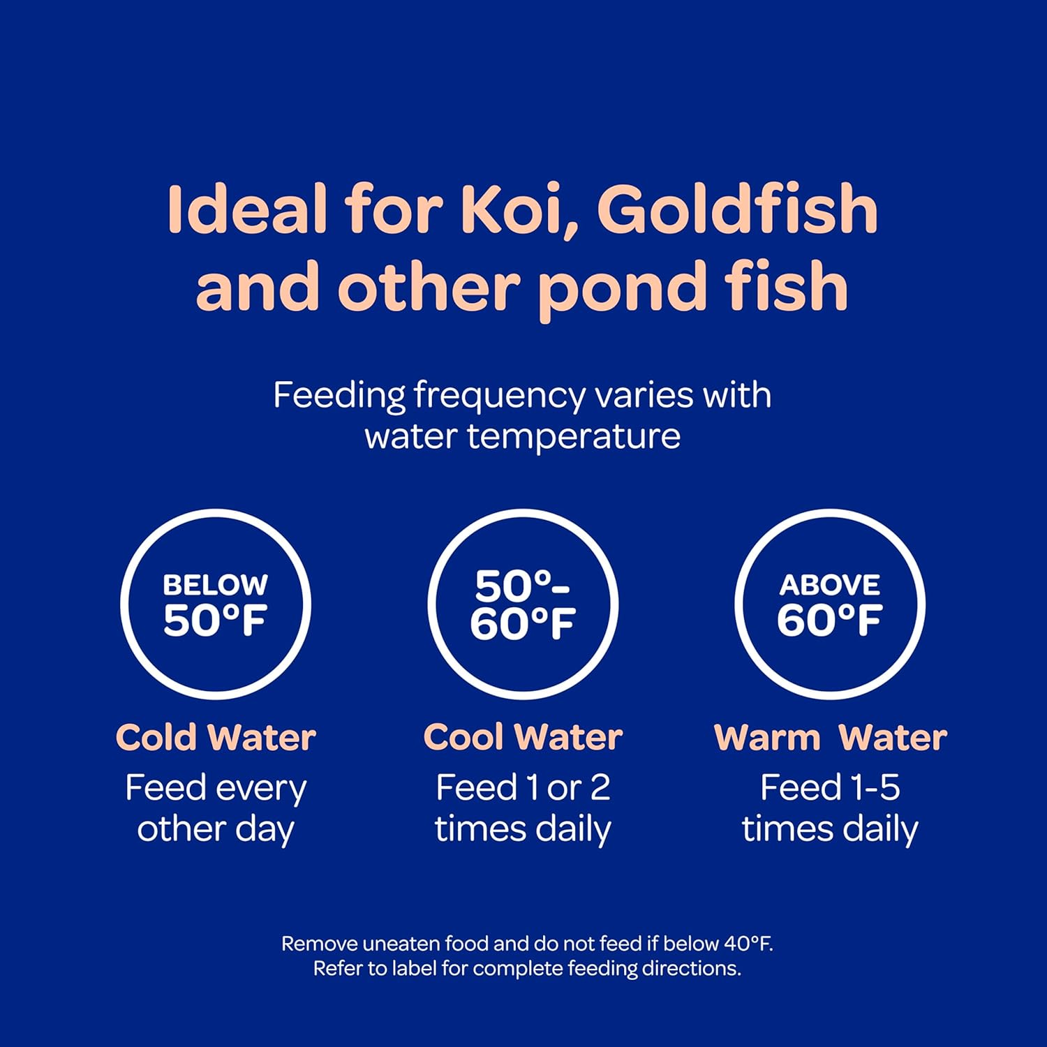 - Directions: For maximum freshness store in a cool, dry place. Feeding frequency varies with water temperature and the amount of growth desired. Never provide more food per feeding than will be fully consumed within 5 to 10 minutes. Remove uneaten food.