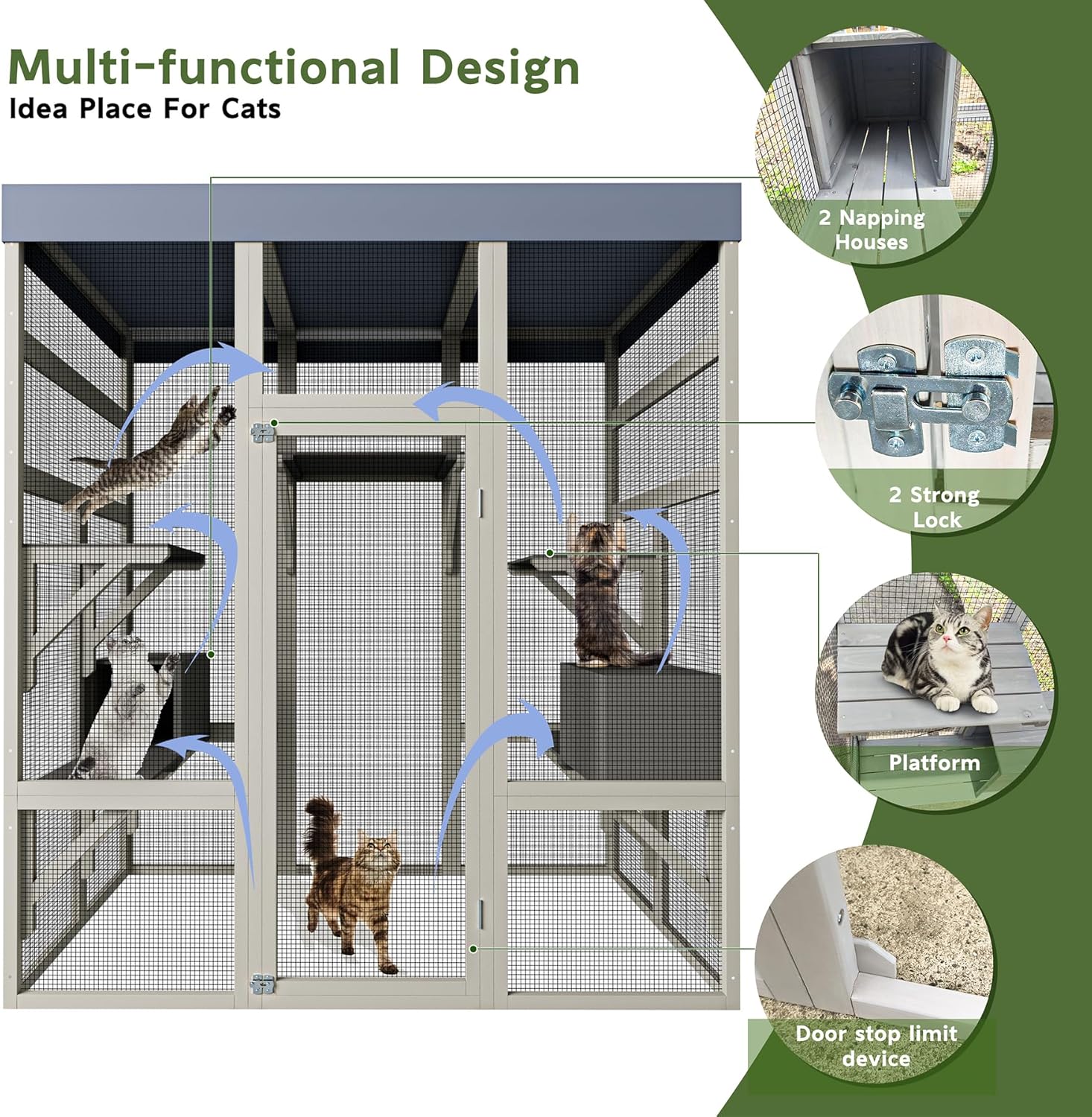 About this item Spacious Outdoor Catio: This 70.1" tall wooden cat enclosure provides ample space for multiple cats to climb, play, and relax safely in your backyard, patio, or balcony. Weatherproof & Durable Construction: Designed with a high-quality waterproof fabric on the roof, this catio offers protection against rain and harsh weather, ensuring long-lasting use. Cozy Napping Houses: Includes two enclosed cat houses, providing your pets with a secure and warm space for napping and resting comfortably. Interactive Multi-Level Platforms: The built-in platforms promote climbing and exploration, offering mental and physical stimulation for indoor or outdoor cats. Secure & Easy Access: Equipped with a sturdy locking door and a door stop limit device, this cat enclosure ensures your pets' safety while providing easy access for cleaning and feeding. › See more product details