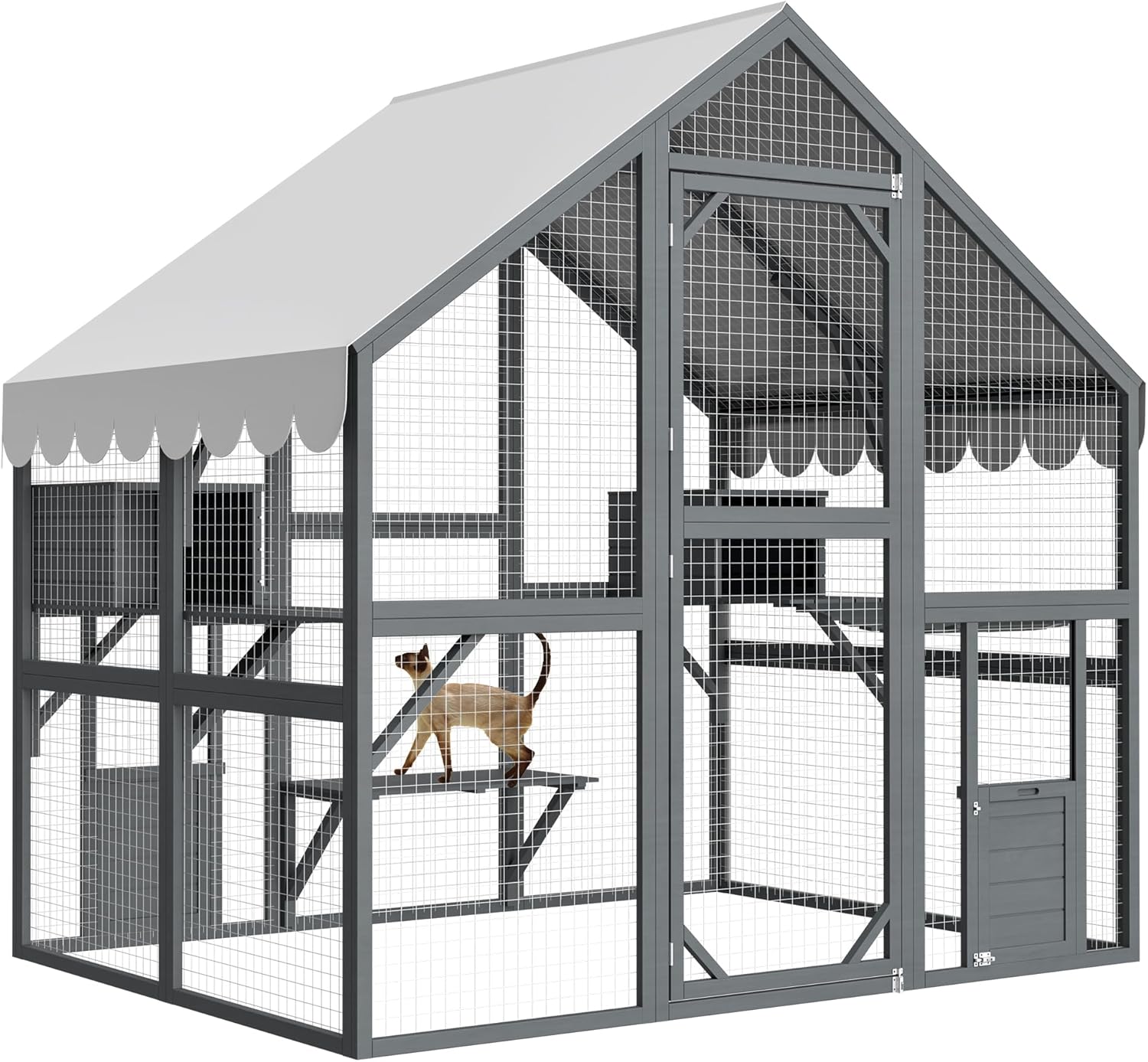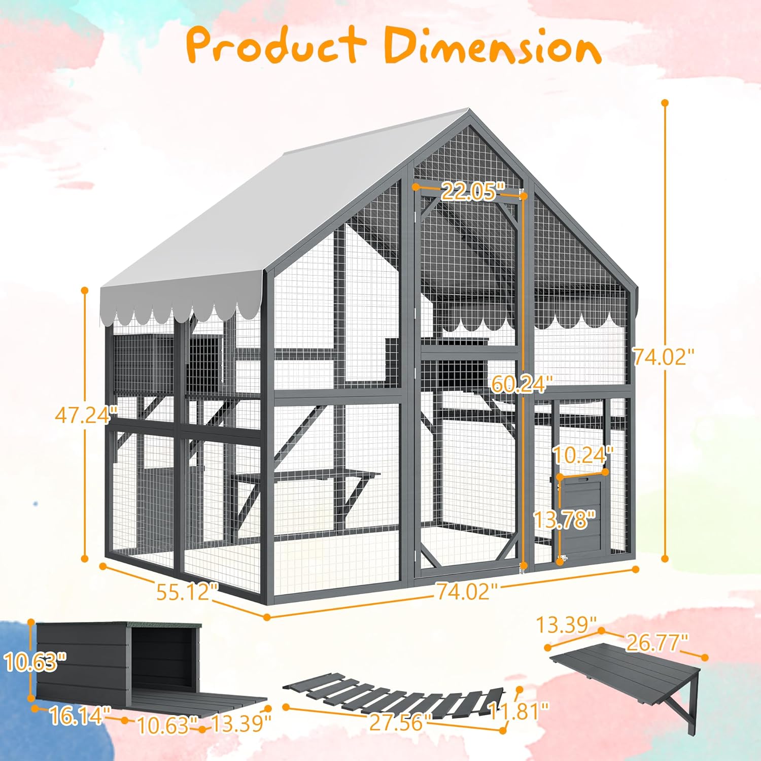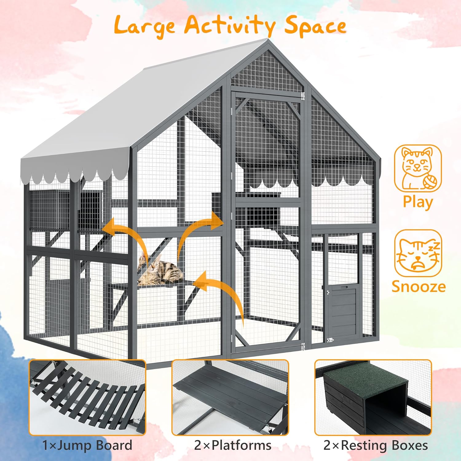 - Model Name: 6x4.6 FT Wooden Large Cat House Outdoor Catio Kitty Enclosures with 2 Doors,Platforms,Resting Box,Peaked Roof