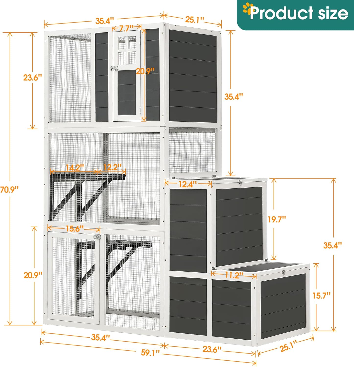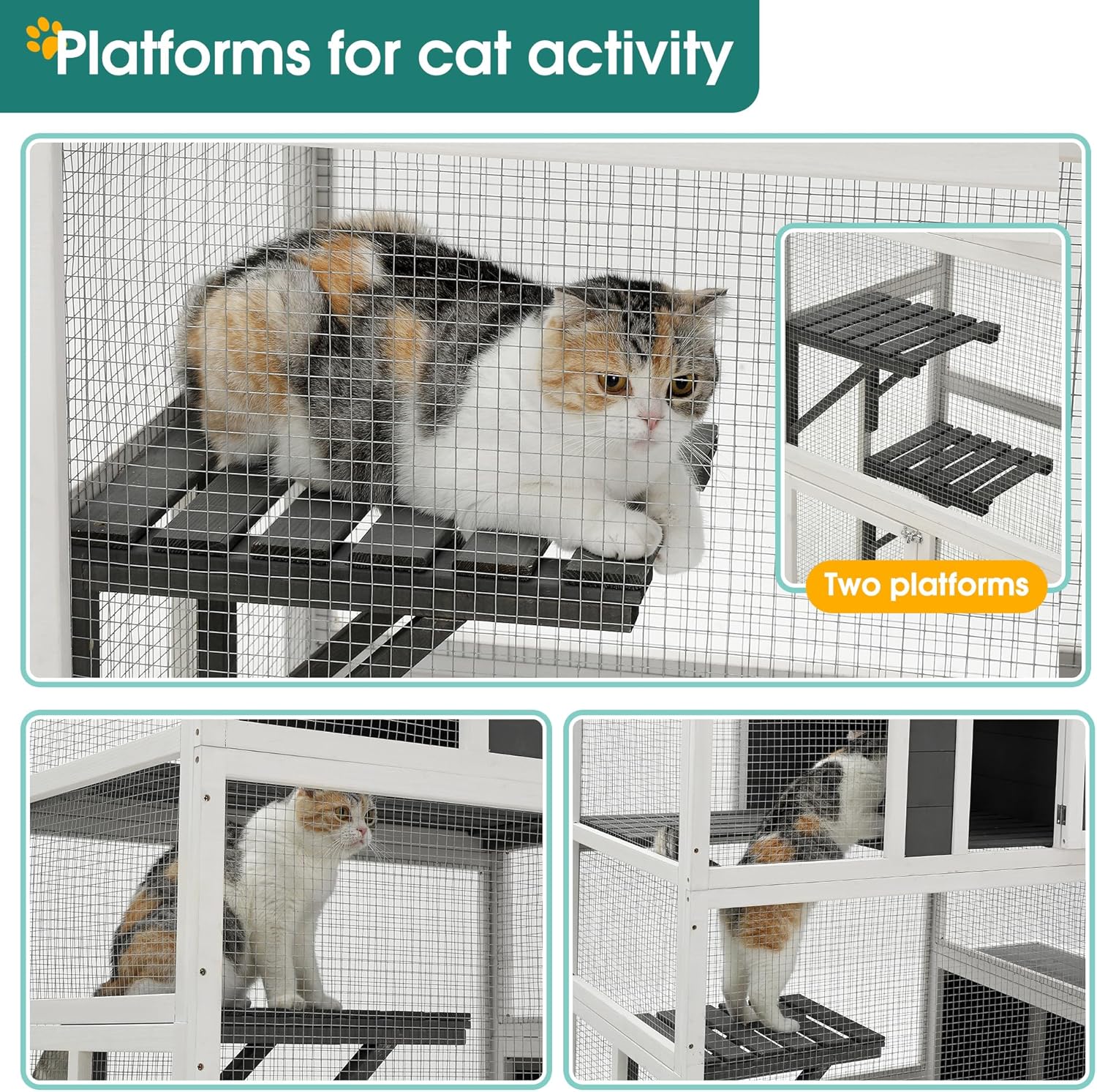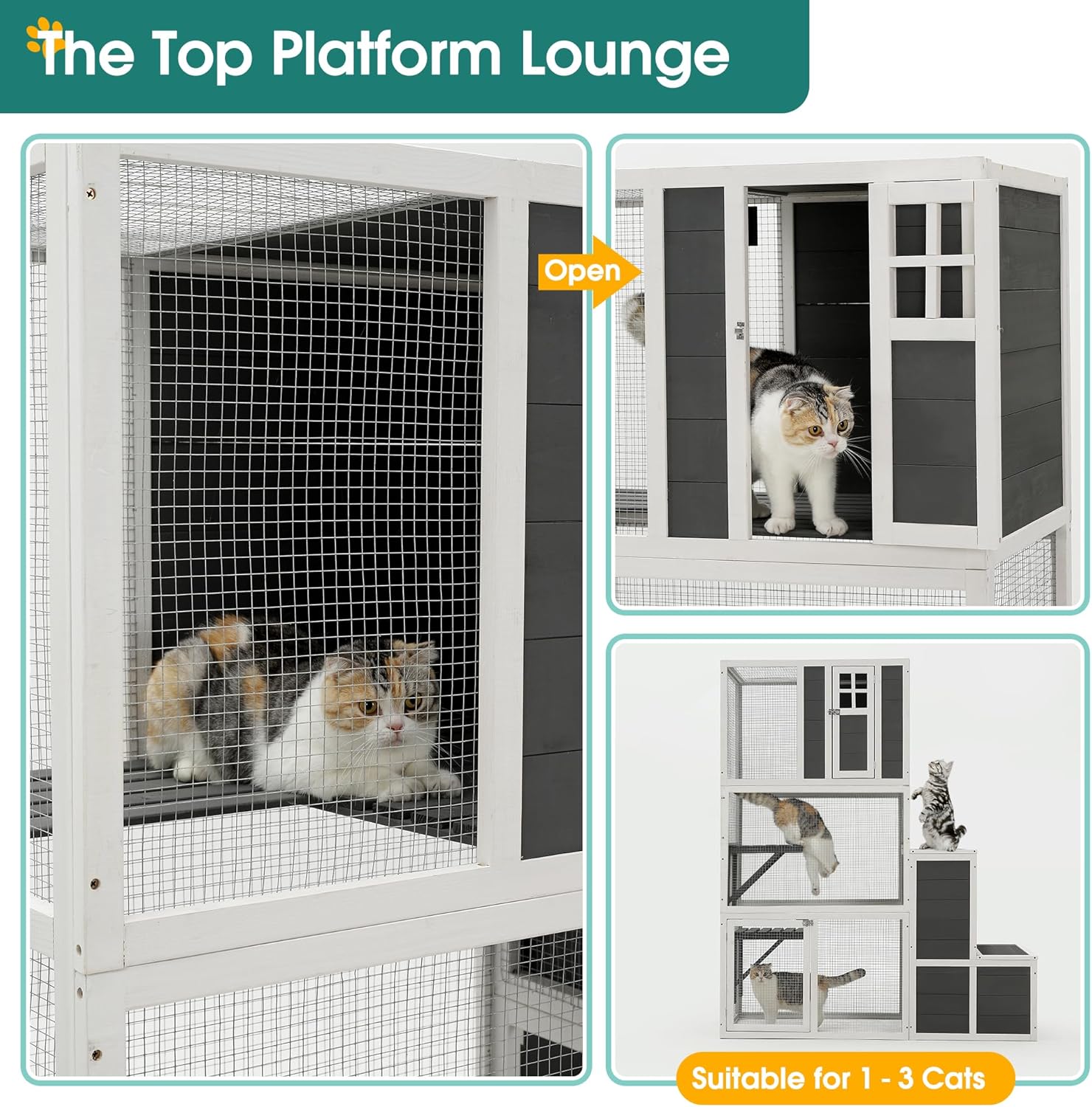 About this item Spacious Multi-Level Design for Active Cats: This large 3-tier cat house offers plenty of room for your cats to jump, climb, and explore. With two jumping platforms, a loft, and two cozy resting rooms, your cat will have endless fun and adventure. It's designed to accommodate 1-3 cats, and even other small pets, in a spacious environment. Elevated Loft for Comfort: The loft is raised off the ground, offering your cat a high vantage point to observe their surroundings. This elevated space provides a perfect retreat where your cat can enjoy the outdoors while staying comfortable and sheltered from the elements. It’s the ideal spot for relaxation and a great view of the world around them. Convenient Jumping Platforms and Hideaway Box: The two jumping platforms make it easy for your cat to reach the top level, while the jumping box offers a fun spot to leap in and out of, or even stash pet supplies. The box is also a perfect hideaway for playtime or naps, allowing your cat to stay entertained for hours. Sturdy and Weather-Resistant Construction: Crafted from durable pine wood and reinforced with sturdy metal wire, this cat house is built to withstand outdoor use. The combination of a metal mesh roof and solid panel provides the perfect balance of sunlight, shade, and rain protection, ensuring your cat stays comfortable no matter the weather. Easy to Assemble: Assembly is a breeze with pre-drilled holes and step-by-step instructions. Whether you're handy or not, you can easily set up this high-quality cat house in no time. It’s designed to be quick and straightforward, so your cats can start enjoying their new home as soon as possible! › See more product details