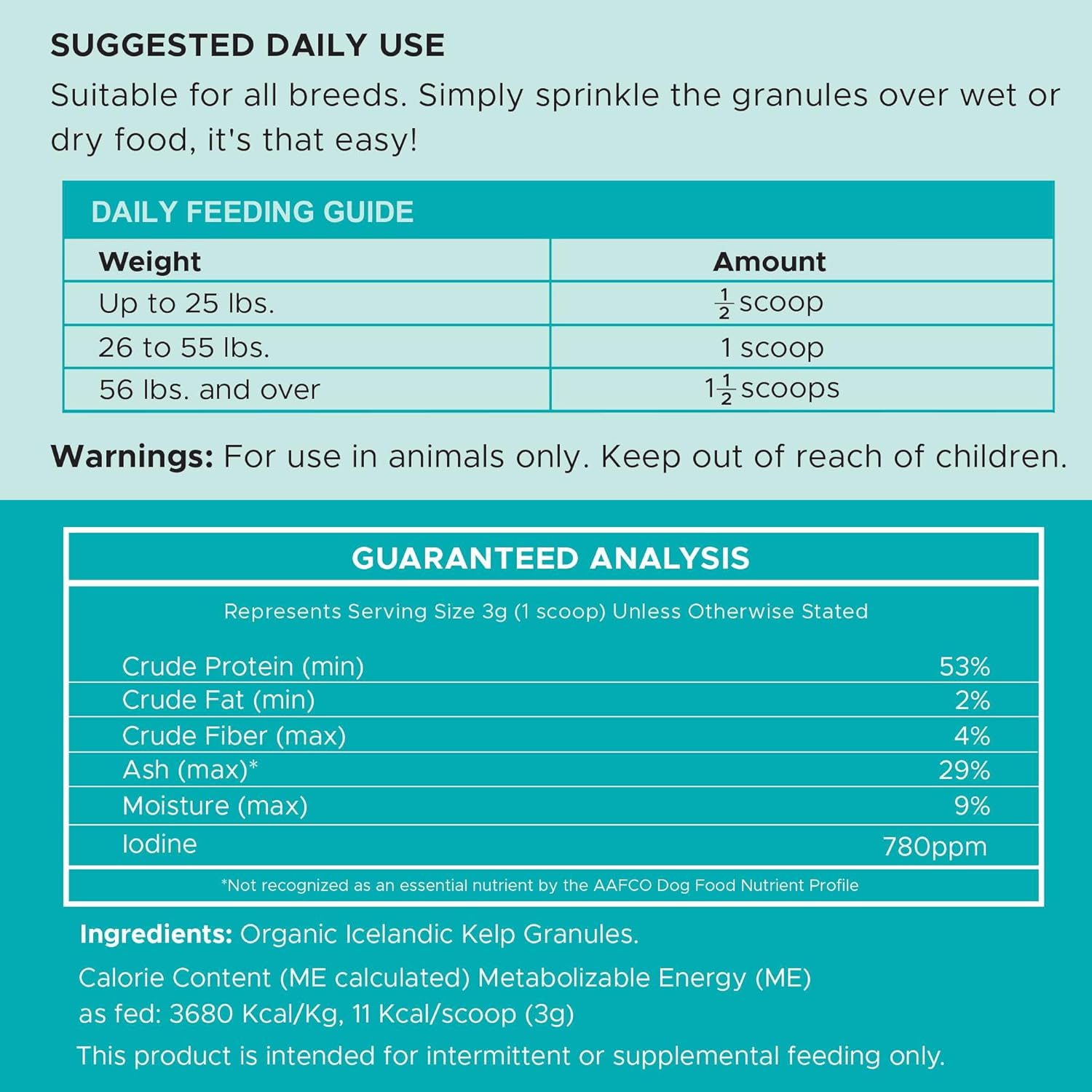 About this item Kelp Supplement for Dogs - 4 oz of Kelp Powder Granules with 5 cc Spoon - Good for Healthy Thyroid Function, Reduce Dental Plaque, and Skin Health - Made in the USA One of the many minerals found in this sea kelp powder is iodine. It supports the thyroid, pituitary, and adrenal glands which aid with metabolic health. Vitamins like A, B, C, and E promote immune health as well as contain minerals like calcium, potassium, and boron. Vitamin B12 also aids with a healthy skin and coat. This seaweed powder also supports gut health by acting as a prebiotic. It also contains an enzyme that can help remove plaque buildup, promoting dental health. Our sea kelp supplements come with 16 oz. per jar and a 5cc spoon. The granule texture is the perfect meal topper for your dog! βΊ See more product details