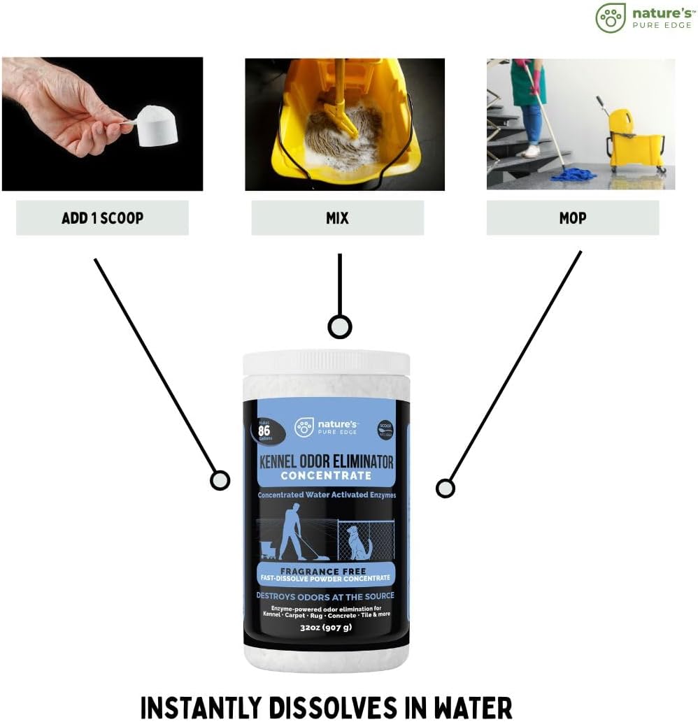 About this item Enzyme Cleaner for Cat Urine and All Other Pet Odors- Perfect for fragrance sensitive people and pets. Our no scent, fragrance free kennel odor eliminator for strong odors dissolves and activates instantly in water to be used as a mop soap or spray floor cleaner for cat and dog urine and feces, making it the most powerful remover of all animal odors, especially set in cat and dog pee odors. Professional strength pet odor enzyme blend focuses on pet odors. No scent and no overpowering perfumes. Concentrate Powder Urine Odor Eliminator- This fast dissolving concentrate powder makes 86 gallons, providing a cost-effective solution for large areas, mop up to 20,000 Square Feet with 1 jar! It is a powerful enzymatic dog odor eliminator, cat urine odor remover, and general pee smell remover. Your solution for a thorough odor eliminator for pets. Gets rid of dog smell in the house and permanently gets rid of urine smell. Neutralizes deep set odors. Pet Odor Eliminator for Home or Facility Use-Removes dog urine odor and even set in cat urine odor, feces, vomit, and wet dog smell. Great for use in kennels, vet clinics, grooming salons, and anywhere pet odors linger. Use in daily mopping, spot cleaning, or high-pressure wash-downs in pet care facilities, homes, and rescues. Long-lasting Freshness- Formulated to tackle even the toughest odors, this all surface, including carpet odor eliminator offers long-lasting freshness. Say hello to your new pee smell eliminator! It effectively neutralizes odors, ensuring that your home remains inviting and free from unpleasant smells. Dry Enzyme Powder with Easy Mix Scoop-Unlike bulky, spill prone liquid cleaners, this enzyme fresh odor eliminator dissolves fast in water. Scoop included for simple mixing. The most effective odor removal comes from enzymes that target the source itself. Carpets, rugs, hardwood floors, tile, concrete, and astro turf. Simply the best for strong odor, 32oz enzyme pet odor remover. › See more product details