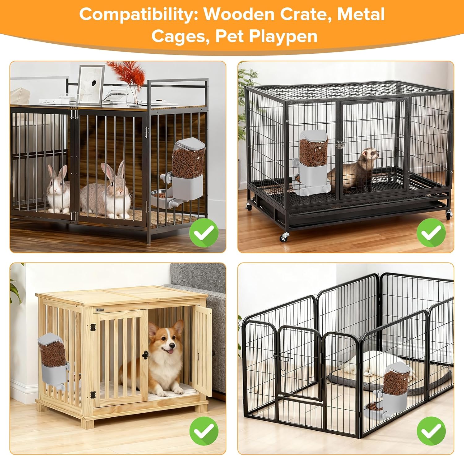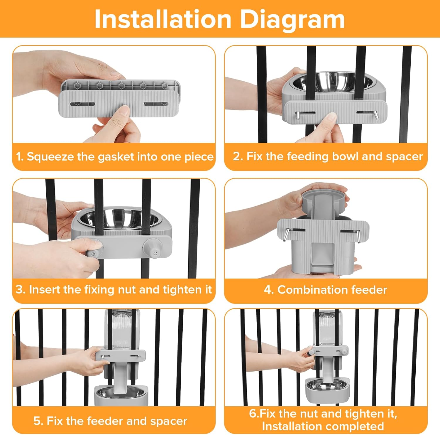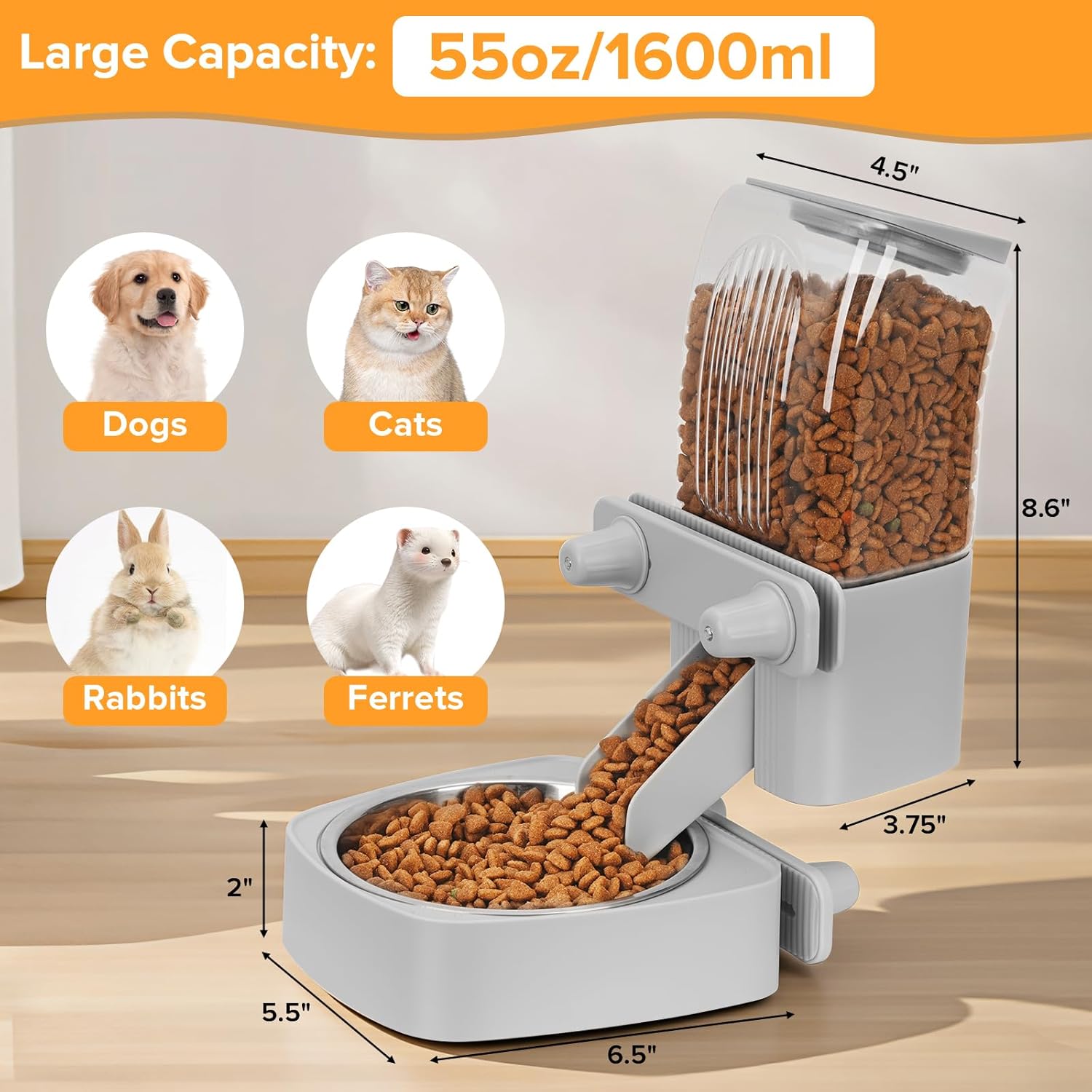 About this item Cage compatibility: This stainless steel bowl pet food dispenser is suitable for Heavy Duty Crate,Iron wire pet cage or Metal circular rodes cage,Iron wire pet playpen and Wooden crate. Feeding bowl dimensions: 5.5 " * 6.5 " * 1.96 ". Food container dimensions: 4.5 " * 3.74 " * 8.6 ". Minimum width: 1.8 " (≥ 1.8 "), minimum height: 1.3 " (≥ 1.3 ").Note: The spacing between the cages must be more than 1.8 inches for it to be applicable. Please measure accurately before purchasing. Large capacity: This automatic rabbit feeder has a 55oz/1.6L large capacity, which can provide approximately 5 days of food for small and medium-sized cats and dogs, and about 7 days of food for small rabbits and ferrets. It is highly suitable for busy pet owners. Protecting the cervical vertebrae of animals: This dog food dispenser adopts a hanging design. With four knobs for enhanced stability, it can be adjusted to the installation position according to the height of the pet, thereby reducing the cervical pressure on the pet. The safe and separate hanging design for the feeding bowl and food container saves space within the cage and keeps the pet's activity area tidy. Gravity Automatic Refill Design:This pet feeder with 1.8in/4.5cm food outlet and a 65° sloping ramp,food can be replenished smoothly, refuse to jam food.Natural gravity supply system, you can save electricity and more secure. Food Preservation Design:Top feeding design allows for adding food outside the cage, which is safe and convenient. The top is designed to be dry, which helps to preserve the freshness of the food. Easy to clean:The detachable stainless steel feeding bowl makes it convenient for regular cleaning, Weekly cleaning is recommended. › See more product details