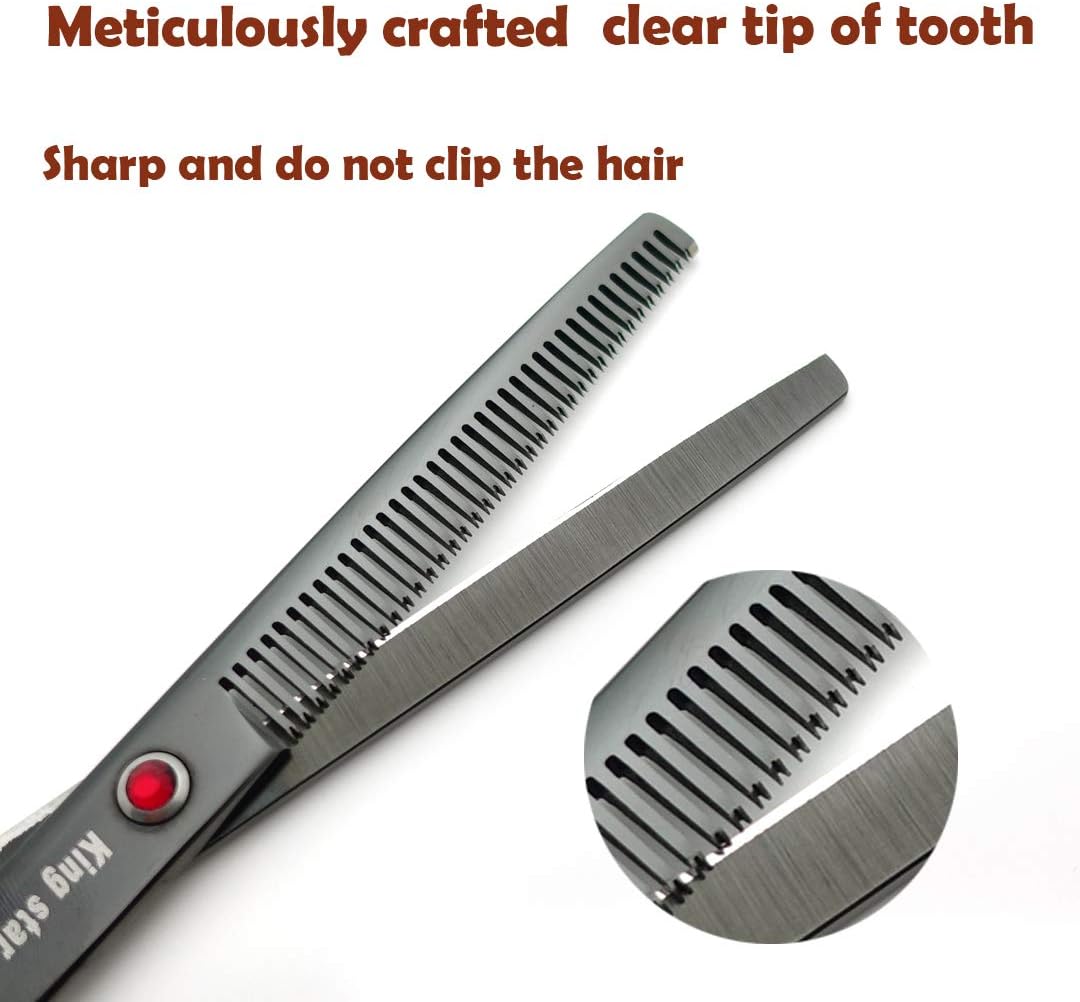 About this item SHARP CONVEX EDGE .The edge line of the blade is evenly polished, using the convex arc design to increase the thrust of scissors,to make the cutting more smooth and stable.With meticulously crafted clear tip of tooth ,the thinning scissors are sharp and do not clip the hair. GOOD MATERIAL &TECHNOLOGY.The scissors are made by high-quality 6CR stainless steel with high hardness, so that the scissors are durable,sharp.Each scissors suffers forties process carefully polishing and grinding,so that the scissors are better quality and more durable. RICH PARTS LIST.the set comes with 1 straight scissors,1 thinning scissors,1 up-curved scissors,1 down-curved scissors,1 case,1 cleaning cloth,1 adjusted-key,the adjusted key is used to adjust the tightness of the scissors. COMFORTABLE TO HOLD, CLASSIC APPEARANCE.Ergonomic design makes scissors fit the fingers perfectly. you can feel very comfortable to hold the scissors in hand.Many buyers friends feedback that this set is very comfortable to hold in hand AFATER-SALE GUARANTEE.We are a professional manufacturer, very confident in the quality of the products, so we provide 3 months unconditional return.If you are not satisfied with our products, you can contact us seller to get a replacement or refund. › See more product details