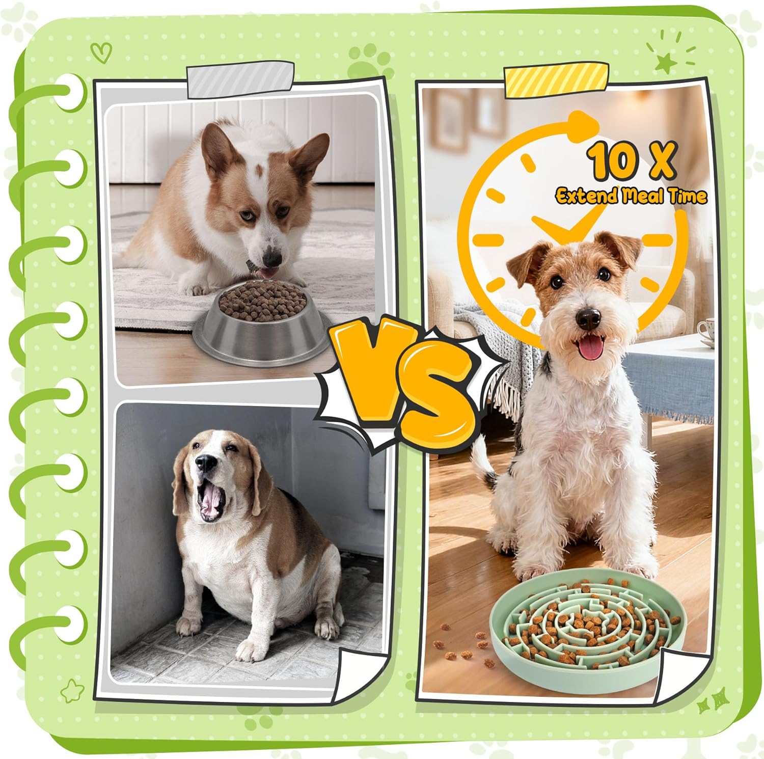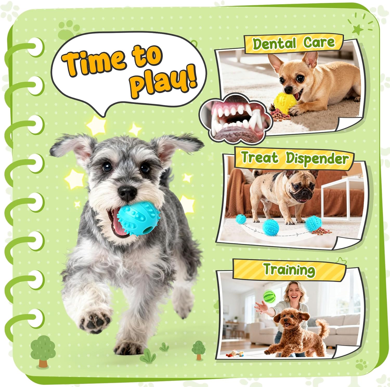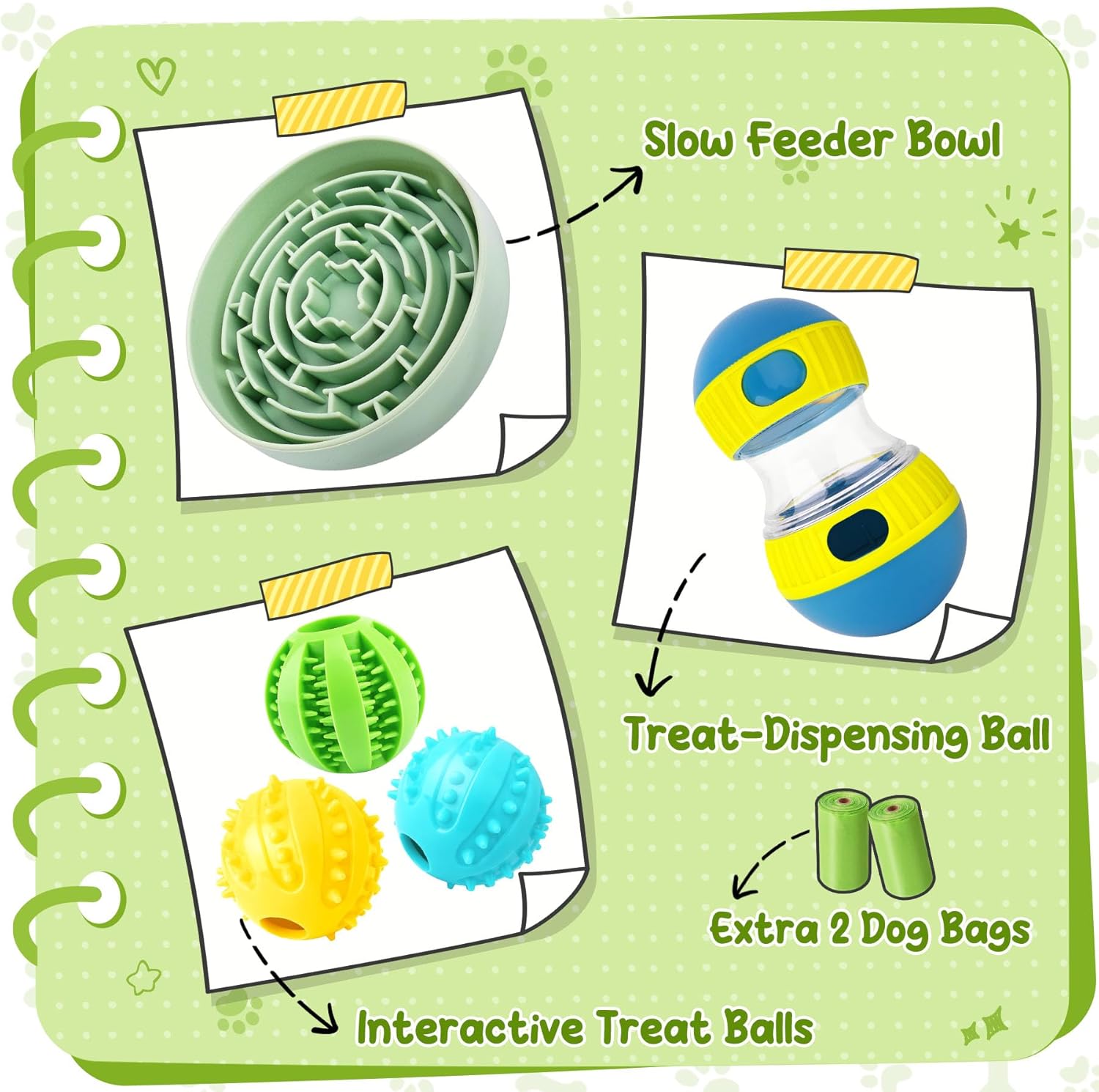 About this item Enriching Slow Feeding Set:Includes a slow feeder bowl, a treat-dispensing ball, three treat balls, and two rolls of dog bags. Thoughtfully designed to combine slow feeding and mental enrichment, helping dogs eat slower and stay engaged Slow Feeder Bowl for Healthy Habits:The maze design slows eating and encourages chewing. Equipped with a suction cup base, it securely sticks to smooth surfaces to prevent slipping during mealtime, making feeding calmer and safer Treat-Dispensing Ball for Engaging Fun:Turns treats into a stimulating game. Dogs roll, nudge, and paw to get snacks, while each sphere’s adjustable knob fits various food sizes and manages the output, keeping them active and eating at a healthy speed Interactive Treat Balls for Bonding Play:These treat balls create engaging experiences to share with your dog. Perfect for fetch, hide-and-seek, or training routines, they encourage healthy interaction, build trust, and strengthen your daily bond Safe Materials for Happy Play:Crafted from pet-safe materials for fun and safe use. Please note these toys encourage interest and engagement but aren’t suitable for heavy chewers. Supervision is recommended to keep your pup safe › See more product details