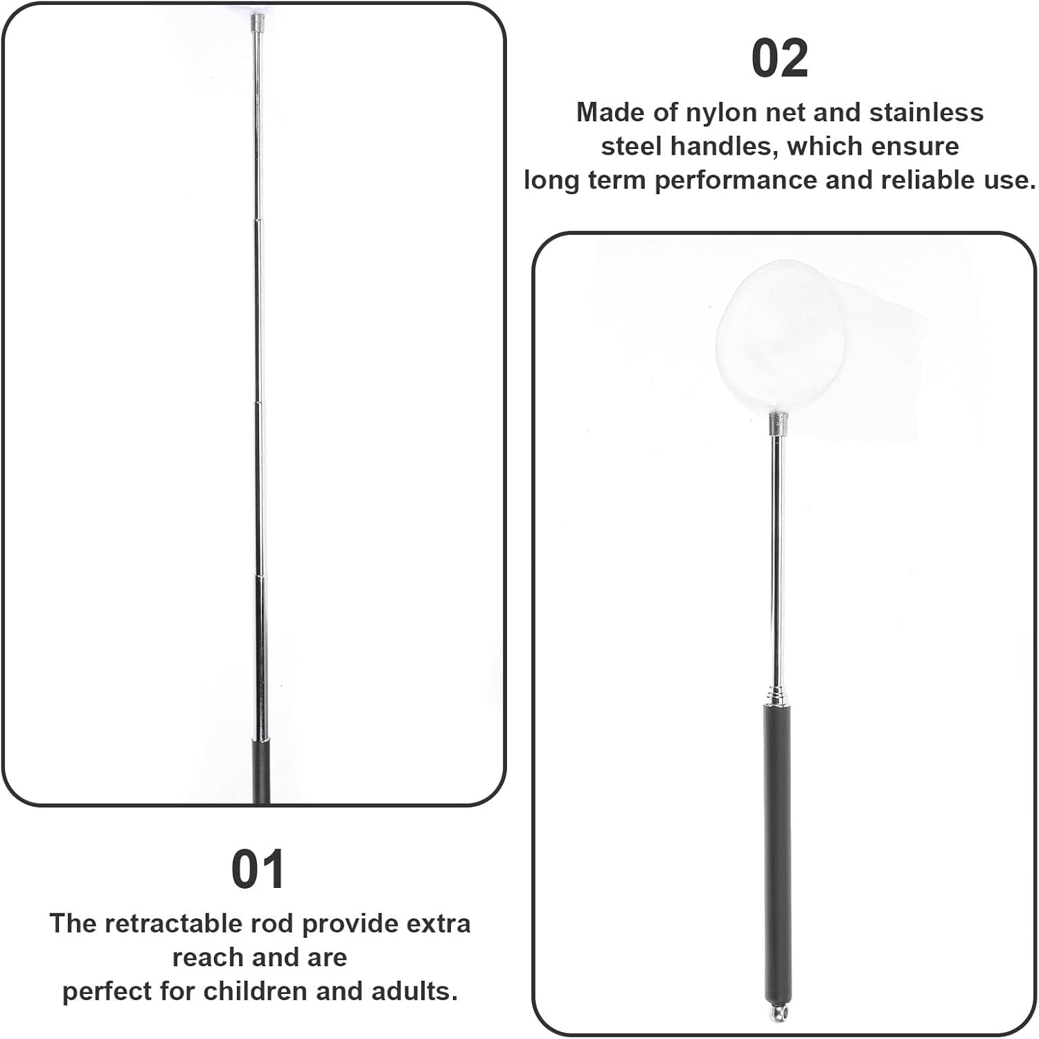 Package List 1 net Characteristics -Color:Black -Material:Stainless steel, nylon -Size:18.50X6.00X5.50cm/7.27X2.36X2.16in -Product Info:Shrimp net bag -Telescopic range:18-53cm small shrimp net -Made of , sturdy and durable for long term use, suitable for fish tank, outdoor fishing and aquarium. -No matter whether your fishing from the bank, or on a boat or walk in shallow water, the fishing net will make the difference net for tank. -The fishing net is portable and to grab the fish, perfect for fishing on your favorite river, lake or stream extendable fish net. -A sturdy mesh that can safely catch small fish, but is sturdy enough to remove large amounts of debris fish holder net. -The rod is the telescopic, which can be adjusted according to needs, and with durable handle, it feels good in your hands net for fish tank.Goods Descriptionfine mesh fish net Retractable stainless steel rod, non-slip, comfortable to touch.aquarium net This fishing net is with durable nylon and sturdy stainless steel which make the net durable and practical.telescopic fish net The fishing net is good for long time use