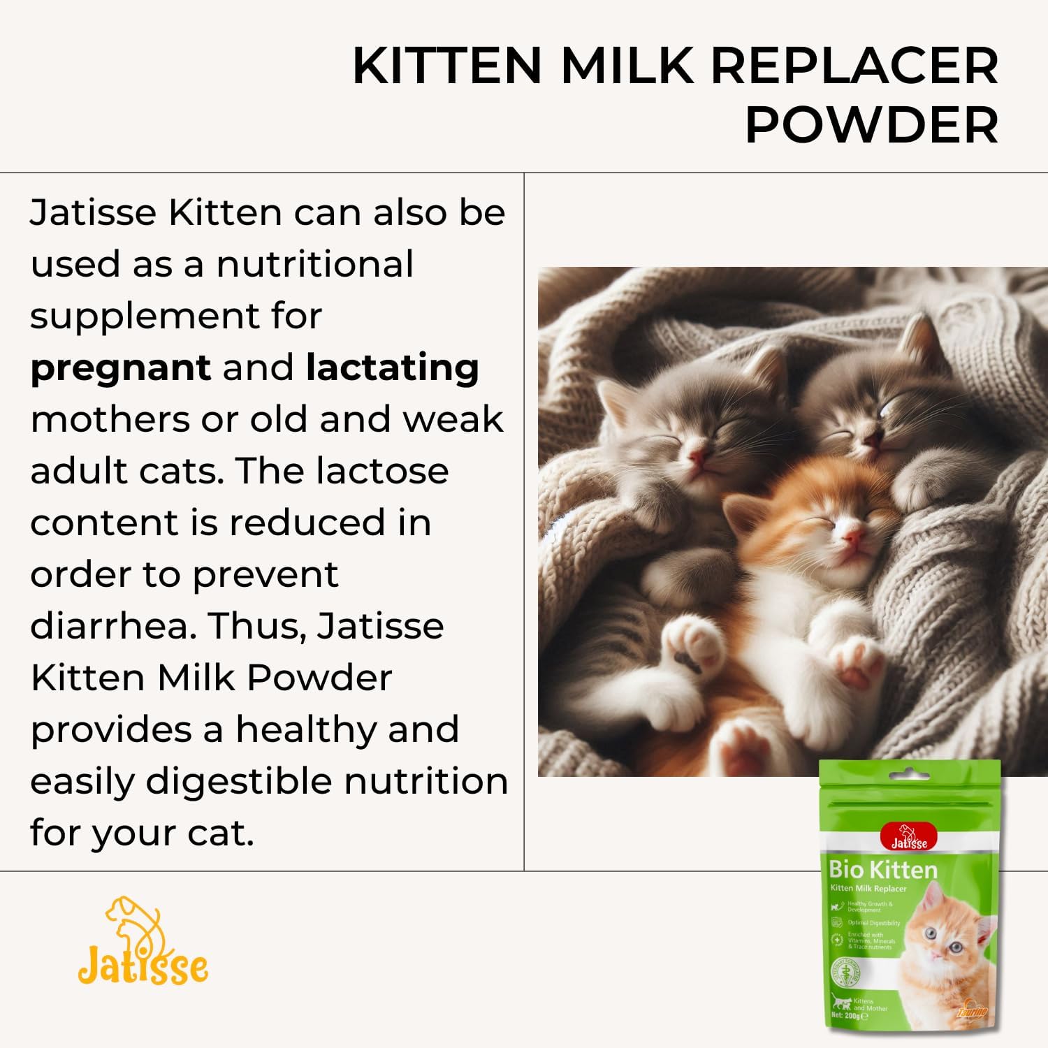 - Directions: Mixing Instruction Mix Jatisse Kitten with a small amount of water below the boiling point (176°F). Afterward, add remaining water gradually while stirring the milk briskly. Feeding to cool and serve when it reaches the body temperature (95-104°F).