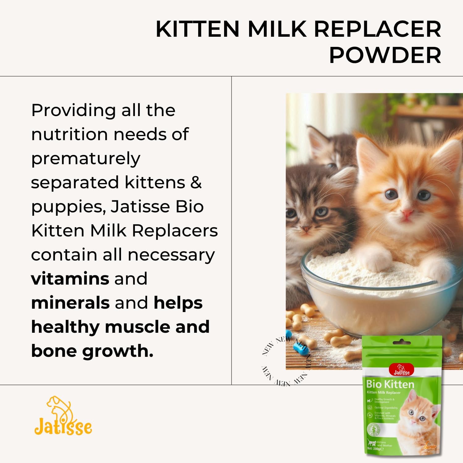 Complementary feeds for kittens precisely formulated to match mother’s milk and supports optimal growth and development of your furry friend. The balanced formulas contain proteins, vitamins, minerals, and oils. Providing all the nutrition needs of prematurely separated kittens, Jatisse Kitten Milk Replacers contain all necessary vitamins and minerals and helps healthy muscle and bone growth. Jatisse Kitten can also be used as a nutritional supplement for pregnant and lactating mothers or old and weak adult cats. The lactose content is reduced in order to prevent diarrhea. Thus, Jatisse Kitten provides a healthy and easily digestible nutrition for your cat. Taurine is essential amino acid for cats. It is not naturally synthesized in the body and must be taken with food. It is necessary for visual and reproduction. It protects against free radicals, which makes taurine an important antioxidant that helps fight aging. L-Carnitine is used for metabolism of fatty acids in the body and conversion of energy within the cells. It helps to reduce the proportion of fat in the body, losing weight, and to turn the fat in between ineffective muscle masses into energy.