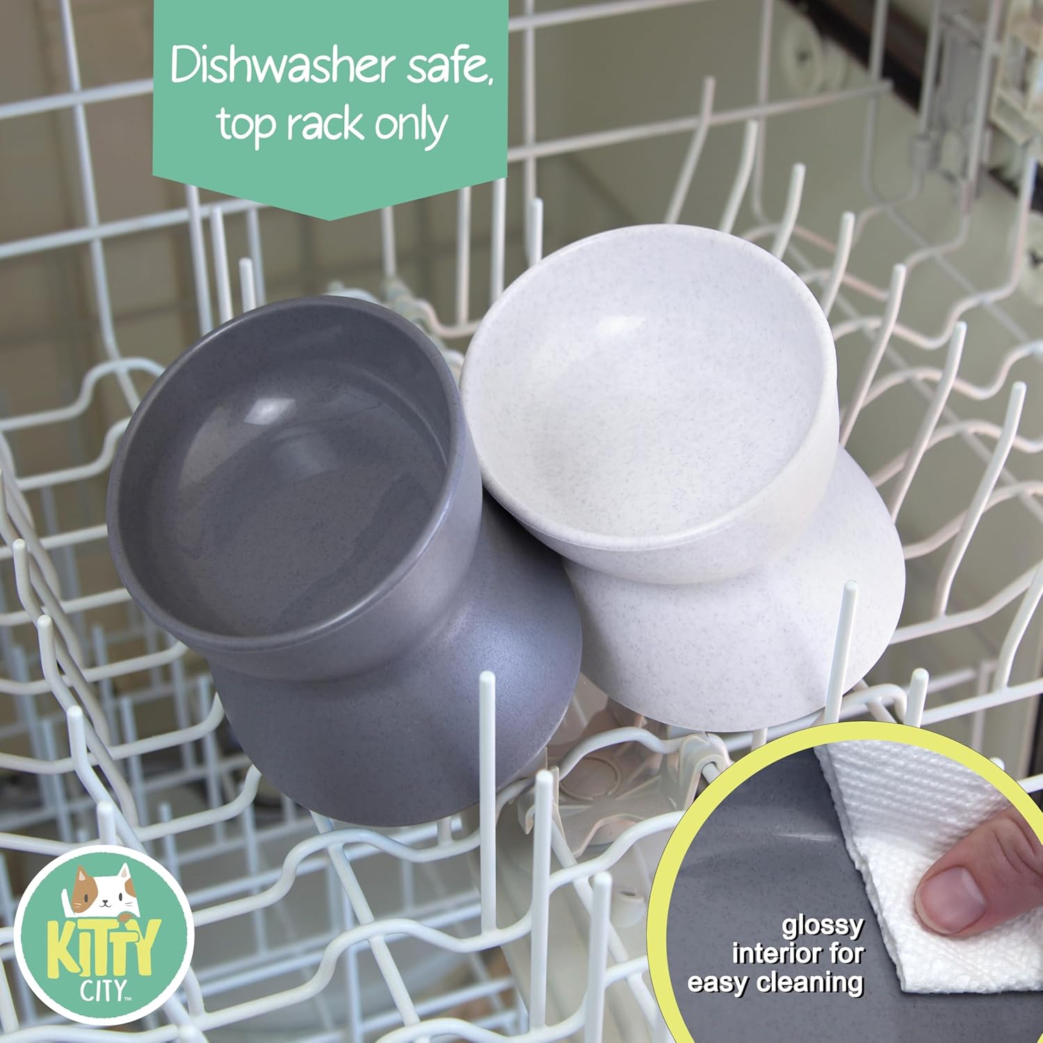 Your clever, agile cat is your constant companion. So why not do him a favor and keep dinnertime from being a literal pain in the neck? Unlike average floor dishes, Kitty City elevated bowls reduce neck tension and create a natural eating posture for pets. Made with subtle, feline-friendly design details like an oval shape that protects whiskers and a slanted front for easy access. Modern styling and colors look great in any corner of your home. Safe to wash in the top rack of your dishwasher. Pet safe plastic is top rack dishwasher safe while non-skid mat keeps bowls in place.