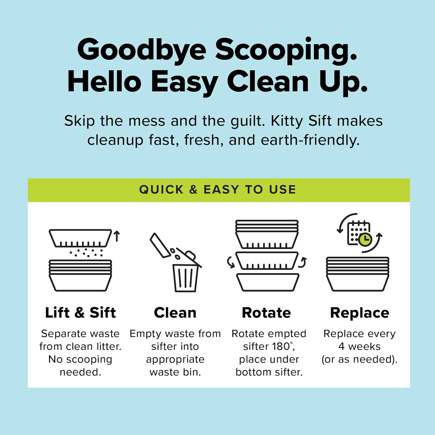 Simplify pet care with the Kitty Sift Disposable Sifting Cat Litter Box Large, 6 Count. This complete system combines one sturdy base with five precision sifting liners to eliminate the hassle of scooping. Simply lift to separate clean cat litter from waste, reset, and reuse. Each sifting litter box is crafted from eco-smart, recyclable materials that cut plastic waste while staying durable through multiple uses. The breathable structure enhances airflow to keep litter drier and reduce odors between changes, maintaining a fresher cat litter box area. Its lightweight build makes it ideal for travel or multi-cat households that demand flexibility. The portable litter box setup transitions easily from home to on-the-go use, offering dependable odor control wherever you go. For versatility, the open layout doubles as a bunny litter box or litter pan for small pets. Easy to assemble, quick to clean, and fully scoop free, the Kitty Sift system ensures a simpler, cleaner, and more sustainable approach to litter maintenance.