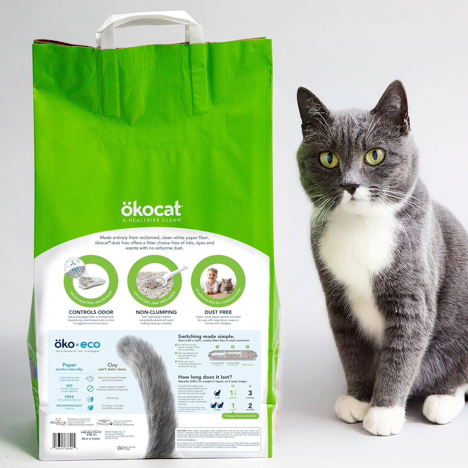 Switch to a superior natural cat litter that's cleaner and healthier for your cat, family, and home. Our next-generation non-clumping, paper cat litter is made entirely from reclaimed, clean white paper fiber. Free from harmful chemicals, inks or dyes, and artificial fragrance, unscented ökocat litter boasts long-lasting, plant-based odor control to suppress ammonia odors. Best of all, our non-clumping paper pellet litter is dust-free and low-tracking, ideal for cats with respiratory ailments, homes with allergies or post-surgical needs. oko is German for "eco" or ecological, meaning green or organic. okocat litter is made from 100% reclaimed paper that comes from the earth and can be returned to the earth. The 100% recyclable paper bag packaging with a convenient strong, paper handle is easy to carry, store, pour, break down and recycle.