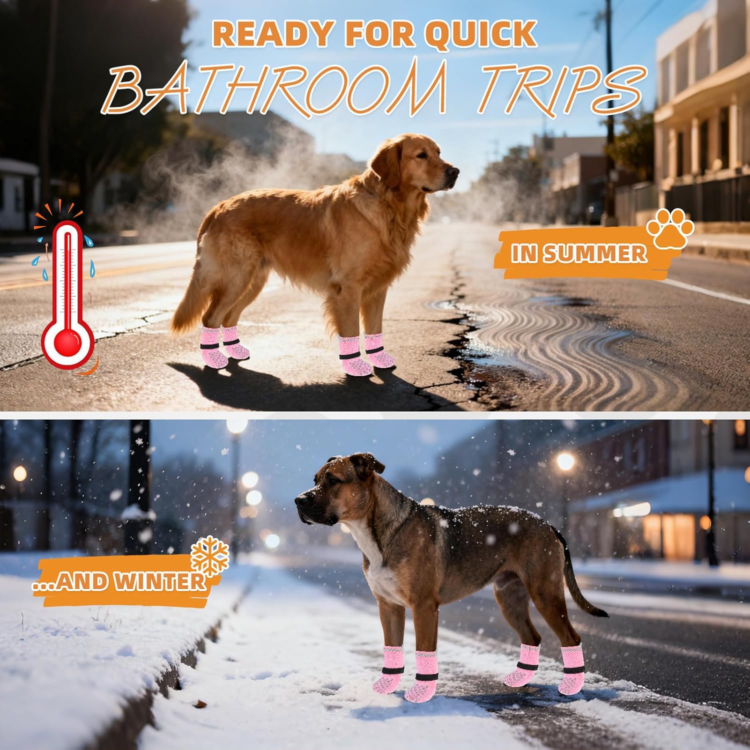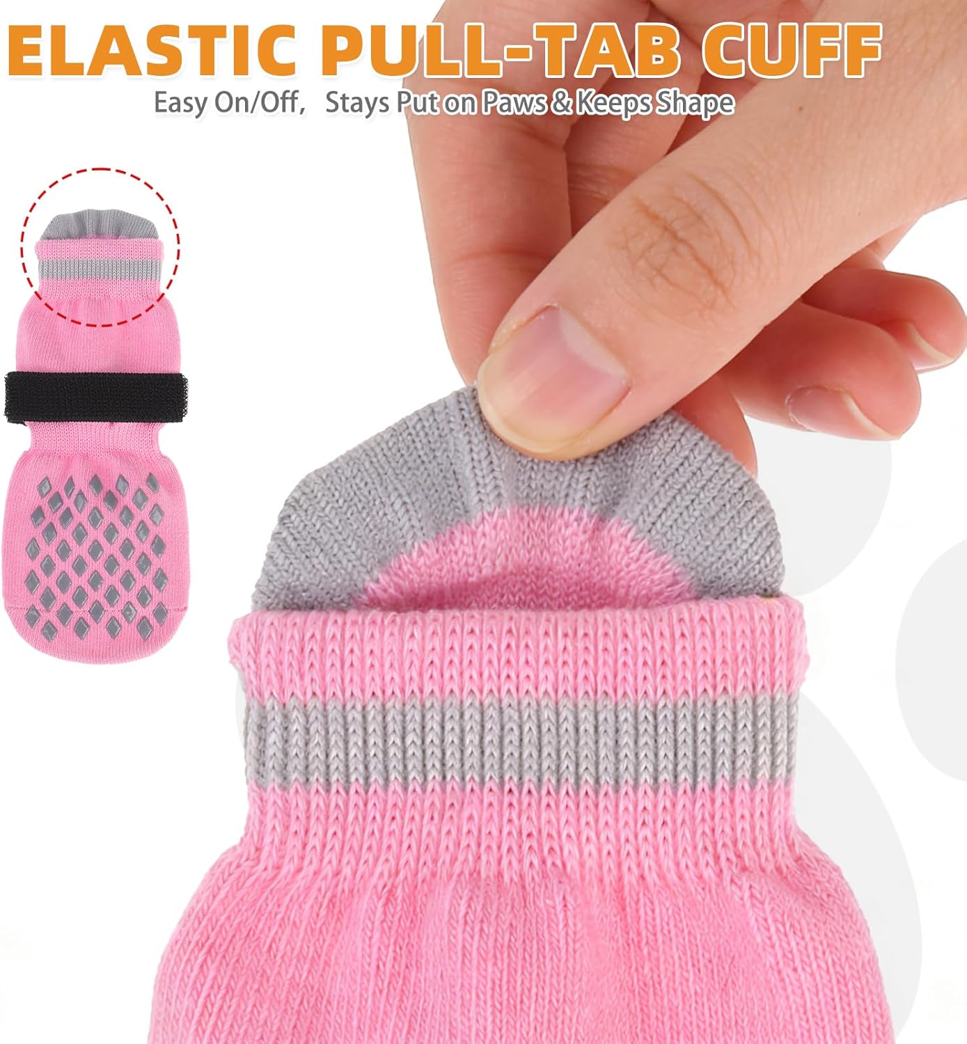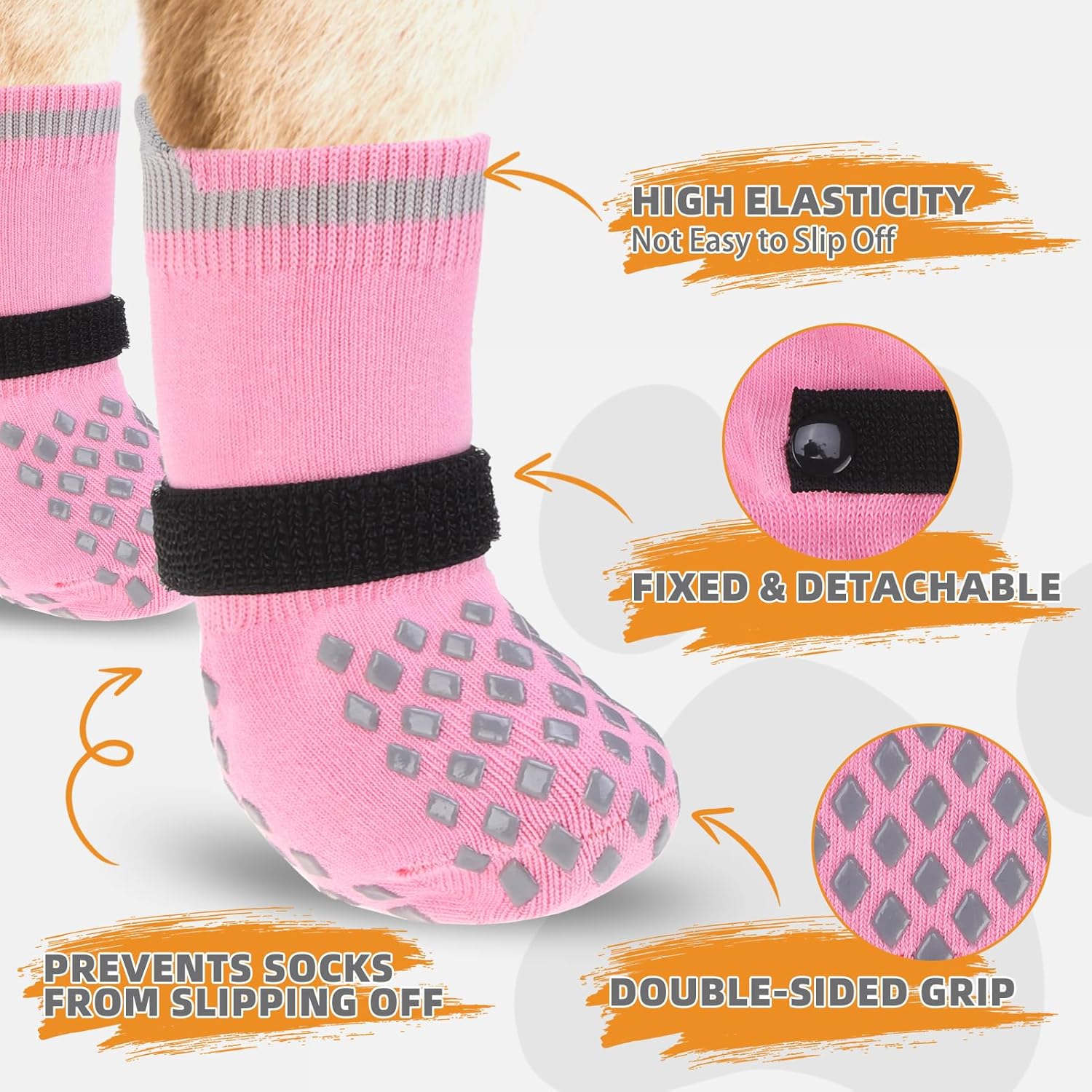 About this item SUITABLE FOR X- LARGE DOGS: Foot width 3.5 inches Sock length 8.2 inches Grip width 2 inches. Please measure the dog's paws & reference our size chart before purchase. Choose the smaller size if between the two sizes. DOUBLE SIDED NON-SLIP: Each side of the sock has the grip, which provides additional traction when your dog walks on a smooth floor. Even if the socks are twisted, they can still work. In addition, the design of the double-sided grip ensures a longer lifespan of the socks. When the grip on one side is worn and has no anti slip effect, it can cause the dog to wear on the other side, exerting a new anti slip effect. COMFORTABLE TO WEAR: Made of 75% Cotton and 25% Polyester, which provides the perfect stretch for your pet's feet. The soft, breathable fabric can effectively keep warm, and it is also excellent in comfort, allowing the dog to feel a soft wrap. And it also can protect your dog's paws from stones and glass, and cold/hot floor. DETACHABLE ELASTIC STRAP: In addition to the elasticity of the socks themselves, which can wrap the dog's feet, it is also fixed with a magic strip, which can be freely set in size, effectively preventing the socks from falling off. You can use the adjustable and removable strap to adjust the tightness of your dog's socks to prevent your baby from dropping them when walking or running. MULTIFUNCTIONAL: Suitable for small medium large dogs, prevents your dog from licking wounds, from getting burned on the hot pavement in summer, and from getting frostbite in the cold winter. More comfortable than boots, shoes, or paw pads. In addition, it prevents naughty dogs from scratching the sofa and floor. A Practical dog sock Gift! › See more product details