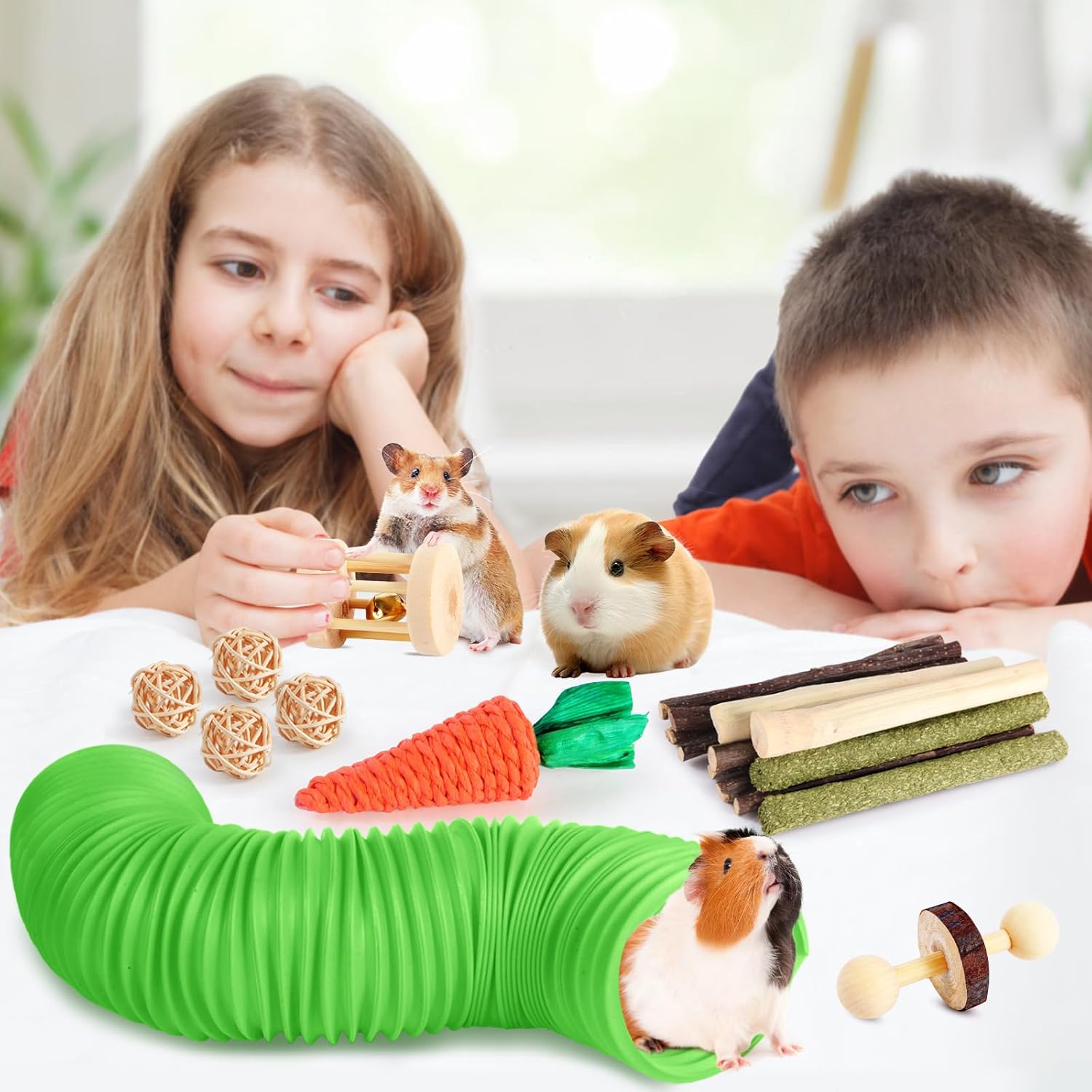 【All-in-One Entertainment Bundle】No more boring cages! This ultimate set combines exercise (running wheel), exploration (tunnel), mental stimulation (hay cakes), and cozy nesting (soft rattan balls). Perfect for gifting—watch them toss, roll, and burrow for hours! 【Healthy Teeth, Happy Pets】Say goodbye to furniture chewing! Our apple wood branches and timothy hay sticks and cakes are very good for dental health. The textured surfaces naturally file teeth while edible carrot-shaped paper toys add foraging fun. 【Endless Playtime Adventures】Keep tiny paws busy with 24+ interactive toys! From a 20-inch stretchable tunnel for hide-and-seek to a bell roller and seesaw, this set transforms cages into playgrounds. Includes chewable pine cones, sweet bamboo sticks, and heart-shaped hay cakes to satisfy natural gnawing instincts. 【Natural & Enriching Habitat】Give your furry friends a taste of the novelty! Our Hamster Toys Set includes a stretchable plastic tunnel, 4 rattan balls, a seagrass roll, apple wood chews, and timothy hay treats. Perfect for hamsters, guinea pigs,gerbils, mice or little rabbits to explore, chew, and stay active while mimicking their natural environment. 【Safe & Stimulating Design】Handmade with dyes-free and splinter-free wood. The modular toys grow with your pet—reconfigure tunnels, vine balls, or hide treats in hay balls. Ideal for dwarf hamsters, to Guinea Pig, promoting physical exercise and reducing stress. › See more product details