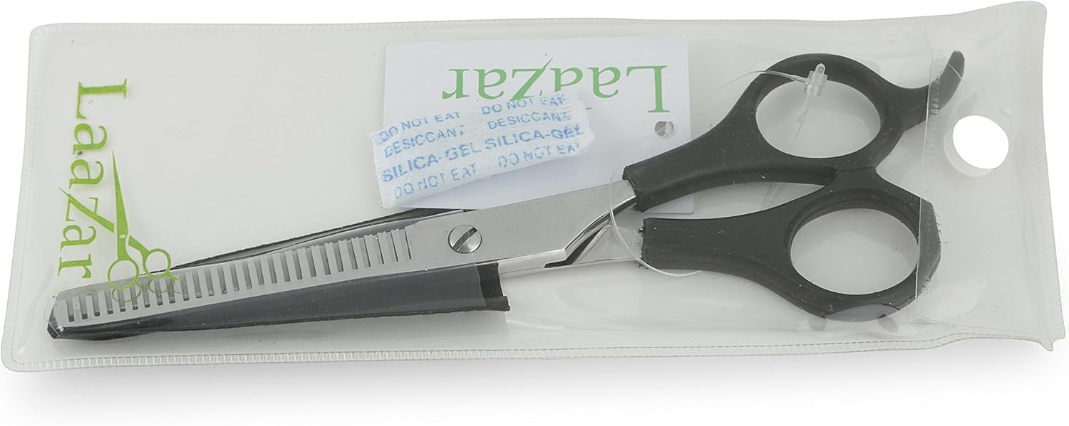 Laazar Brand specializes in quality blades for good price. This 6.5 42-T Pet Thinning Scissors has a plastic handle with attached finger rest for ease on your hands. Thinning Shears are essential with the thicker coated pet breeds. Use to ease mat and tangles and result a smoother thinner coat. Blade is of quality and sharpness for a great dog / cat groom or trim.