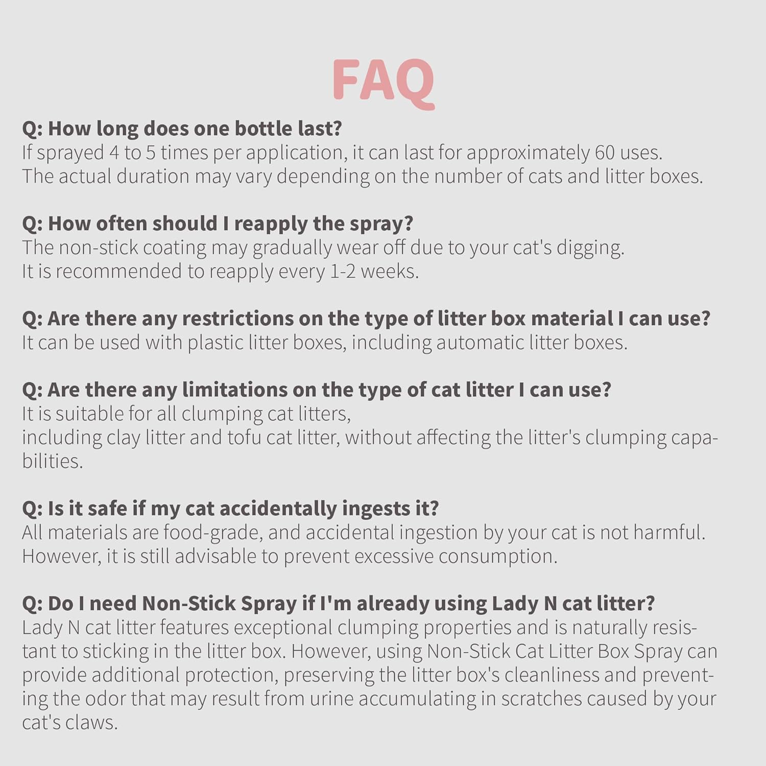 About this item Effortless Litter Maintenance: Say goodbye to the hassle of scraping and scrubbing. Lady N Non-Stick Spray creates a protective coating in just 4 easy steps, preventing litter from sticking to the bottom and sides of the box, and ensuring a quick and efficient clean-up. Innovative Clump Prevention: Our formula goes beyond ordinary sprays. The innovative coating stops clumps of litter and dirt from adhering to the box, making it a breeze to maintain a spotless, odor-free environment for your cat. Versatile Compatibility: Designed to work seamlessly with various cat litter and litter boxes, including automatic ones. For optimal results, pair it with Lady N Tofu cat litter, enhancing its effectiveness in creating a non-stick surface. Long-Lasting Solution: A single 6 fl oz bottle of Lady N Non-Stick Spray delivers over 60 applications, providing six months of worry-free maintenance for a household with two cat litter boxes. Enjoy a consistently clean space with fewer applications needed. Pet-Safe Assurance: Formulated with 100% food-grade ingredients, our spray is alcohol-free and safe for your feline companion. The protective film created is gentle on your cat's paws, ensuring a secure and hygienic litter box environment. › See more product details