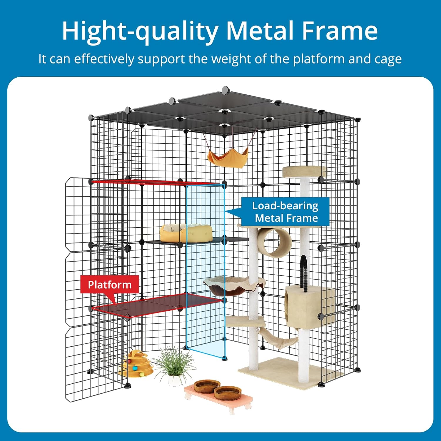 About this item 【Extra Large Exercise Place 】Size: 41"L x 41"W x 55“H.The cat crate is ideal for 1 to 4 cats.The Large Exercise Place can accommodate a lot of cat supplies,Spacious cat crate provides room for even the most energetic cat 【Multi-door design】We provide 8 cat doors. You can use these doors to interact with your pet, feed, clean the cat litter, and even enter the cage to play with the cat. 【DIY cage】 The panels we provide are enough to assemble a complete cat apartment,You can complete a satisfactory cat cage according to the different scenes and sizes in your own home. 【Safe Platform & Ramp】 Upgrading the bulkhead platform will not hurt the cat’s paws,The platforms connected by ramps allowing your small pets to climb and explore safely. 【Easy To Assemble】 Only one people, clear instructions with no added tools,. This cage can be disassembled for easy transport and compact storage › See more product details