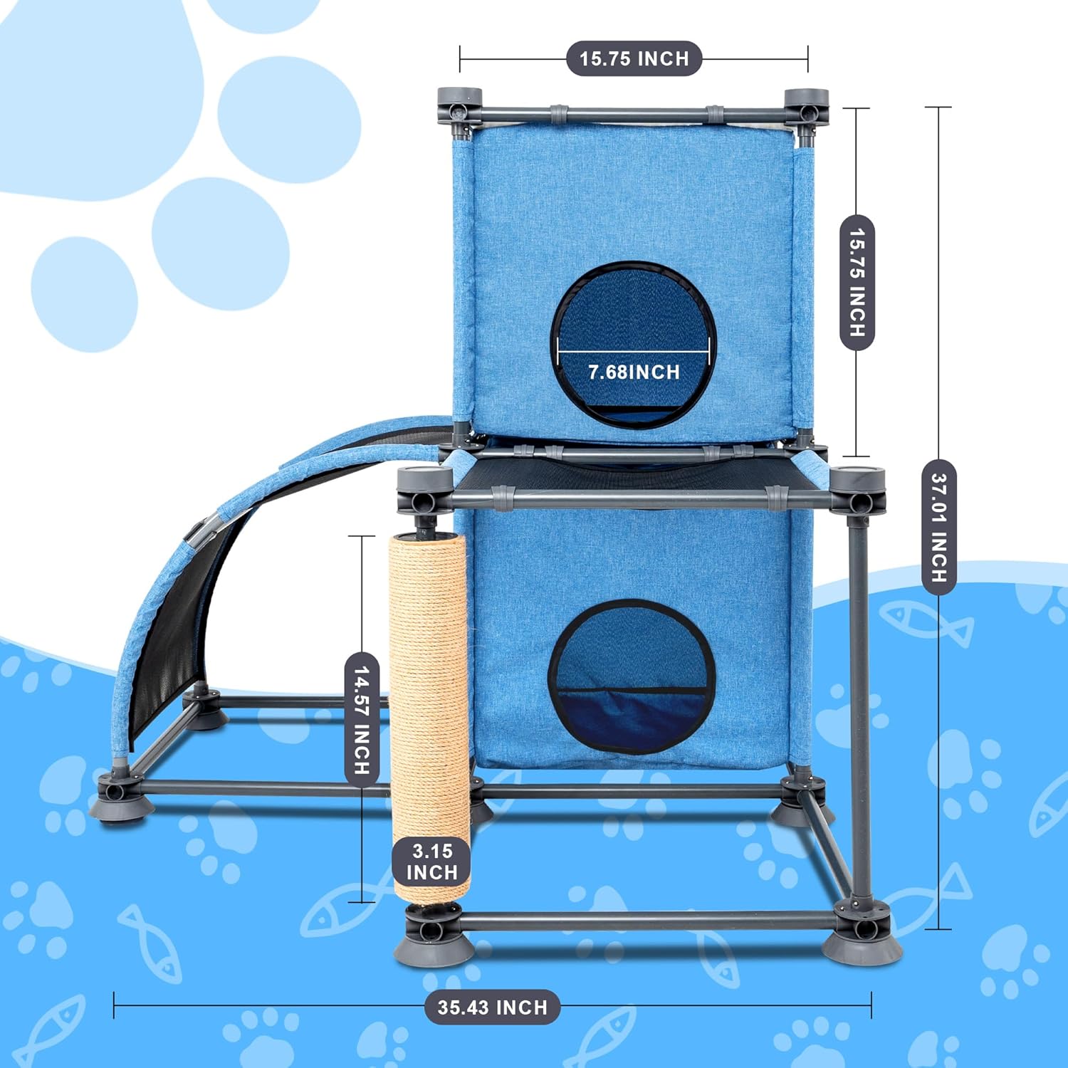 About this item Perfect for Play & Relaxation – This 2-tier cat house offers a compact yet spacious design, ideal for cats who love to climb, scratch, and nap. Multiple entry points encourage easy jumping and exploration, while the sturdy structure provides a secure space for rest and observation—great for both kittens and adult cats. Encourages Healthy Scratching Habits – The bottom of the cat house includes a scratching post and climbing ladder, helping encourage large cats to develop positive scratching behavior. Regular exercise keeps your small cat in good spirits and maintains good health, while protecting your valuable furniture from damage. Sturdy & Safe for Indoor Use – Designed with a strong PVC frame and lockable hexagonal connectors, this cat house ensures stability during playtime. The non-slip suction cup base prevents tipping, supporting up to 25lbs—perfect for energetic climbers. No tools needed for quick assembly! Private & Cozy Cat Hideaway/house – The top features a soft and comfortable bed, providing both warmth and safety, effectively easing your cat's anxiety during naps or observation. The second level offers a private space where your cat can freely groom or rest, feeling completely relaxed and secure. Additionally, a mesh hammock on the side ensures a cool and cozy spot for lounging. Durable & Easy to Clean – Scratch-resistant & wear-proof materials withstand daily use. Removable parts for quick cleaning, maintaining hygiene & comfort for your feline friend’s long-term enjoyment.If you have any other questions, you can also contact us at any time, and we will definitely give you a satisfactory answer. › See more product details