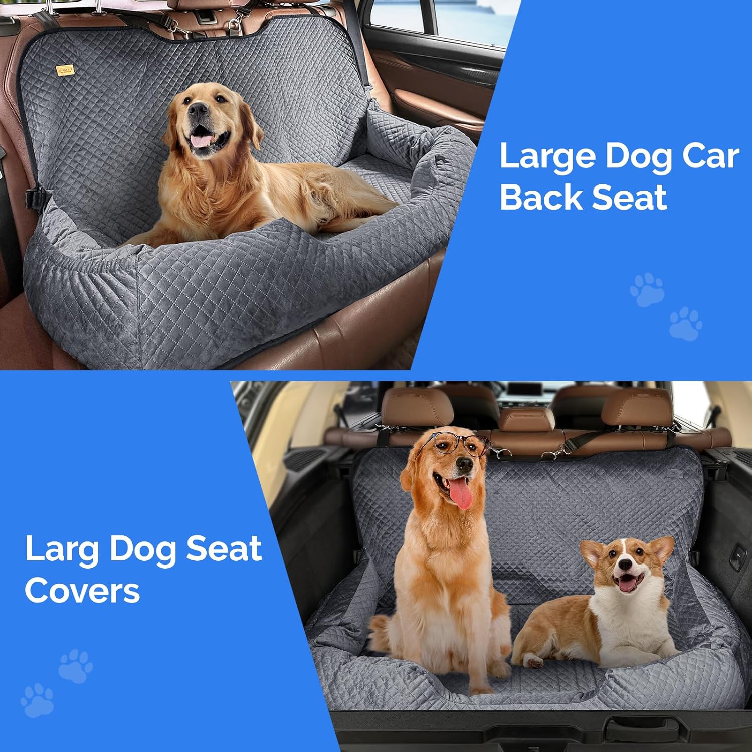 About this item BUY WITH CONFIDENCE: If you have any questions after buying the Kiusatig large dog car seat, please get in touch with us via Amazon. Thank you very much DOG CAR SEAT: Our large dog car seat is designed for large/medium dogs weighing up to 100 lbs or two small pets weighing under 35 lbs. It is compatible with various car types, including cars; SUVs; SPVS; trucks; and more SAFETY & COMFORT: Our dog bed for car back seat features two 4cm wide safety belts; super soft short plush fabric; high-density sponge; high-resilience PP cotton; and a non-slip bottom EASY TO CLEAN: Our dog seat is fully detachable, allowing you to easily remove the sponge and PP cotton by unzipping the cover. You can conveniently wash the dog seat cloth cover in your washing machine, making cleaning a breeze MULTIFUNCTIONAL USE: Our portable large dog car seat can be used on car back seats, as seat covers; dog sofas; or dog bed mats. It is suitable for dog carriers; travel products; and can be used in all-season › See more product details