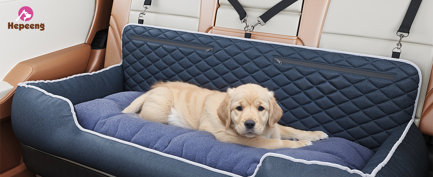 About this item Give your big buddy the space they deserve! Our extra-large dog car seat measures a roomy 47" L x 20" W, providing plenty of stretch-out room for a comfortable and secure ride. Super Large Dog Travel Bed: It is suitable for large/medium dog under 100 pounds. Suitable for almost all types of vehicles back seat-cars/trucks/SUVS. Storage bags on top of dog travel bed, you can storing pet toy/treats/leash. Easy to install: You can Quick to install and uninstall in car back seat,No-tool Install in a Few Mins,adjustable buckle design,Suitable for almost all types of vehicles back seat-cars,attach Free adjustable dog Safety Tethers,It can prevents pets interfering your driving safety. Washable: What if the dog car seat is dirty? Don't worry. This large dog car seat is very easy to clean, it is recommended to hand wash and then air dry. Protect Your Car Back seat: The pet car seat fabric is made of 900D Oxford Fabric,wear-resistant, bite-resistant and durable. Let your pet enjoy comfort and safety travel experience anytime and anywhere. it can protect your car back seat very well, don't worry about scratches the back seat by your pets. can also used be a dog bed in home. Compressed packaging: This pet car seat is packaged in vacuum compression, which may be a little wrinkled when first opened. After a day or two, it can be restored to the best condition. › See more product details