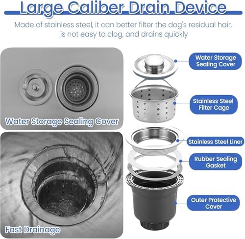Introducing our premium stainless steel dog washing station, designed to elevate your pet care routine. This one-piece unit boasts an easy installation process—simply attach the legs for a quick setup. Crafted from durable stainless steel, the rounded corners ensure safety, preventing any accidental harm to your furry friends. The thoughtfully designed dog tether ring keeps your pet secure during bathing, allowing you to wash them with peace of mind. Our effective stainless steel drainer efficiently filters out dog hair and debris, minimizing the risk of clogs and ensuring a smooth flow. Plus, the anti-slip mats provide a stable surface, helping your pet feel secure and preventing slips during bath time. With a left-opening door, your pets can enter and exit the washing station independently or with assistance, making it user-friendly for both you and your dog. The extendable faucet reaches up to 120 cm, ensuring no spot is left unwashed and enhancing your bathing experience. Included in the package are essential accessories: a removable drain strainer, drain pipe, dog leash ring, non-slip mats, waterproof board, and a stretch faucet, providing you with everything needed for an efficient dog grooming session. Whether you’re a professional groomer or a pet owner looking to simplify bath time, this dog washing station is designed to meet your needs. Experience the convenience and benefits of a dedicated washing area, transforming your grooming routine into a hassle-free experience. Elevate your pet care with our stainless steel dog washing station today!
