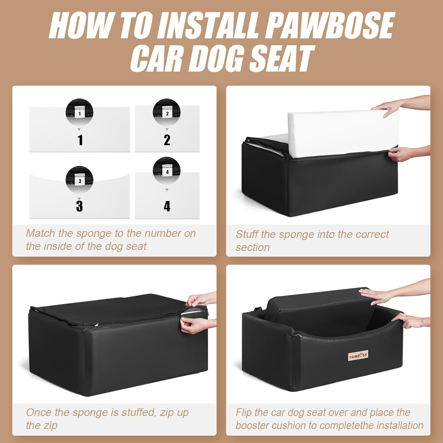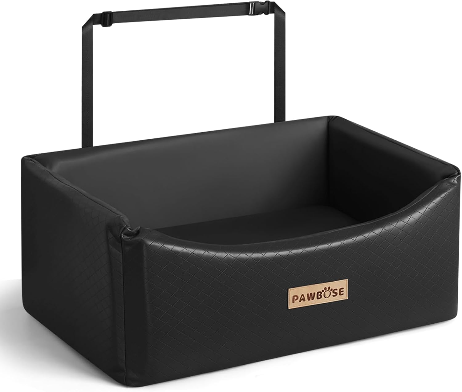 About this item Large Dog seats Size : PAWBOSE Dog car seat large sized 27.2'' (L) x 19.3'' (W) x 11.4'' (H), this dog car seat is suitable for large dog under 55 pounds or two small dogs under 20 pounds . It can be installed in the back seat of in a larger space in the trunk, such as in an SUV Premium and Comfortable :This dog car seat is made of high-density foam and high-quality leather fabric, which is beautiful and durable, and the leather look matches the car interior. In addition, this dog car seat can be secured with a car seat belt and headrest strap to prevent movement and protect your dog from car rides EASY TO INSTALL AND WASH : There are only two steps to install the dog booster seat: 1.Just pass the car seatbelt through the two holes on the bottom of the seat and adjust the seatbelt buckle to fasten it to the backseat of the car; 2.Just put the dog cat seat seatbelt over the headrest of the car and mediate it to the right length. If the seat is stained, simply wipe it clean with a damp towel to reduce your cleaning burden. Please remember that the inner foam is not washable MULTIFUNCTIONAL USE: The car dog seat is suitable for a variety of scenarios, in addition to being placed in the car to ensure the safety of your dog during travelling, you can also use it as a dog bed, dog sofa at home, outdoors or in a tent Travel Safely and Happily: Large Elevated dog car seat makes it easy for your dog to enjoy the view from the window, The bottom of the seat is designed with a granular non-slip design so that the seat will not change position randomly during driving,no more worrying about the safety of your puppy while driving.This Dog car travel bed is an ideal accessory for long trips with your furry friend › See more product details