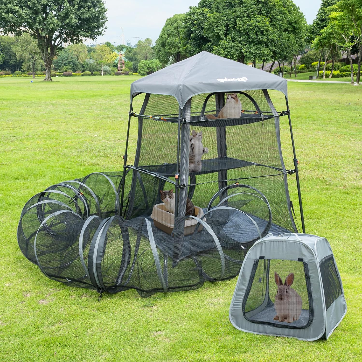 • IDEAL FOR MULTI CATS FAMILIESOffering ample room for your furry companions. 3 Tier Cat Tower tent with full expansion sizes of 41.34*41.34*57 inches is spacious enough for multi cats.18 inch large cat tunnel is suitable for big,medium and small cats or dogs. Trapezoid design cat playpen can better keep standing and give plenty of room for a litter box, bedding, and play space.