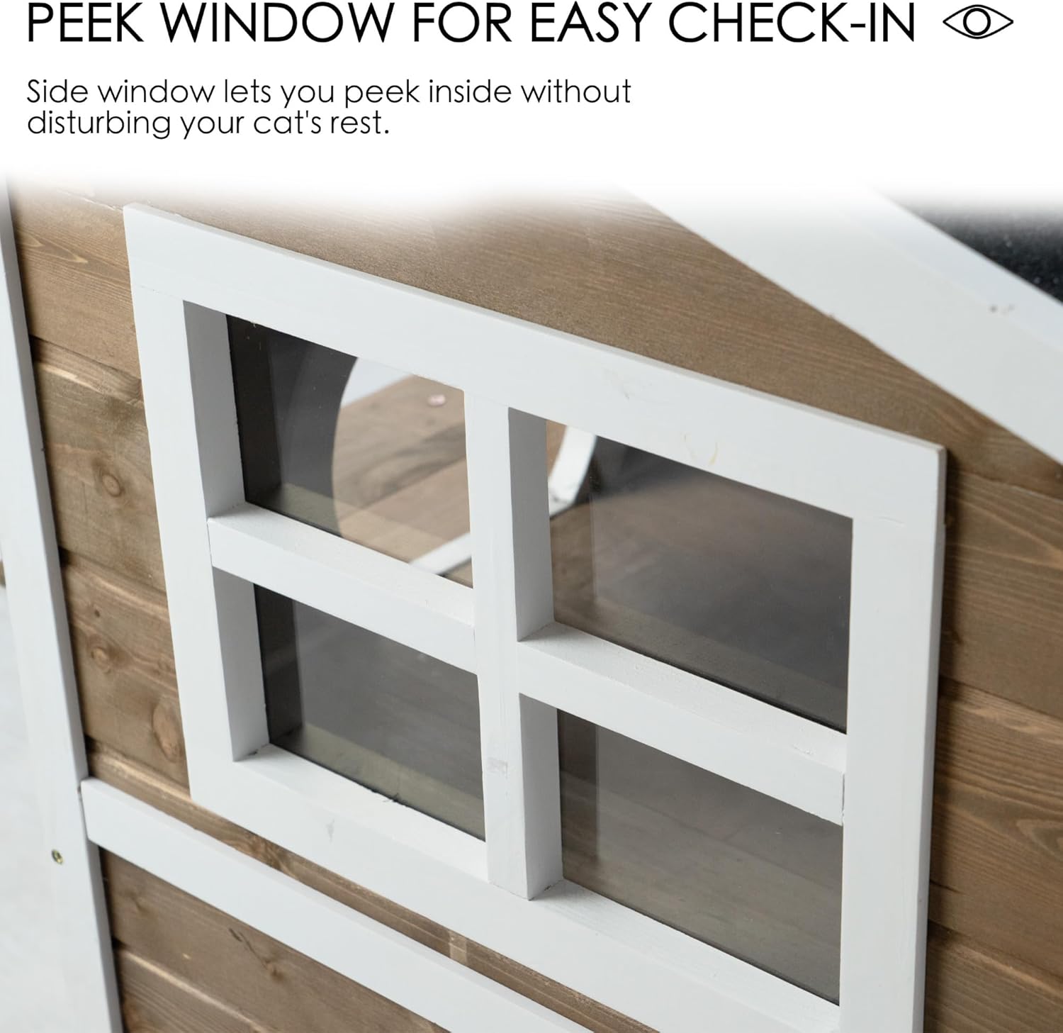 About this item WEATHERPROOF CONSTRUCTION: Built with weather-treated spruce wood and asphalt roofing material for lasting durability in outdoor conditions TWO-LEVEL DESIGN: Features a cozy lower hideout with cat-shaped entrance and an upper rest area, plus side balcony for sunbathing SPACIOUS DIMENSIONS: Measures 32 inches wide x 22.75 inches deep x 36 inches high, perfect for medium-sized cats to move comfortably ATTRACTIVE STYLING: Charming cottage design with decorative windows, white trim accents, and natural wood finish that complements outdoor spaces EASY MAINTENANCE: Elevated design keeps cats dry, while solid wood construction allows for simple cleaning and long-term outdoor use › See more product details