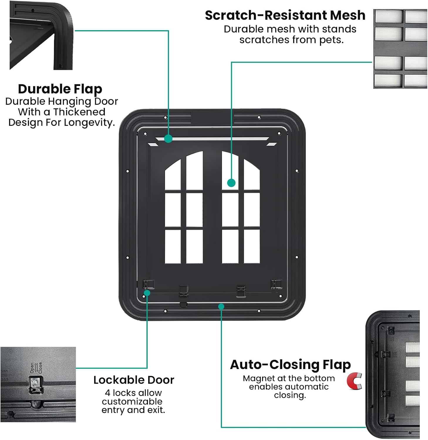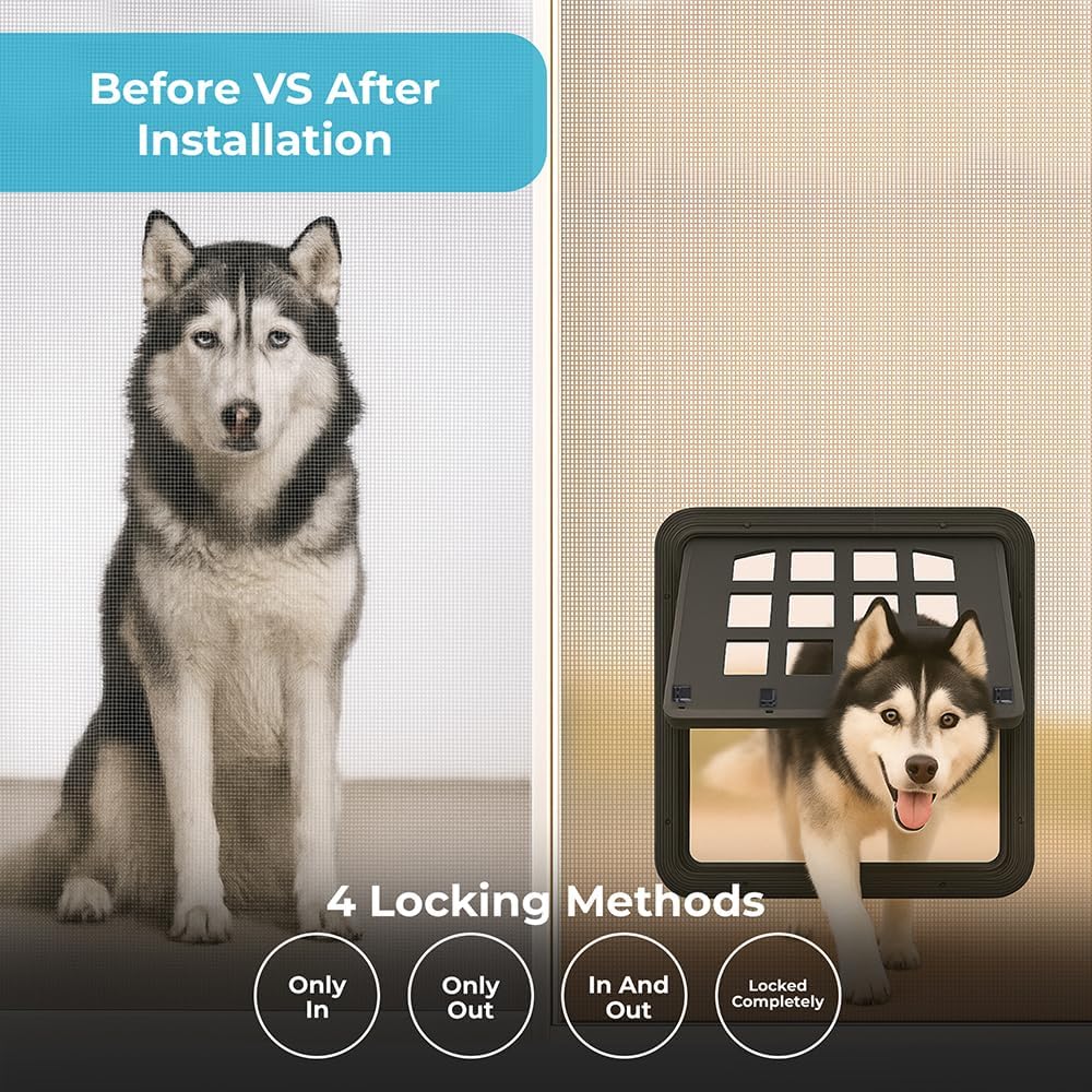 About this item DIMENSIONS: Large pet screen door measures 13.4 x 17.3 inches with a spacious flap opening, ideal for dogs and cats to move freely in and out MAGNETIC CLOSURE: Self-closing design with magnetic strips ensures the door stays securely shut when not in use, preventing insects from entering VERSATILE ACCESS: Features 4 entry ways allowing pets to enter and exit from multiple directions for maximum convenience EASY INSTALLATION: Designed to fit standard screen doors and windows, with a durable black frame that complements existing door frames DURABLE CONSTRUCTION: Heavy-duty mesh screen and reinforced frame withstand frequent use by active pets while maintaining structural integrity › See more product details