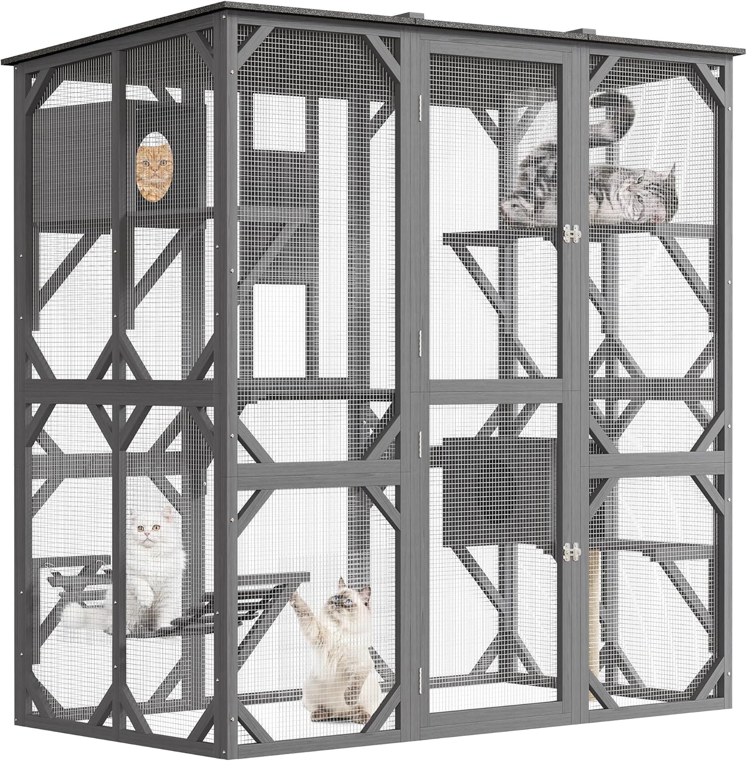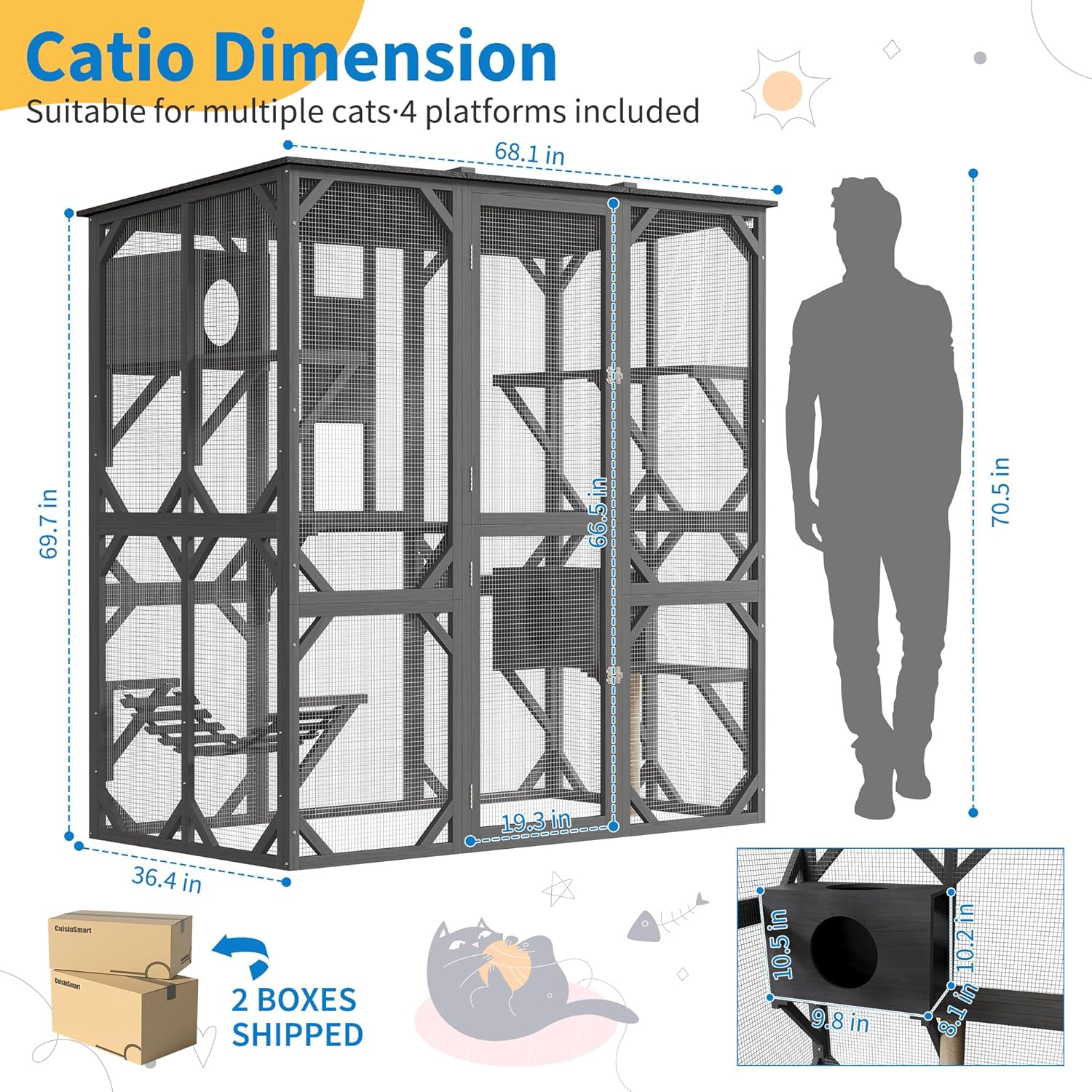 Transform your backyard into a cat paradise with the Extra Large Catio, featuring spacious napping houses, jumping platforms, and a weather-resistant design for safe outdoor fun!Highlights at a Glance:Spacious design for multiple cats to play and relax.Weather-resistant roof for safe outdoor enjoyment.Features napping houses, jumping platforms, and a hammock.Sturdy wood frame and durable metal wire construction.Easy walk-in access with a seamless connection to your home.Specification:Material: Wood+MetalDimension: 68.11x69.69x36.38 inchesPacking List:1xOutdoor Catio1xInstruction Manual1xAssembly KitThe Products is Divided into 2 Packages.Note:Before purchasing, please measure your available outdoor space to ensure the catio fits comfortably. Consider nearby structures and any potential obstructions to maximize the area for your cats.Please refer to the installation instructions provided. Make sure you have the necessary tools and assistance if needed, and allow enough time for setup.