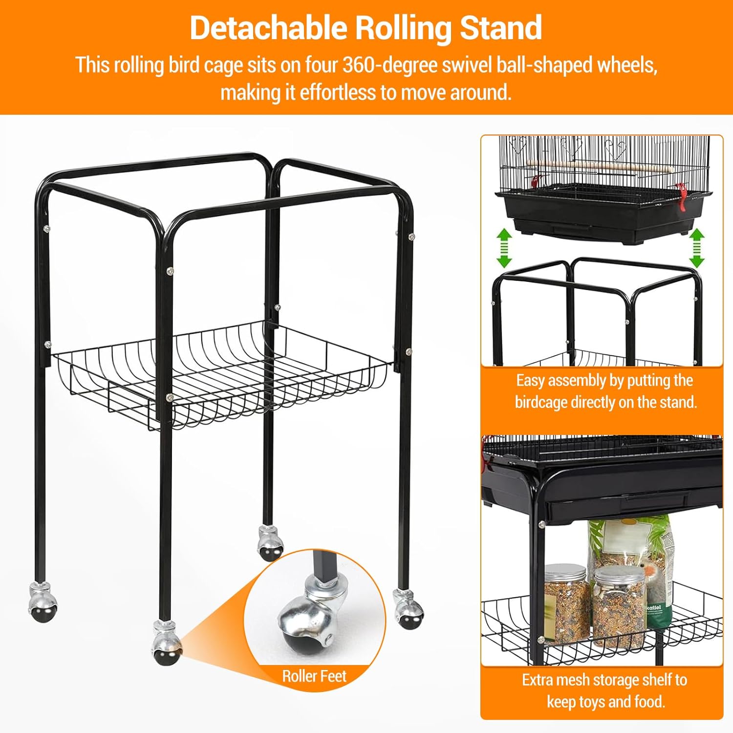 Spacious Open Top Bird Cage with Rolling Stand & AccessoriesGive your feathered companions the top home with this large, open-top bird cage. Designed for parakeets, cockatiels, conures, and small parrots, this bird cage combines generous space, interactive features, and user-friendly design to keep both pets and pet parents happy.Open-Top Design: Stimulate your birds with an interactive play top that can be kept open for perching or securely closed for safety and comfort.Rolling Stand & Storage: Move the bird cage easily around your home with four 360° swivel wheels. The detachable rolling stand includes a convenient storage shelf for organizing bird food, cleaning tools, and accessories.Secure & Durable: Sturdy carbon steel construction with secure bar spacing ensures your birds are safe at all times. Locking doors provide added security, giving you reliable.Easy Cleaning: Features a removable tray and multiple feeding doors for effortless cleaning and hassle-free seed and water refilling. The bottom baffle keeps your birds away from waste, promoting a healthy environment.Versatile Use: The upper cage can be used separately from the stand, ideal for flexible placement at home, in pet stores, or even as a decorative piece.All-Inclusive Accessories: Includes 4 feeding bowls, 3 wooden perches, and an easy-to-follow assembly guide. Dimensions: 17.72" x 13.78" x 65.55". Made from high-quality metal in a stylish black finish.