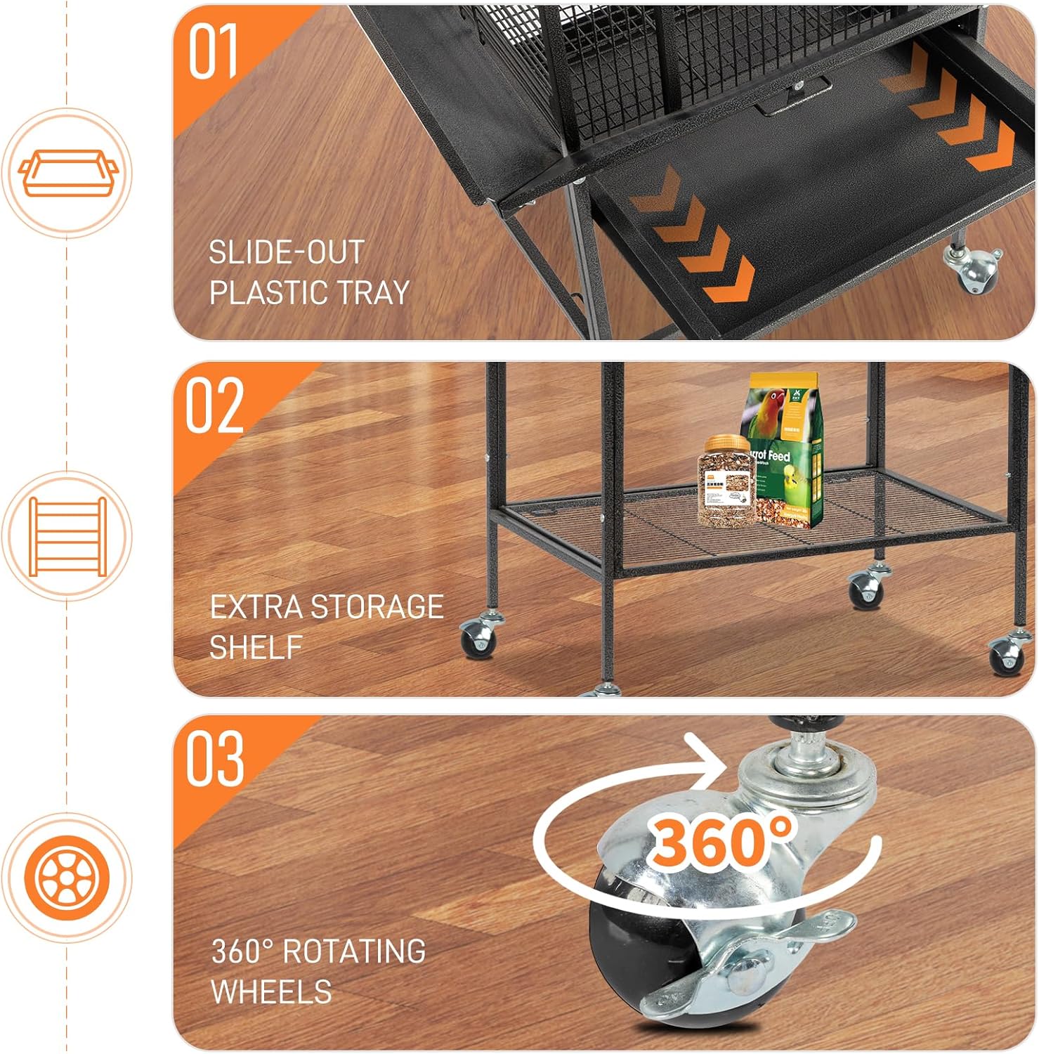 Give your feathered companions a safe, engaging, and thoughtfully designed living space with this premium wrought iron bird cage. Crafted for comfort and functionality, it features a spacious interior layout that supports natural movement, perching, and social interaction—ideal for parrots, cockatiels, lovebirds, and other medium-sized avian pets. The elevated play top includes a sturdy ladder, smooth wooden perch, and dual stainless steel feeding bowls—encouraging physical activity and mental stimulation without overcrowding. Thoughtful details like wide front access doors and rounded corner bars help reduce stress and support gentle handling during daily care routines. Cleaning is simplified with two removable slide-out trays and a built-in seed guard to contain feed scatter, while the durable rust-resistant finish maintains structural integrity through regular use. Smooth-rolling casters allow easy repositioning across different rooms or outdoor shaded areas—perfect for homes, apartments, or pet-friendly spaces. Designed with bird safety in mind, all materials meet standard pet product guidelines: non-toxic finishes, secure latches, and tightly spaced bar gaps prevent accidental escapes or injuries. Assembly is straightforward with included hardware and clear instructions—no special tools required.