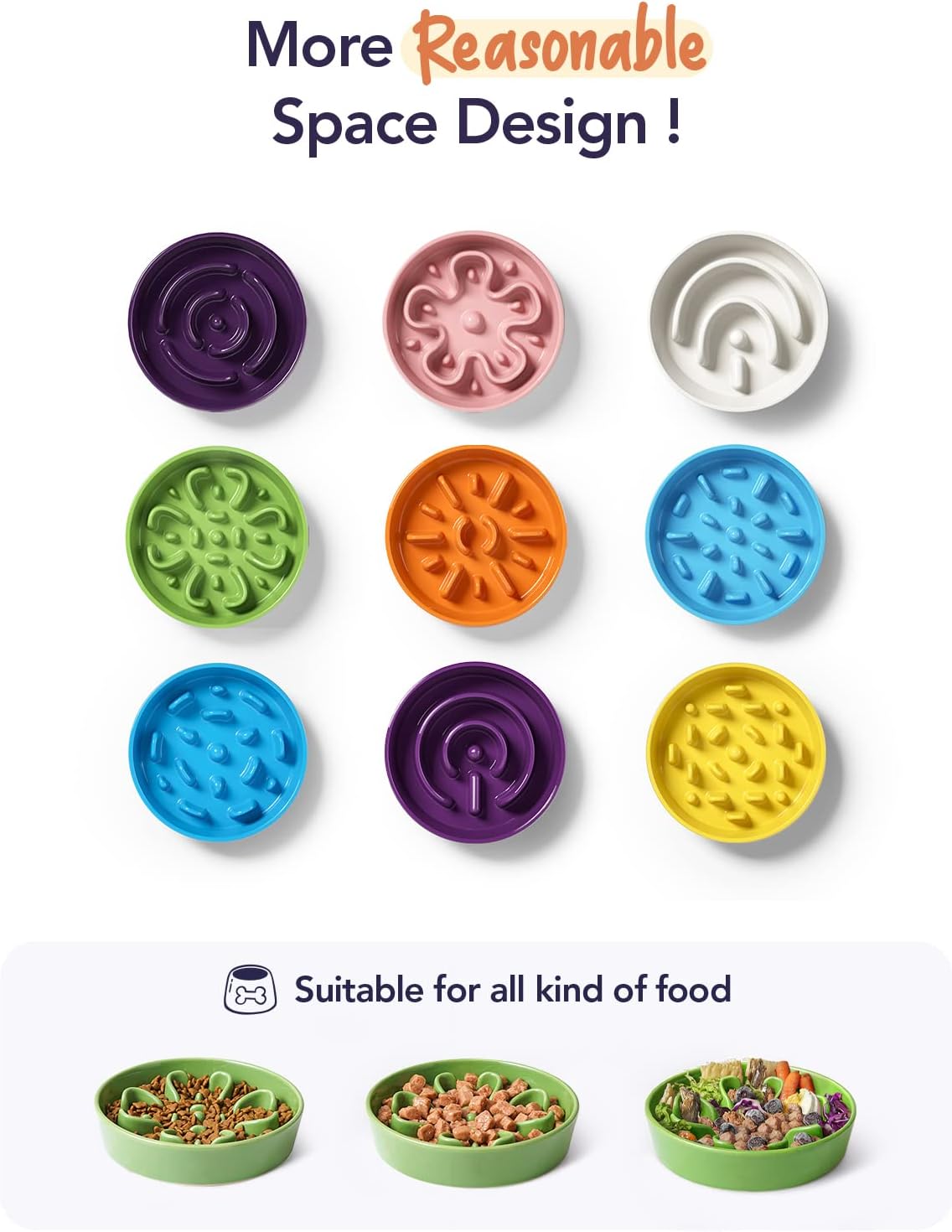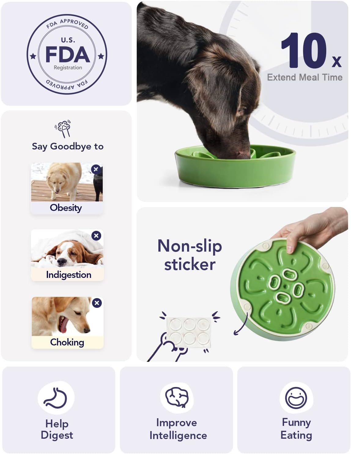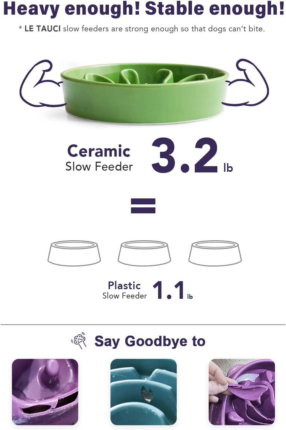 About this item Ceramic Material, More Suit For Your Dog: The veterinarian recommends using a ceramic bowl for your dogs. According to investigations, plastic bowls are easy to cause black jaws, and they are easily damaged by dogs, they will bite and eat by mistake. If you love your dog, our ceramic slow food bowl will be your best choice. These dog feeder bowls are made from ceramic. Microwave safe, you can heat your dog's food at any time Premium Ceramic, Durable and Stable: We use premium ceramic, not easy to damage, and it is sturdy and heavy enough to be more stable. However, if your dog is using a slow feeder bowl for the first time, we recommend starting with a silicone bowl to help them get used to it. Easy Clean, Save More Time: The surface is smooth and very easy to clean. Whether you put it under the faucet for rinsing or in the dishwasher, it will save more of your time on cleaning and go and spend it with your furry friends Non-slip, Say Goodbye To The Messy Floor: These ceramic dog bowls are heavy enough(about 1.45kg) and non-slip base so that the dog cannot move easily while eating. Whether your dog has a diet of dry, wet, or raw food, these non-slip bowls will do the trick Slow Down Eating, Bring Dog A Healthy Diet: Fast-eating dogs experience bloat, regurgitation, and obesity easily. Our slow feeder dog bowl design with the ridges and maze pattern helps your dog to eat slower than 10 times. Your dog could change his overeating behavior through a challenge and fun mealtime › See more product details
