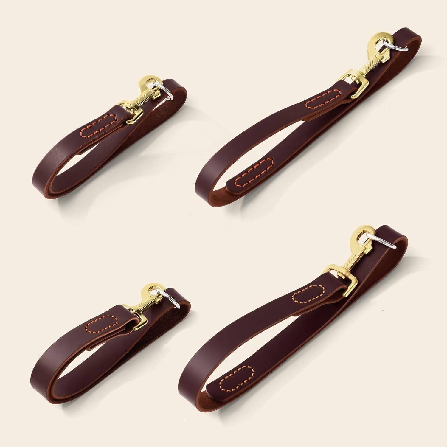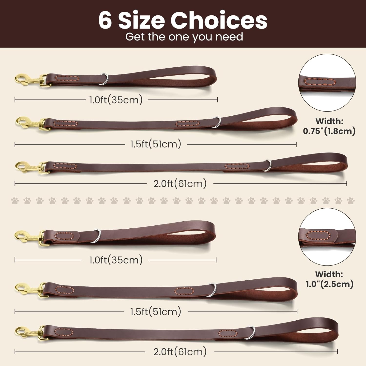 Welcome to HONGSAGE shop Type: Dog Short Leash / Dog Training Leash / Dog Traffic Leash / Leather Short Dog Lead Size: Width: 0.75"(1.8cm) Length: 1.0ft , 1.5ft & 2.0ft Width: 1.0"(2.5cm) Length: 1.0ft , 1.5ft & 2.0ft Material(Colour): Leather Handle(Brown) + 304 S/S O ring (Silvery) + Metal 360°Rotating Clasp (Golden) Features: 6 Sizes for All Breeds 100% genuine leather 360° rotation clasp, no tangle Lightweight design, easy to carry Heavy-Duty Metal Hook, ultra-strong Perfect length for service dog handlers Metal O ring for attachment of poop bag Keeps dog right by your side at crowded area Traffic Leather Dog Leash Perfect for Walking and Training
