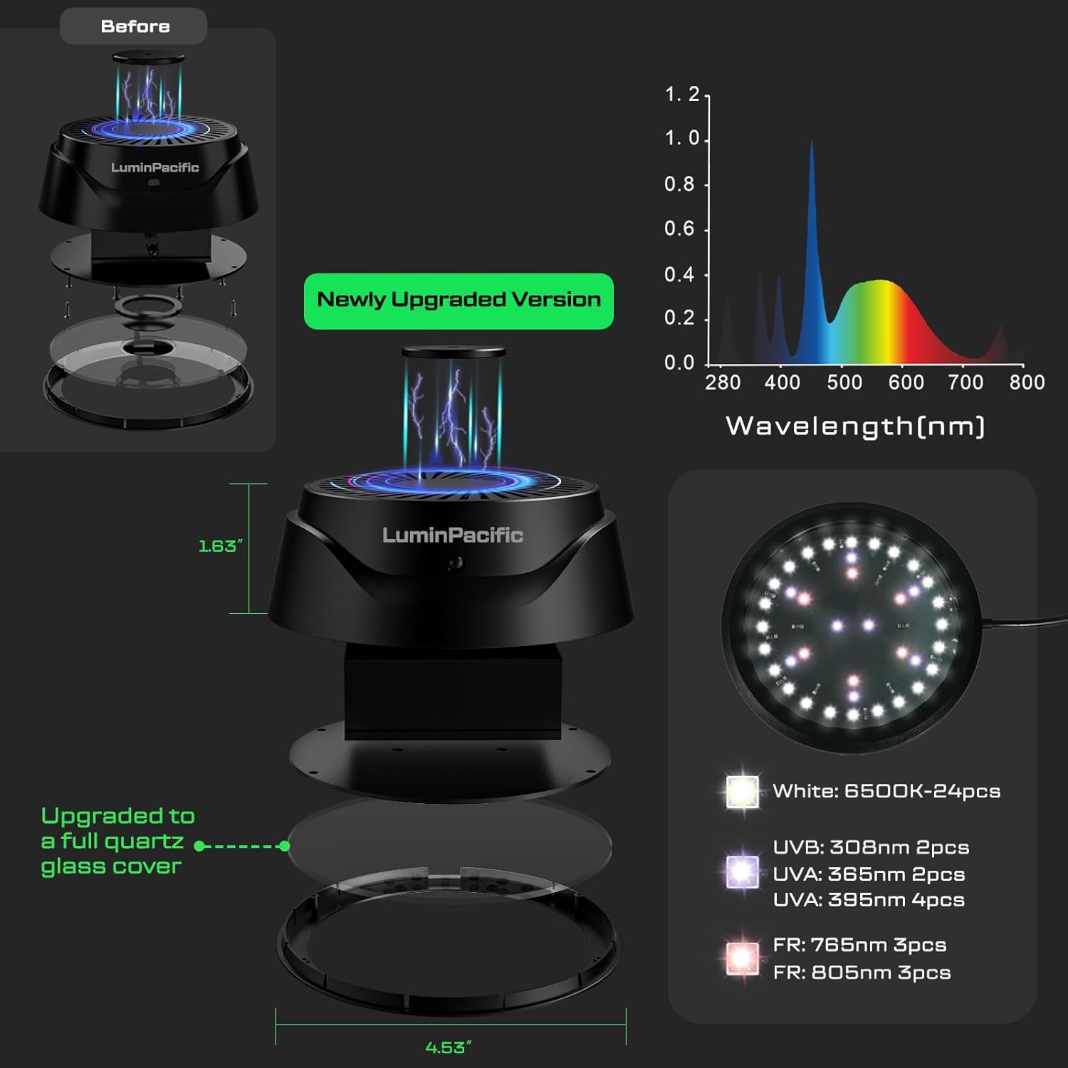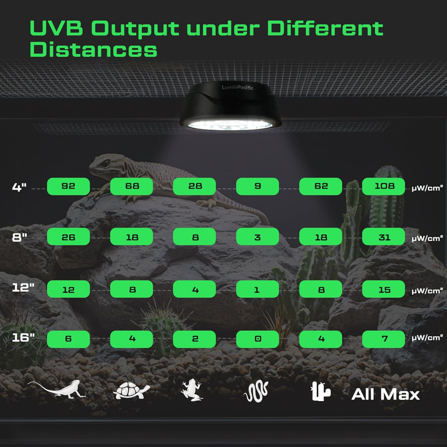 - Included Components: Power Supply, Remote Control, UV Sensor Card, UVB light, User Manual