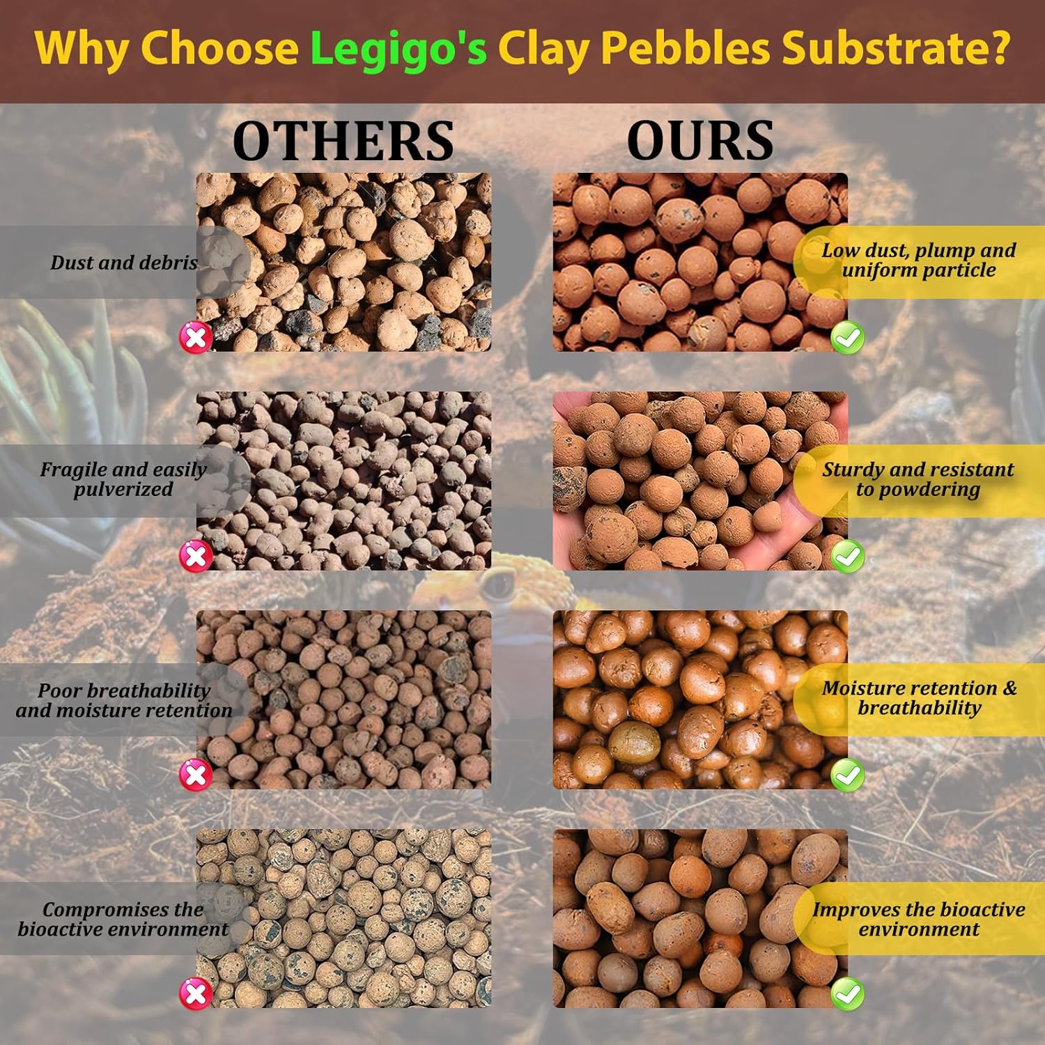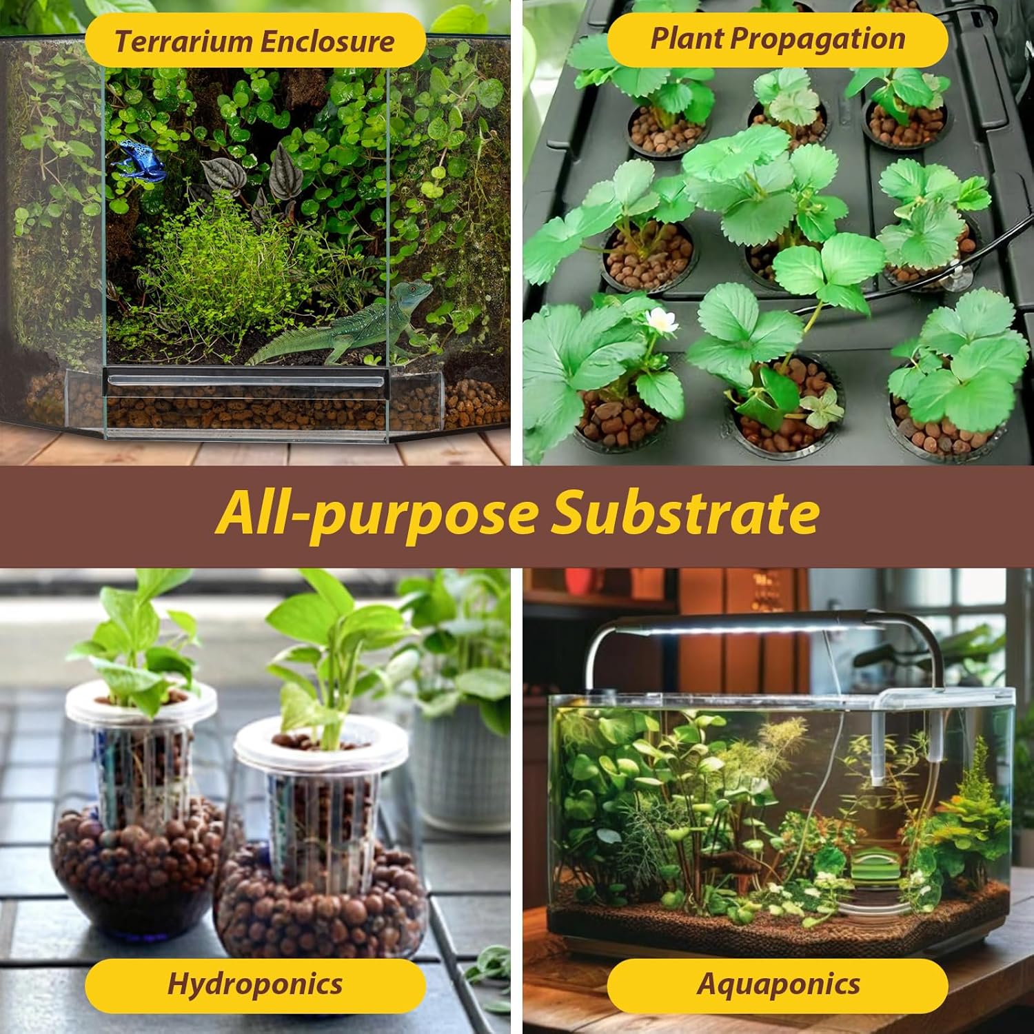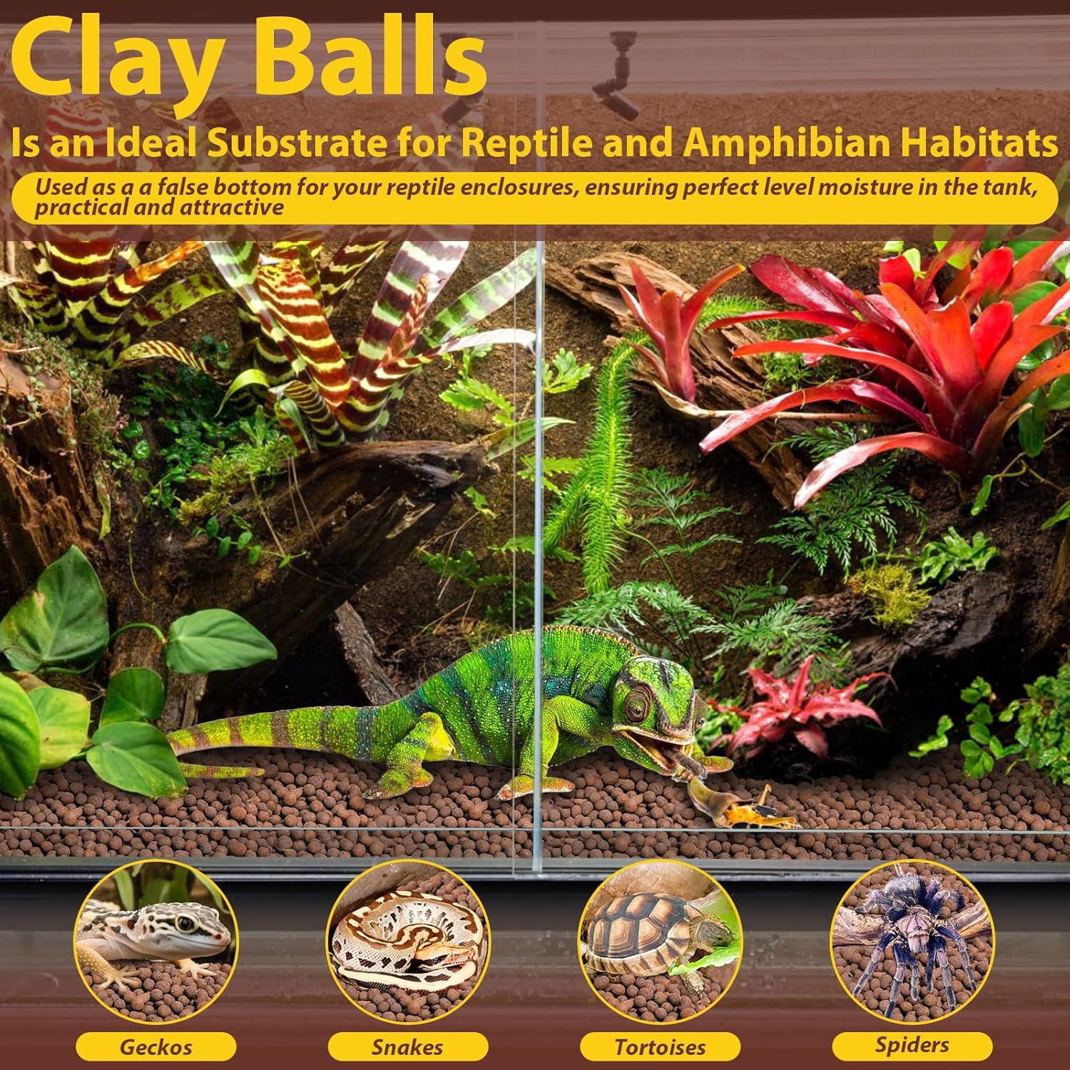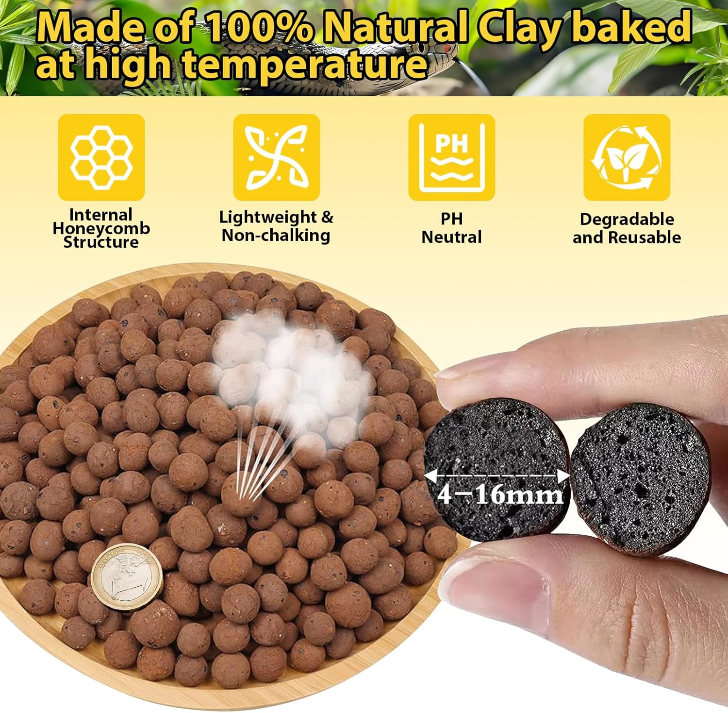Excellent Drainage & Moisture Control: You will receive 4 lbs of expanded clay balls (4-16mm in diameter); Their superior drainage and aeration make them ideal for the drainage layer in bioactive terrariums, perfectly balancing humidity levels; These clay pebbles also can be used as base for substrates such as moss or coco coir to create a healthier and natural habitat for reptiles and amphibians 100% Natural Clay Material: Our reptile substrate is made from 100% natural clay expanded and fired at high temperatures, forming lightweight, hard, and porous granules; pH-neutral, low-dust, and resistant to crumbling, these LECA balls maintain structural stability without disintegrating when wet, providing a stable and safe bedding for your reptile terrarium or bioactive tank Bioactive Tank Setup: These lightweight leca balls create a false bottom for your vivarium, when moistened, they form a natural water reservoir that slowly releases moisture to maintain stable humidity; The porous structure helps absorb odors and reptile waste, keeping the habitat clean and fresh; It also provides excellent root support and airflow for live plants, draining excess water to prevent root rot, perfect for autospray rearing chambers with live plants Easy to Use and Store: Rinse the hydro balls 2-3 times under running water before use to remove surface dust; They can be used directly as a substrate (2-3 inch) in aquariums or as a hydroponic medium; After use, simply wash and air-dry for reuse, they maintain excellent drainage, aeration, and support even after multiple cycles, making them a long-lasting, sustainable substrate; Packed in high-quality resealable foil bags to keep them dry and easy to store for long-term use Wide Applications: These natural clay pellets are an ideal substrate for plants or reptile enclosures, meeting all your bioactive terrarium needs; They also improve soil aeration during propagation and rooting for plants, preventing rot caused by overwatering; Ideal for hydroponic gardening and aquaponics setups; They are an absolute must-have for reptile keepers and hydroponic gardeners › See more product details